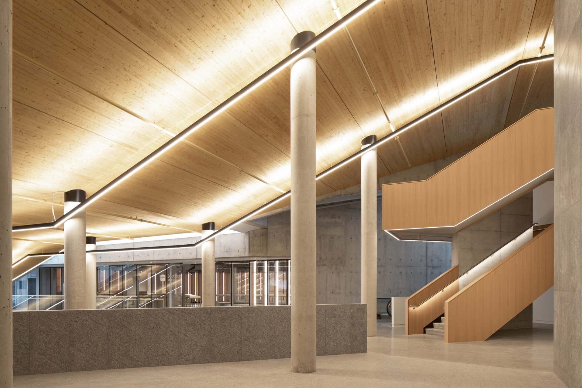 The arrival experience can be understood as a green sequence where a new public square and sacred garden stretch across the slope, designed as a series of terraces and green roofs that follow the mountain’s natural contours. Native plantings soften the lines between built and natural space. The gabion walls that frame the garden are filled with rocks excavated from the site itself on the mountain, a gesture of respect for the land and a contemporary take on Quebec’s stonework traditions.