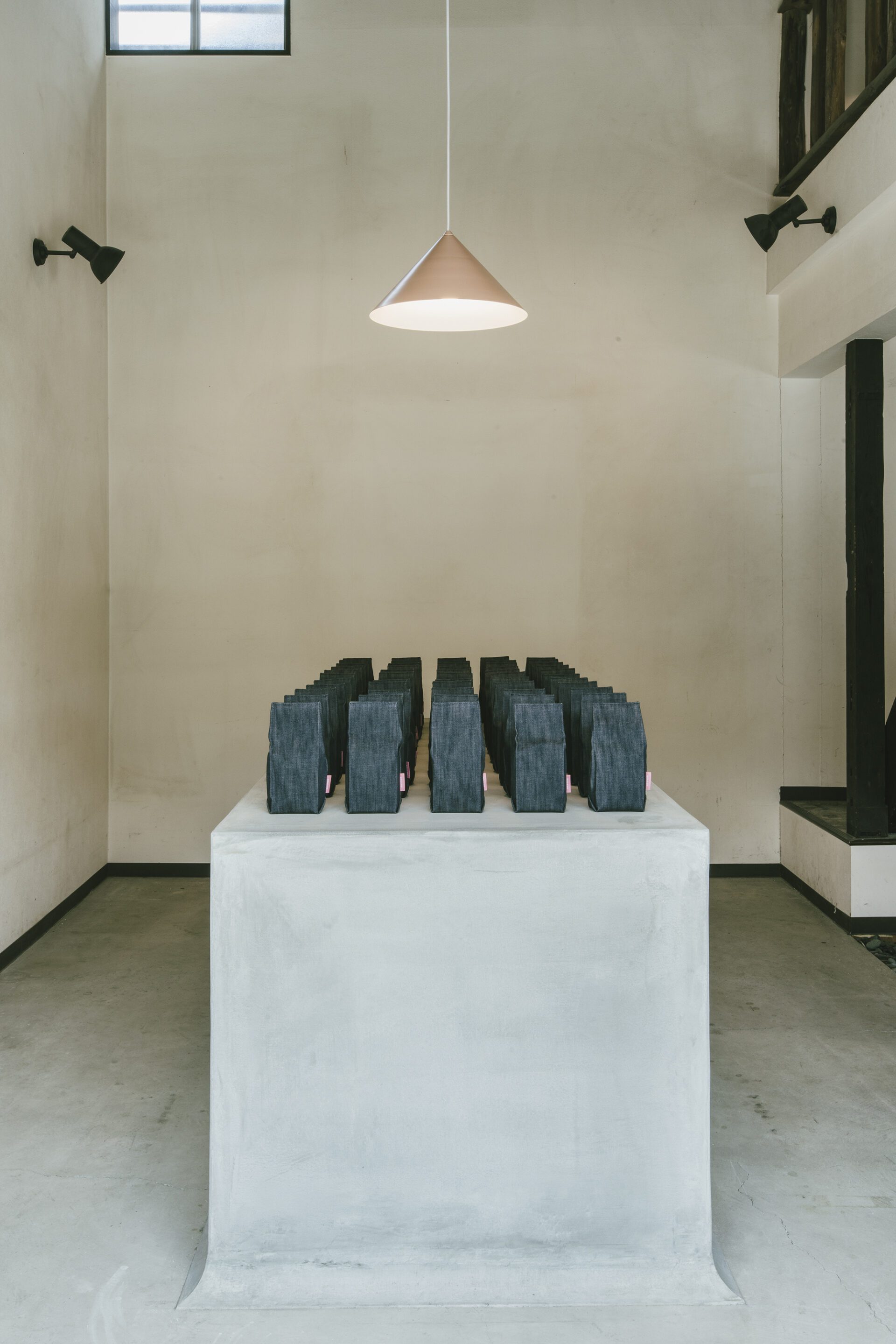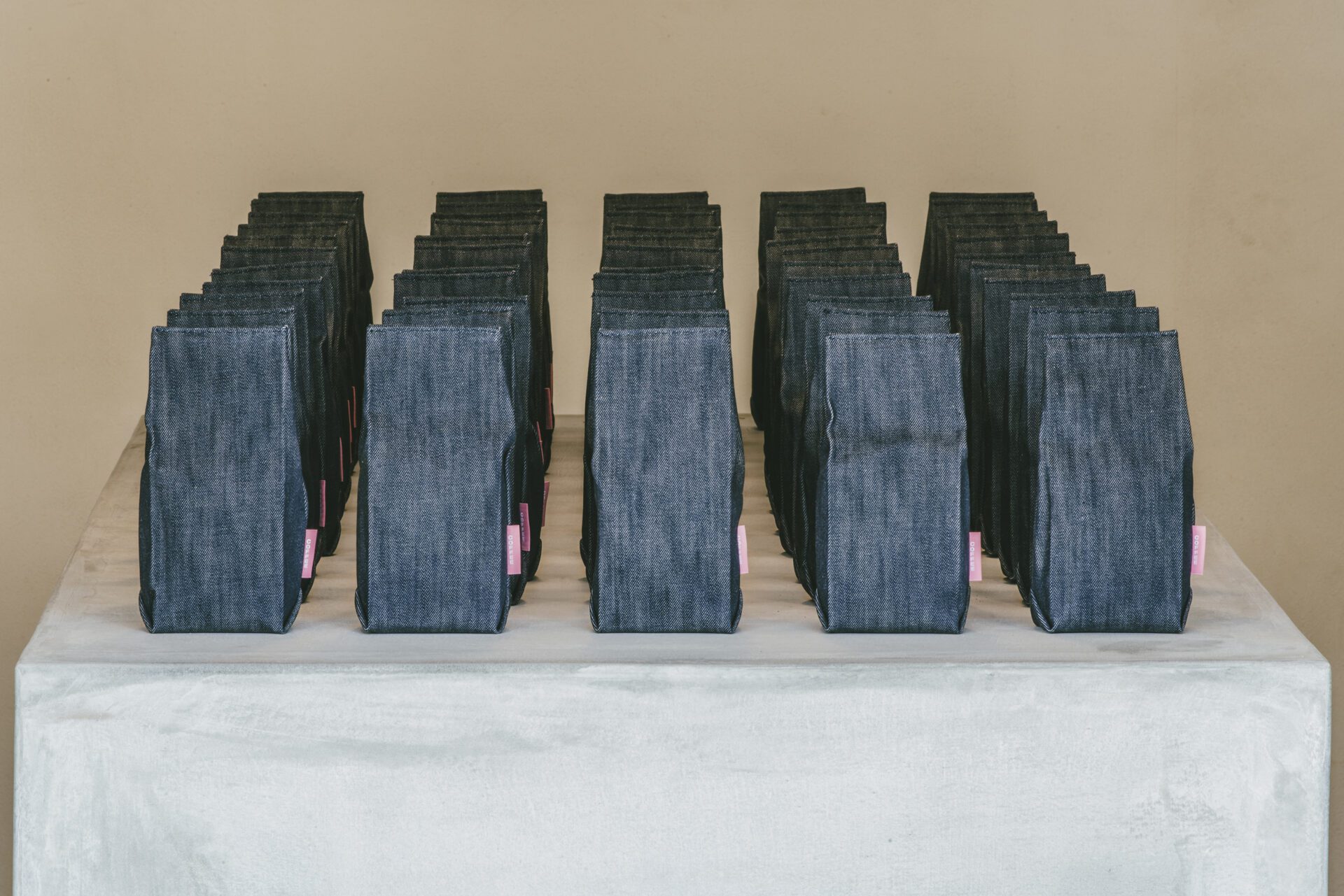 A gallery area bathed in gentle natural light displays coffee beans packaged in denim, symbolizing the store’s identity. This carefully curated environment removes visual noise to create a space where both newcomers to Kojima denim and passionate fans can appreciate the fabric intimately.