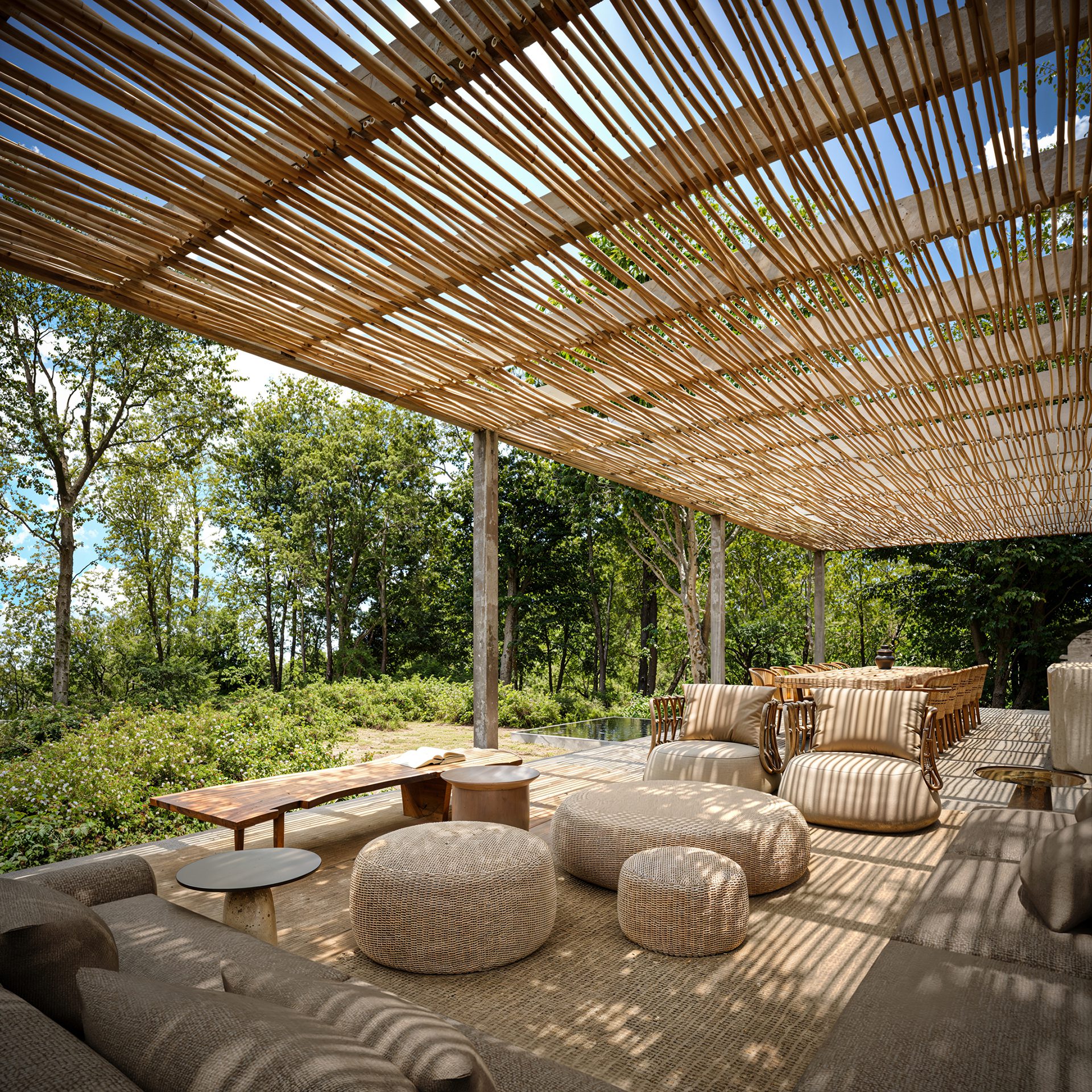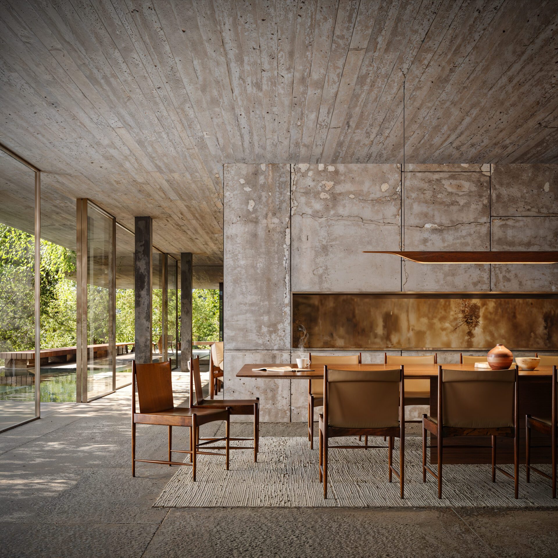 The inspiration was to create a peaceful, welcoming refuge for the client and his close circle of friends and family—used for rest, reconnection, and creativity. The house is a personal retreat that combines raw natural materials with ultra-high-end comfort. It should feel timeless, solid, and adaptable, with a potential nod to Mexican Brutalism, while still maintaining warmth and intimacy. The architectural narrative is driven by the desire to host, relax, and be immersed in nature—with open windows, breezes, and shifting light contributing to a calm, sensory-rich atmosphere that blends seamlessly with the surrounding landscape.