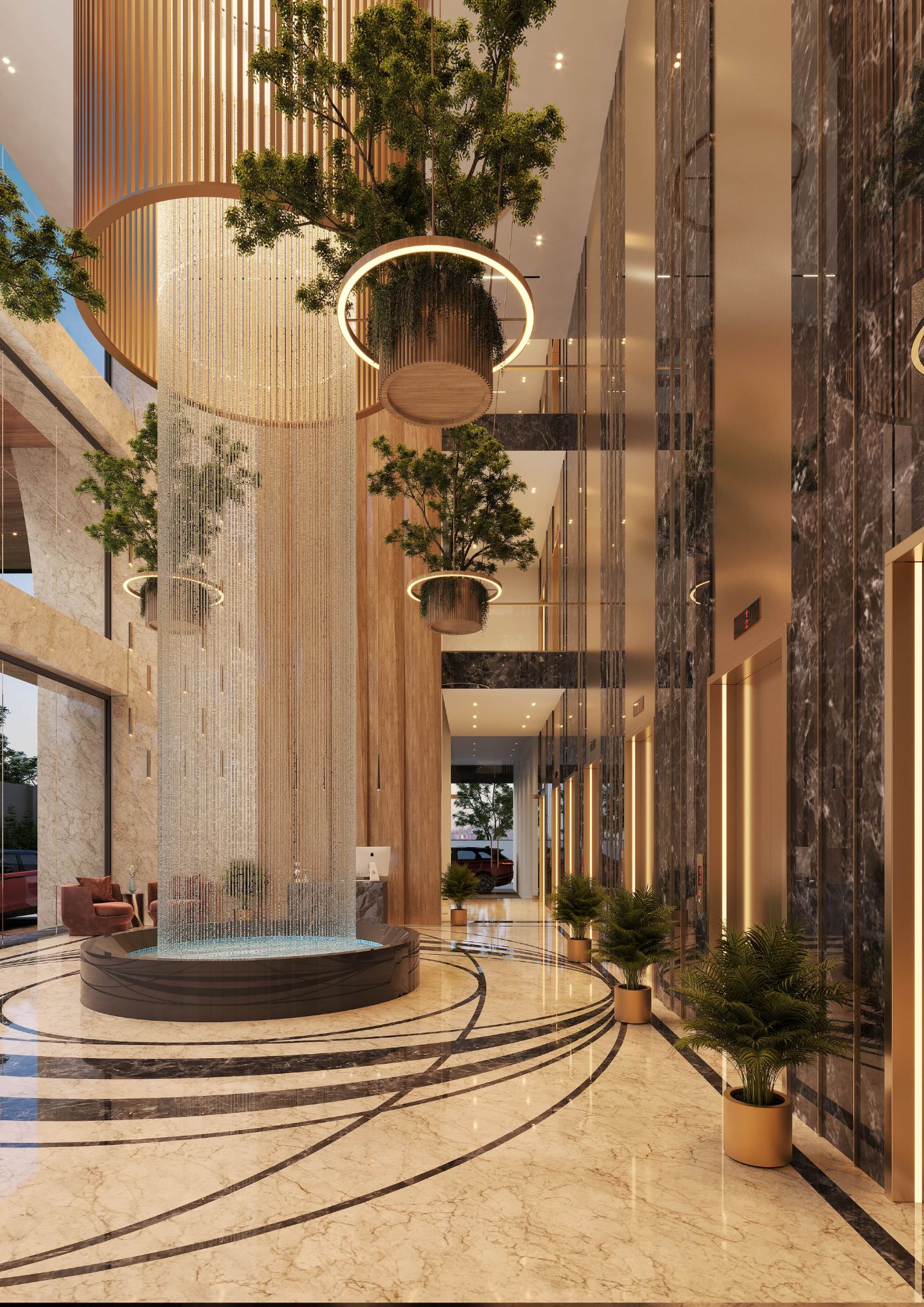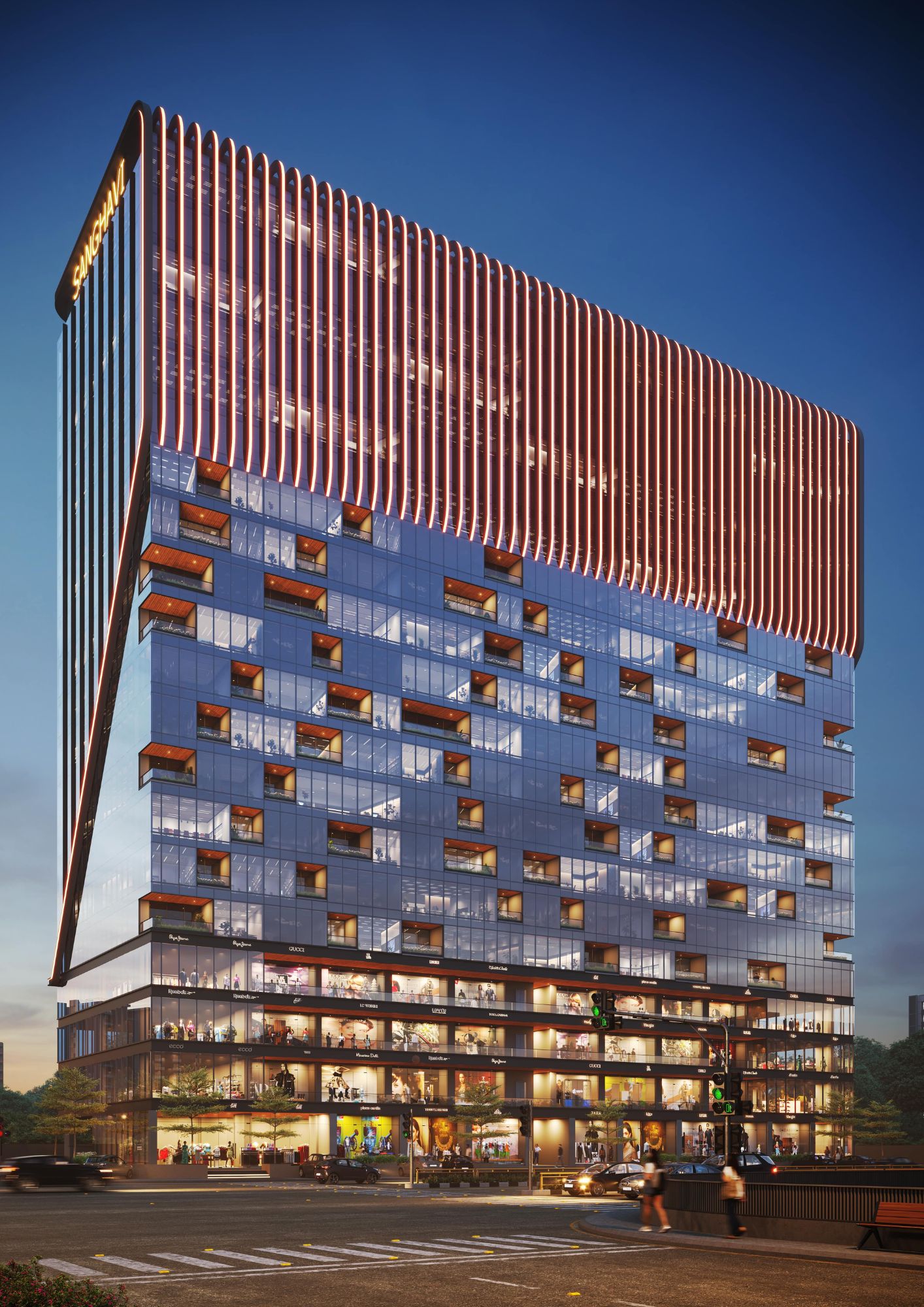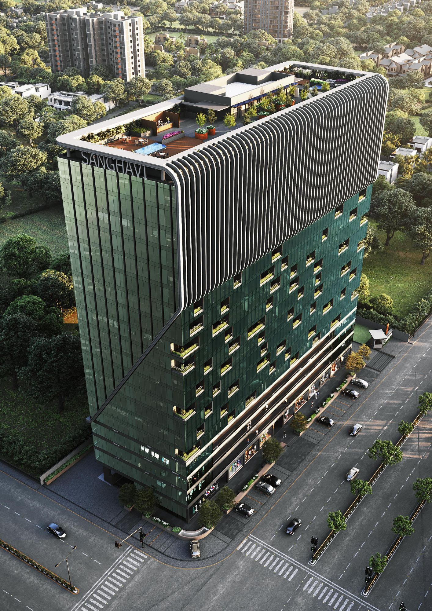 We aim to transform Ahmedabad’s landscape by creating a multifunctional landmark that enhances both its urban and social fabric. The project maximizes retail exposure through strategic site planning, fosters a collaborative workspace for businesses, and offers amenities that promote work-life balance. The tower is to be divided into three distinct sections. The structure boasts a triple-height lobby with a stunning 40-ft-tall indoor waterfall, the first of its kind in India, along with levitating forest greens. A four-storey base integrates retail into the urban environment, ensuring high visibility and footfall.