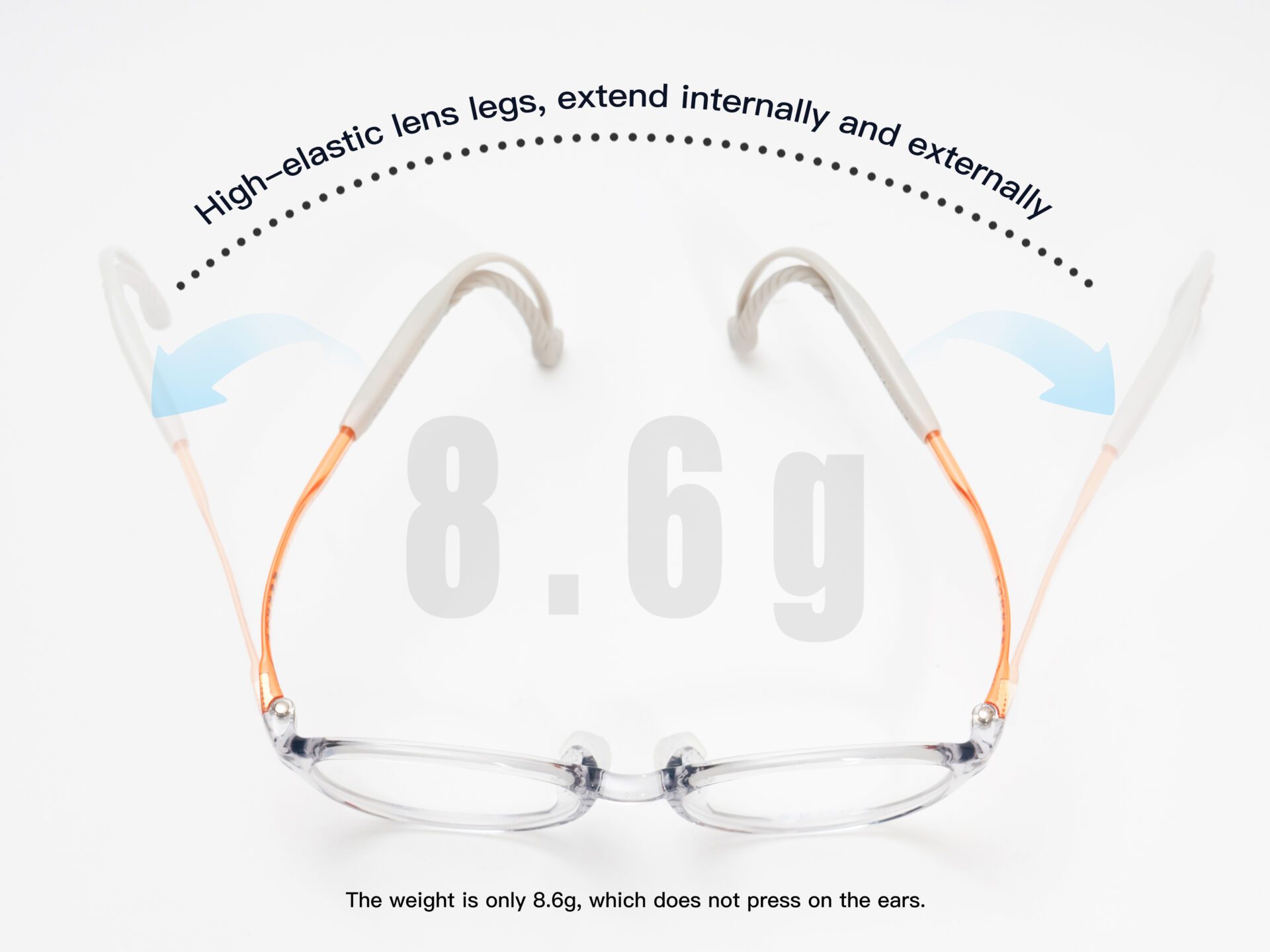 The front half of the temples adopts an ergonomic micro-curved design to avoid pressure on the temple area. The material is a composite with high elasticity, excellent toughness, and structural strength, balancing durability with flexible adaptability.