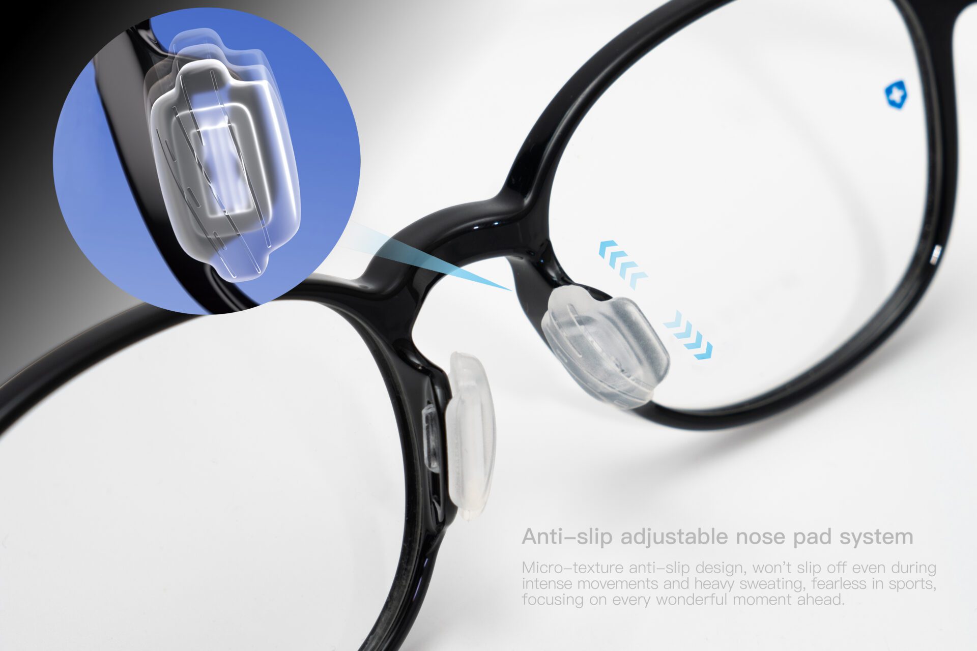 The nose pads on both sides are made of skin-friendly micro-textured silicone and feature a widened design to effectively distribute pressure on the bridge of the nose, enhancing comfort. Their inner surfaces are treated with micron-level textured patterns to increase friction with the skin while reducing oil absorption, improving slip resistance. Additionally, the nose pads incorporate a micro-channel structure to guide sweat away smoothly during physical activity, preventing sweat accumulation, reducing discomfort, and minimizing the risk of frame displacement due to frequent wiping, further ensuring wearing stability and user experience.