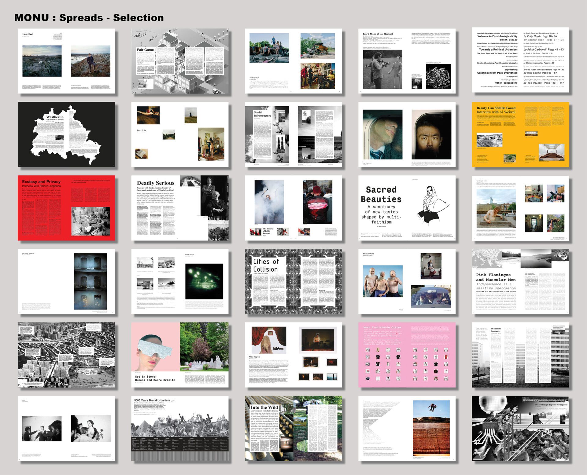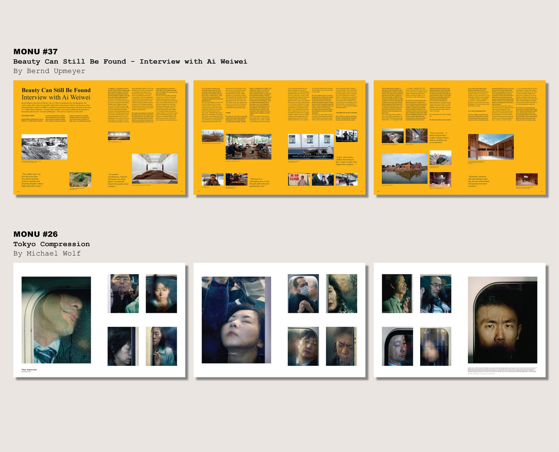MONU’s layout has been special due to its diverse appearance since the beginning. The diverse use of typography can already be seen in its table of contents spread foreshadowing the fonts of the articles. Characteristically every article has a different design, uses a different font and has a significantly different style. Some of MONU´s signature layouts include the scattered images, text boxes on background images, and the 3 column black-and-white articles.