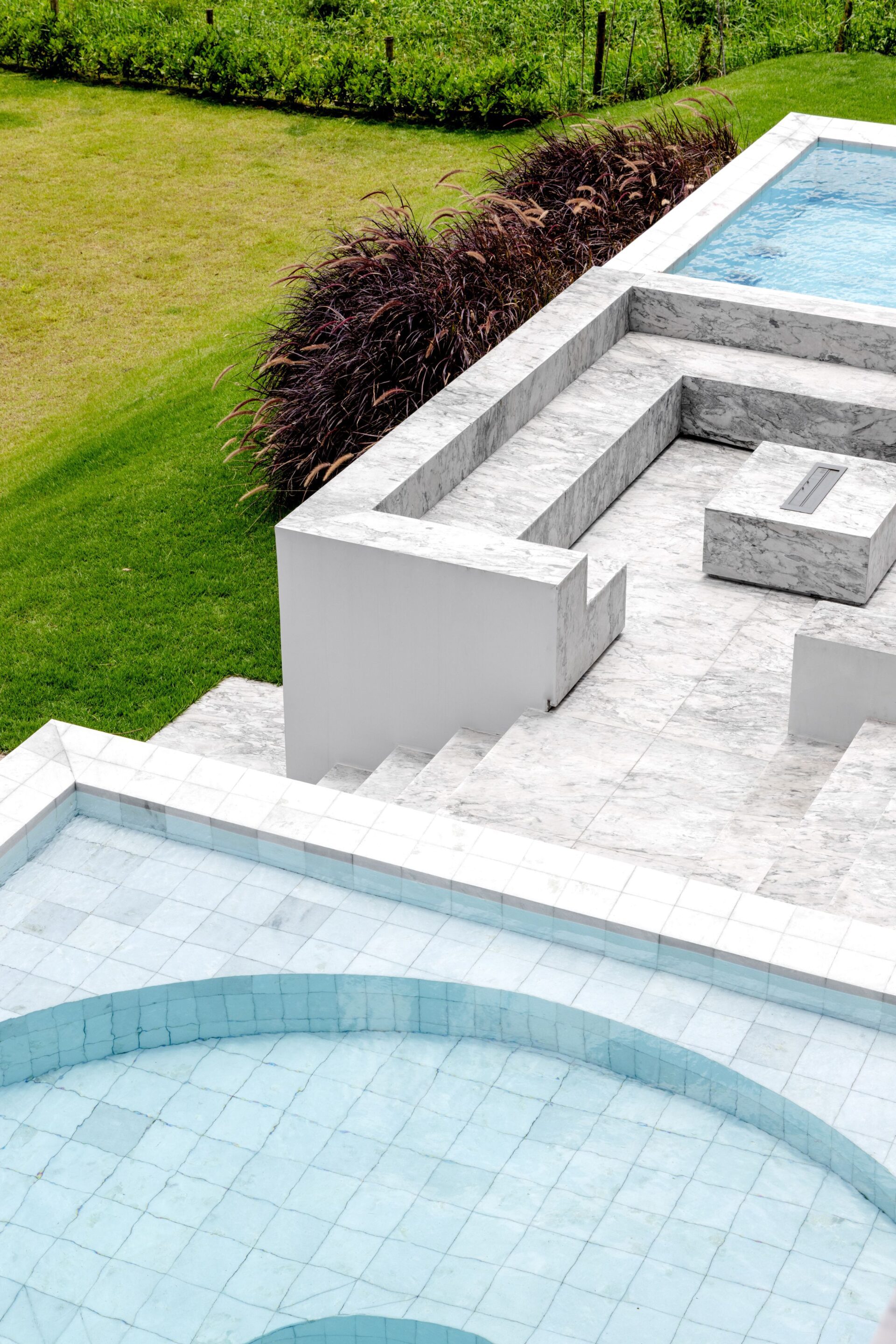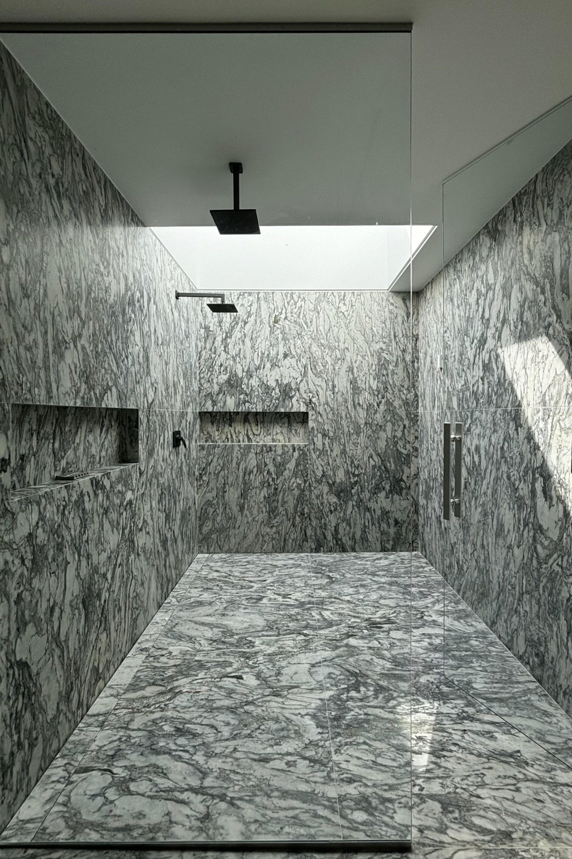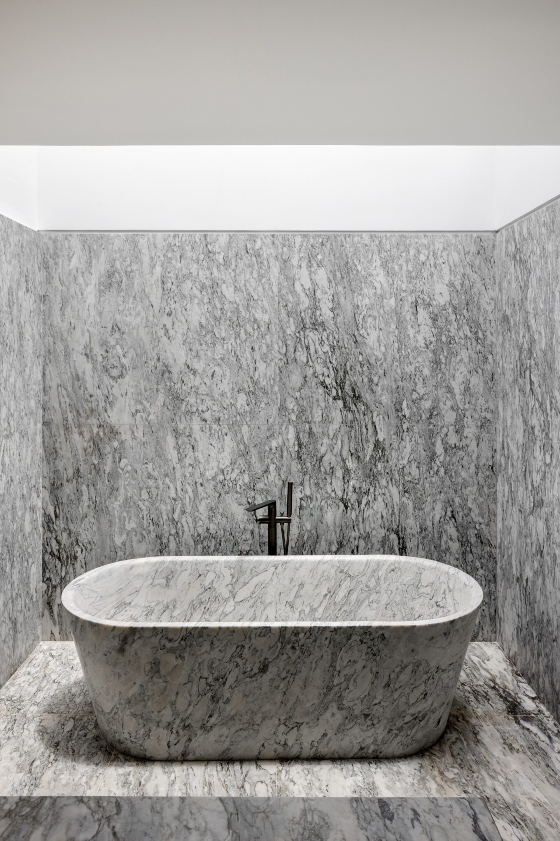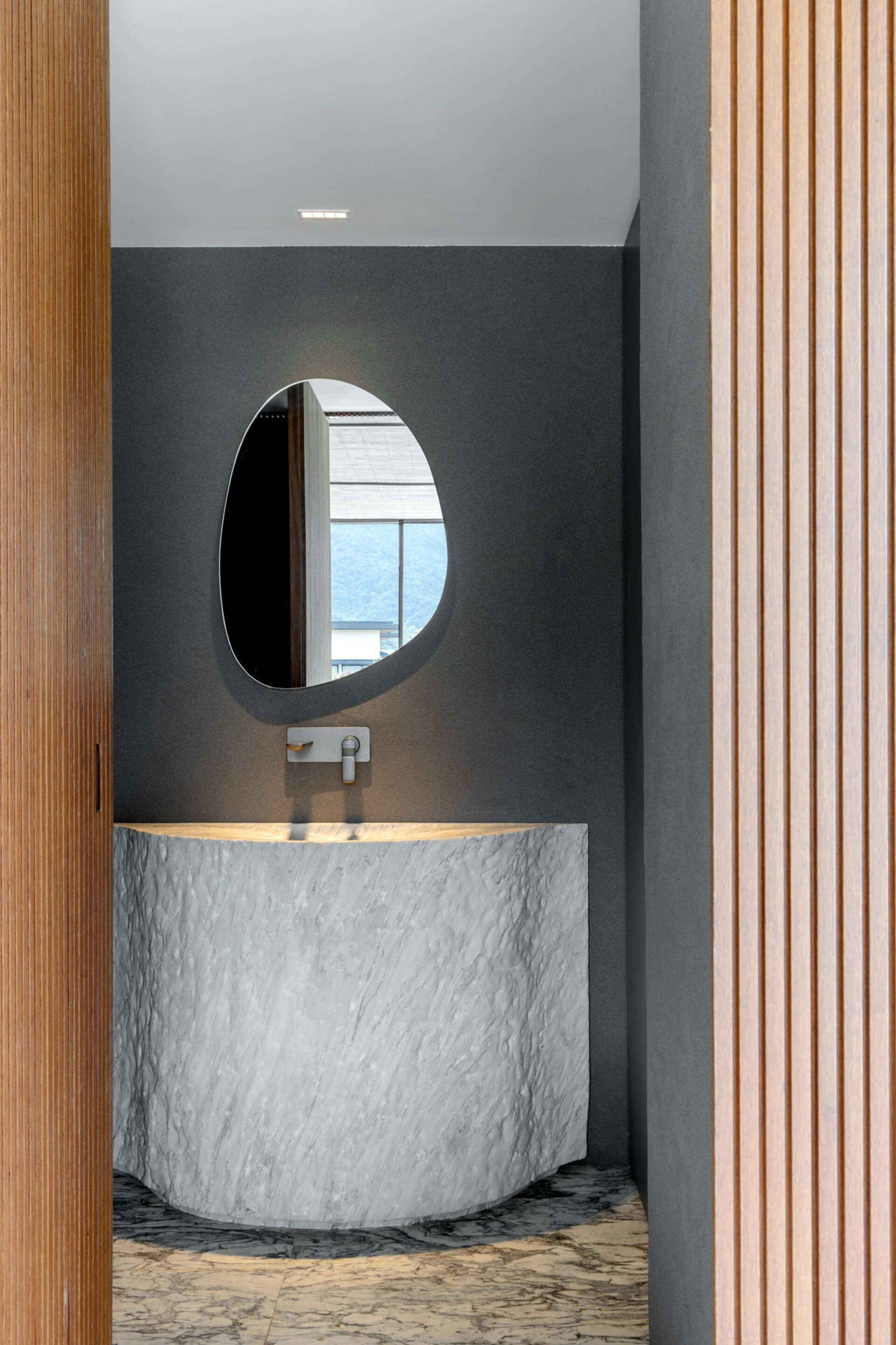 In the master bathroom, natural marble extends from the floor to the walls, creating a monochromatic and immersive environment. A strategically placed skylight allows natural light to cast shadows throughout the day, accentuating the stone’s texture and enhancing the sensory experience. The powder room, in contrast, highlights the interplay between a sculpted monolithic stone vanity and soft, diffused lighting, resulting in a sophisticated and balanced atmosphere.