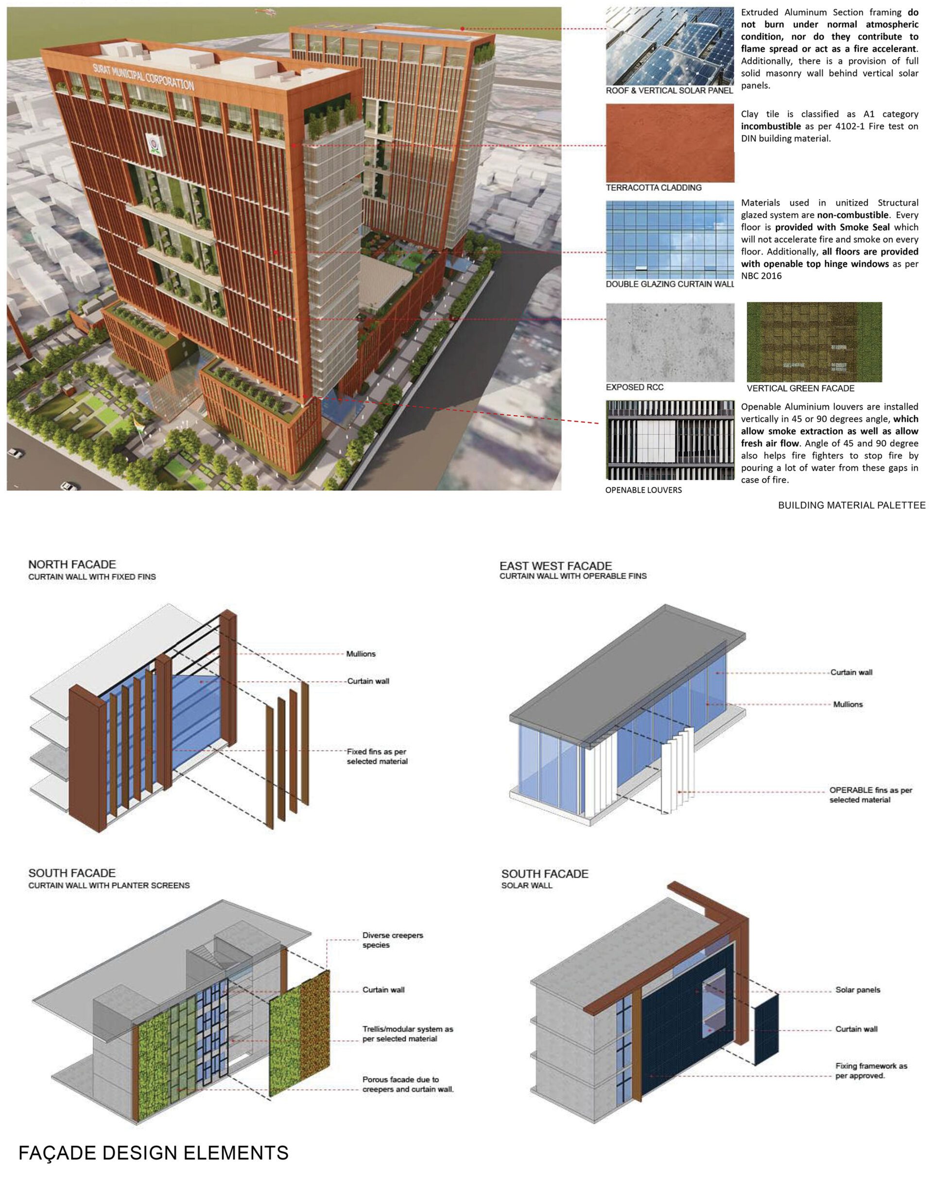 Many passive climate –responsive strategies like solar shading on east and west faces, and fins with low-E glass that admit sufficient day-light while cutting off most of the associated heat, help to maintain climatic comfort with low energy usage. Other features like vertical cable green-wall system, operable windows for ventilation, day-light sensors to cut artificial lighting needs, building-integrated solar PVs on the south façade and terraces, efficient central cooling and rainwater harvesting, all help in attaining the highest prevalent sustainability standards.