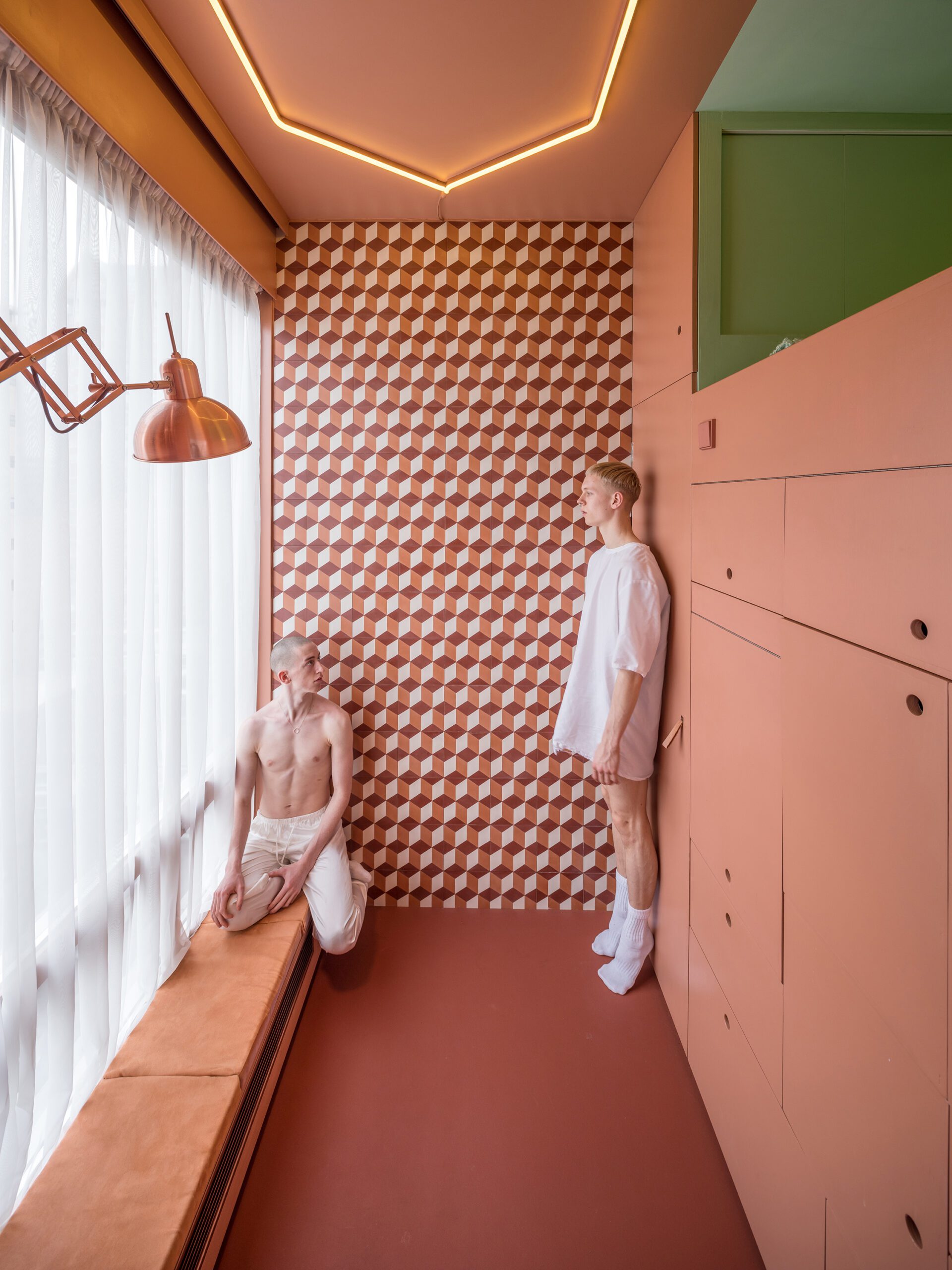 The Cabanon is a fully equipped apartment of 6.89m² including two infrared saunas and a whirlpool bath. It is organized into four spaces, extravagantly different in materials and heights: a 3 m-high living room, a 1.14m-high bedroom with plenty of storage, a toilet with a rain-shower, and a spa. The spa is the most enclosed space of the Cabanon: the room within a room.