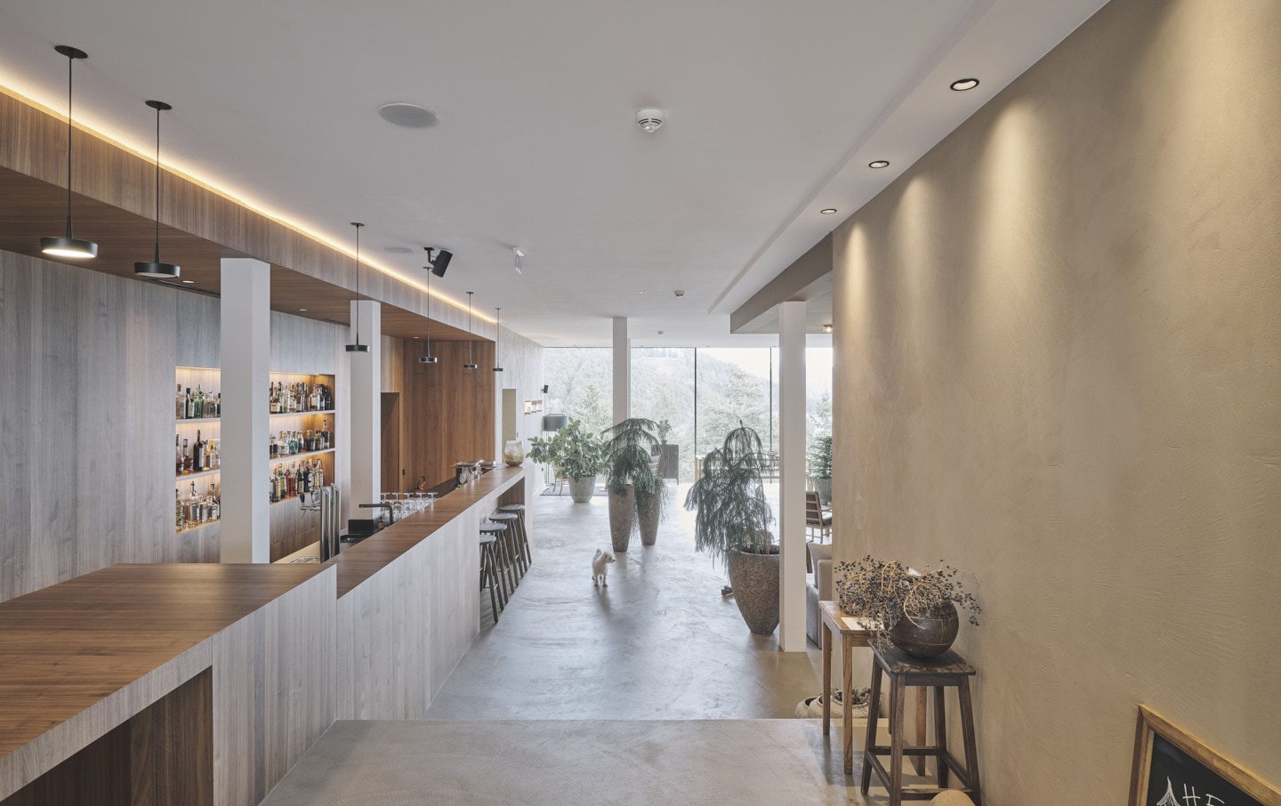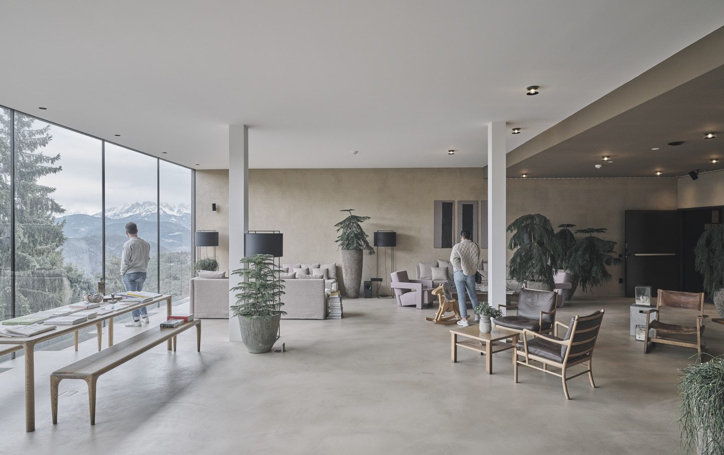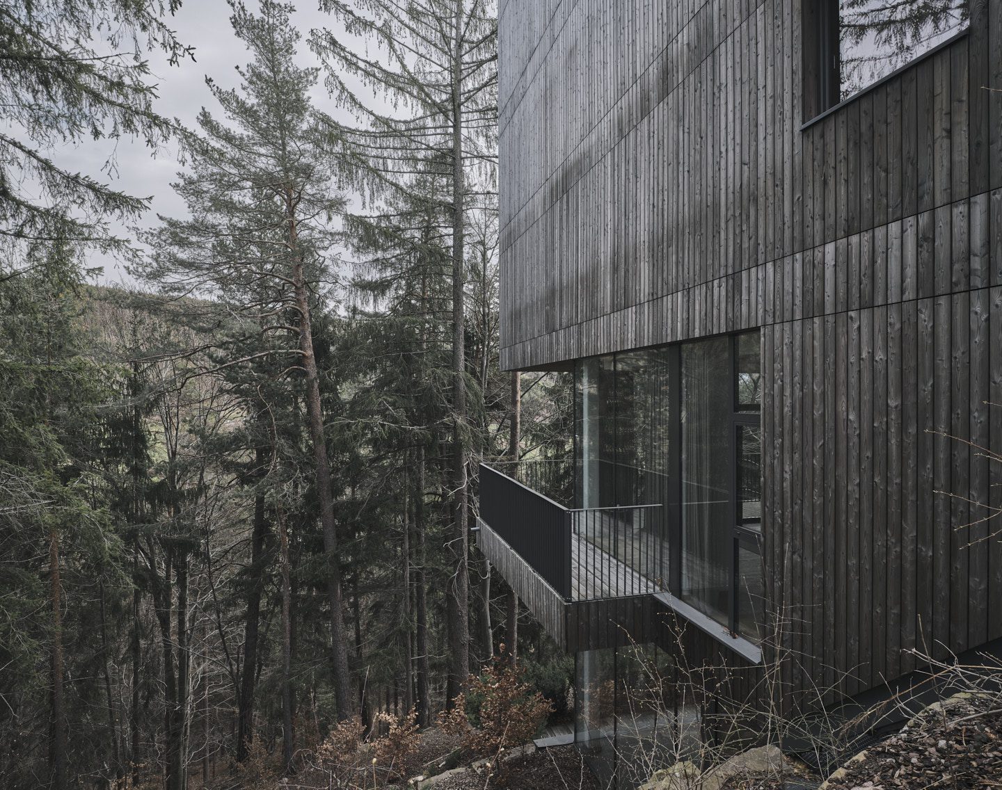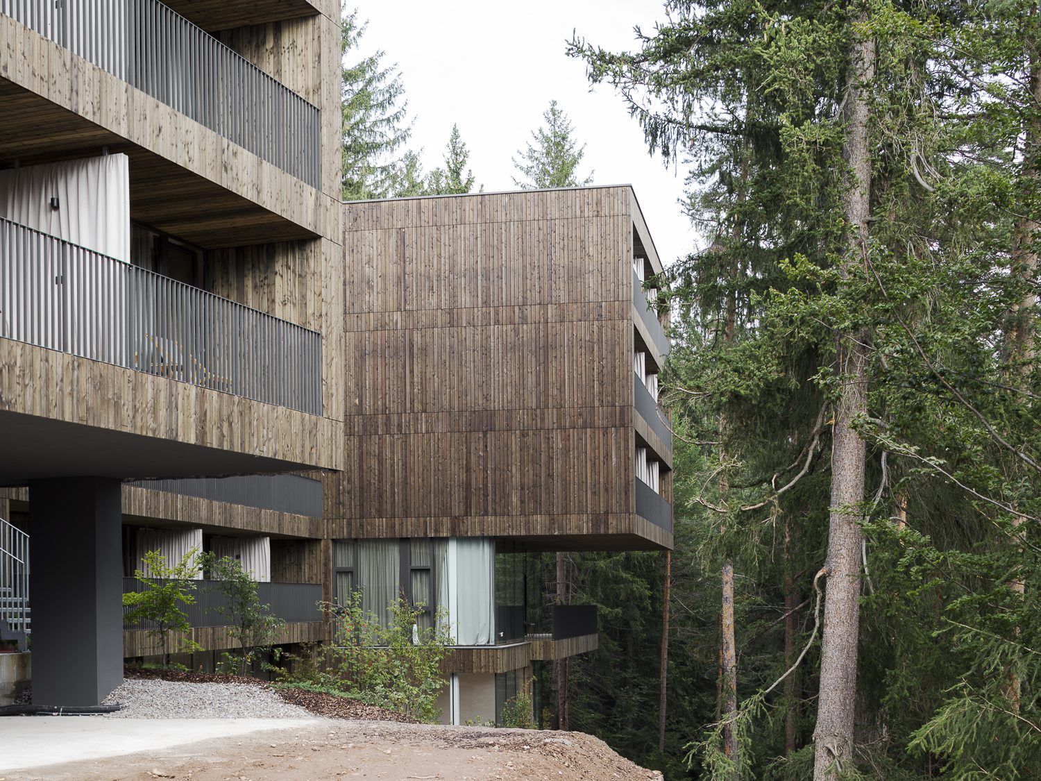 All the different areas are planned to maximise their connection to nature. While in the rooms and in the forest-spa, one sees eye to eye with nature, the view from the lobby and sky pool goes out over the mountain range of the Dolomites and loses itself in the blue sky. Externally the building is clad in pre-greyed, local larch wood panels. In contrast, the interior spaces are defined by smooth cement finishes and walnut fixtures.