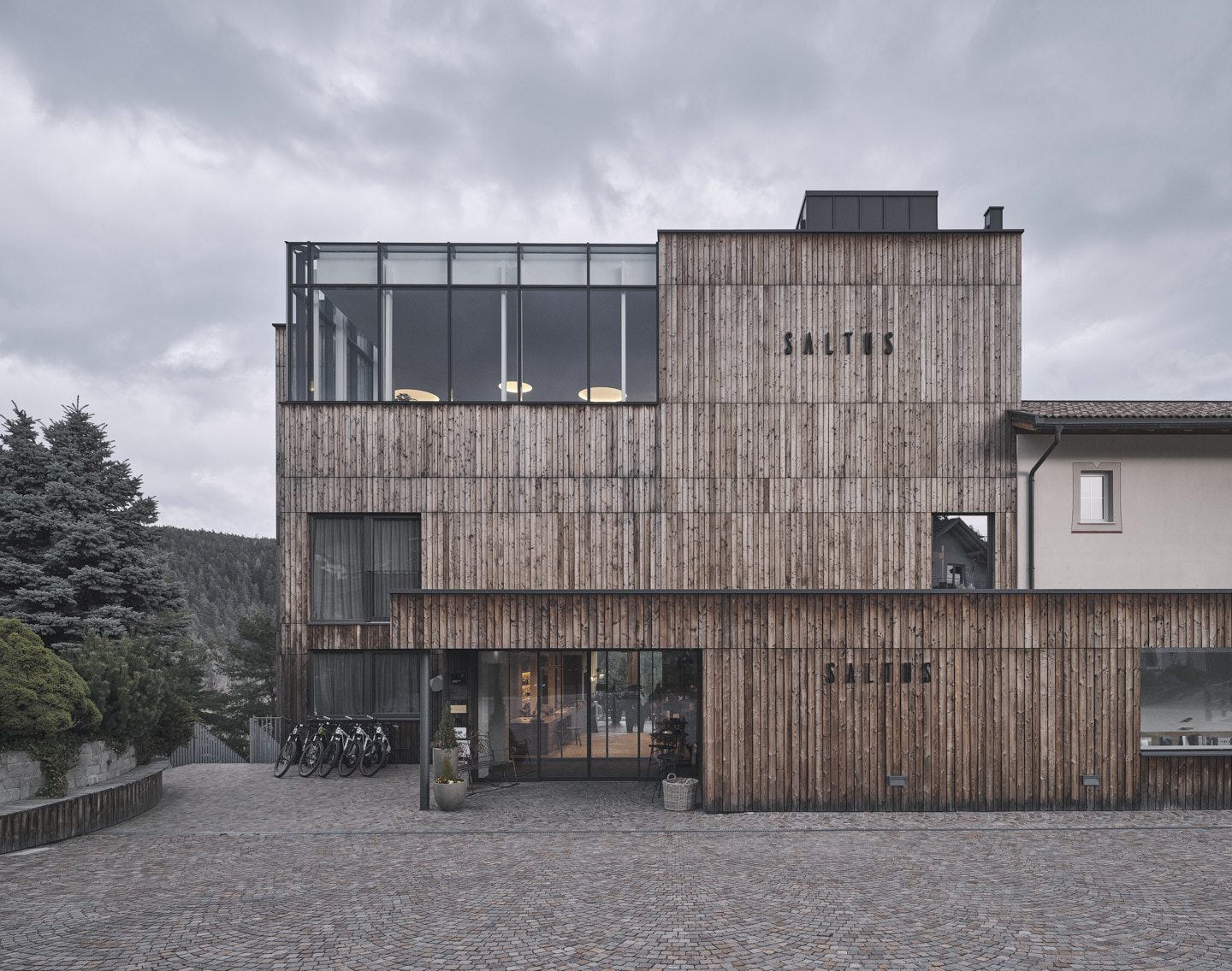 Catch your breath, feel deeply relaxed, enjoy nature, and experience grounding – these were the things on top of the list for the functional program of Hotel Saltus in San Genesio, near Bolzano. Every single design decision and choice of material was made with these fundamental principles in mind, which in the end lead to a harmonious and coherent project. The three parts of the building nestle into the steep slope at different heights. Precisely positioned cuts into the geometrically simple building volumes, which interact with the distinctive terrain, create unique exterior spaces.