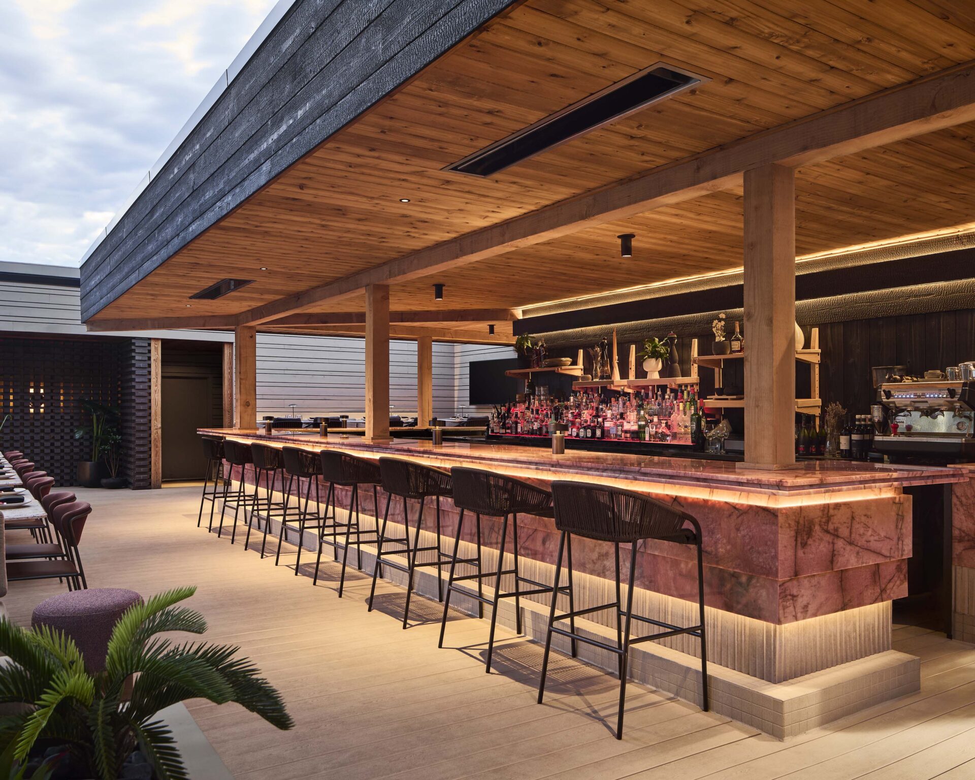 Sustainability played a crucial role in material selection and construction methods. The project took a strategic, low-impact approach, preserving existing architectural elements wherever possible to significantly reduce embodied carbon. Shou Sugi Ban wood, naturally preserved and highly durable, was responsibly sourced to extend surface lifespan and reduce maintenance. Locally sourced Douglas fir and cedar further minimized transportation emissions while supporting regional craftsmanship. The black brick breeze wall repurposes standard masonry in a creative configuration, reducing material waste while enhancing aesthetics. The pergola ensures longevity and modularity, allowing future adaptations without extensive demolition. To lower operational energy use, dimmable fixtures reduce reliance on high-output lighting, and portable table lamps provide localized illumination, allowing guests to curate their ambiance while conserving energy.