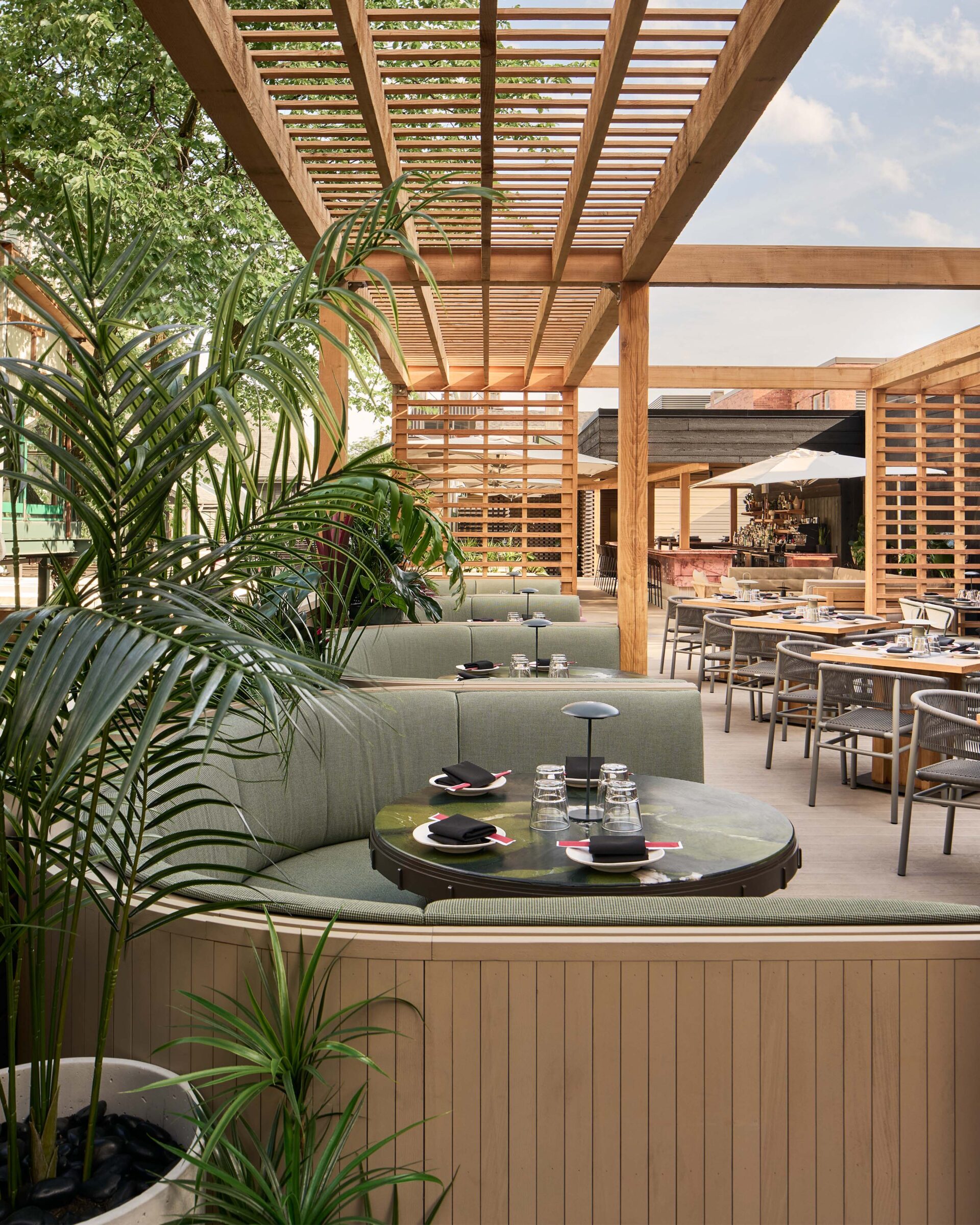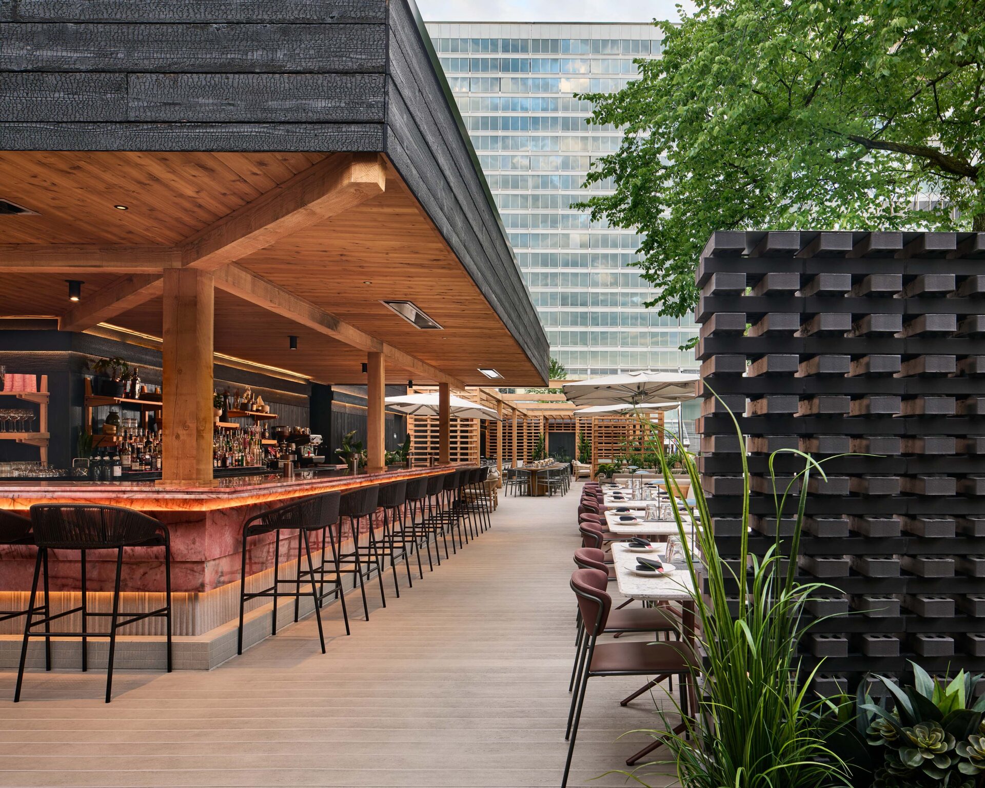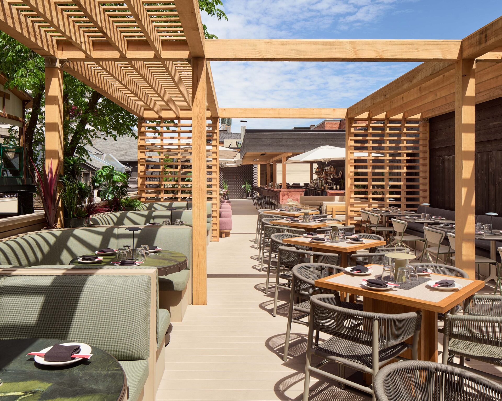 A defining architectural element, the pergola mirrors the surrounding city grid while softening it to a more intimate scale. To address lighting constraints, dimmable fixtures were integrated into a charred valence around the perimeter, complemented by portable table lamps that enhance the living-room feel. The thoughtful spatial reconfiguration ensures seamless transitions between dining and lounge areas, fostering interaction while maintaining accessibility for all guests.