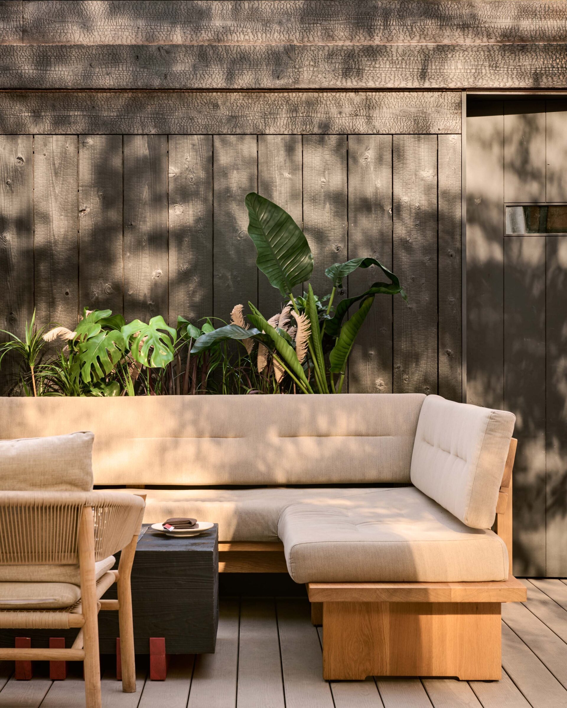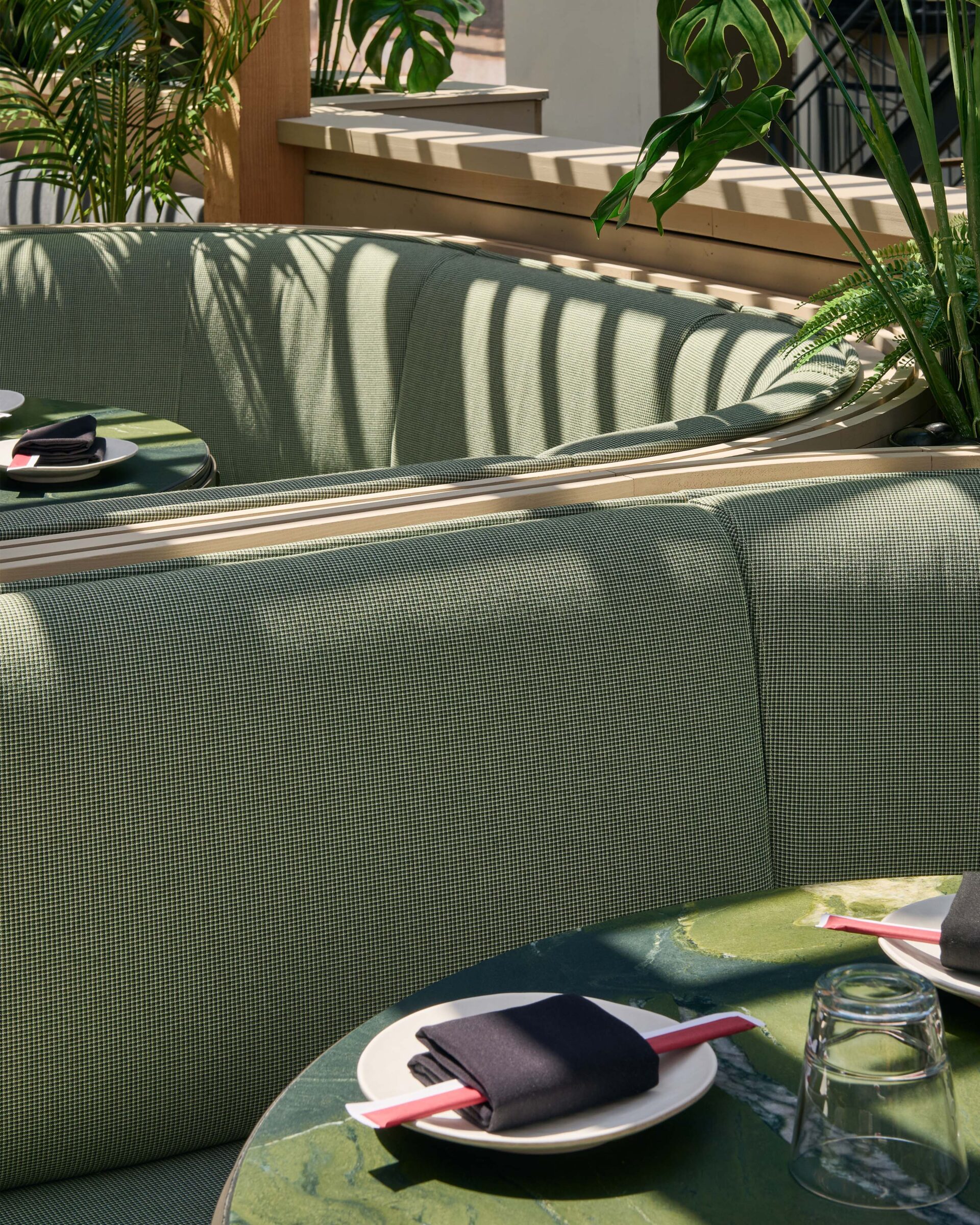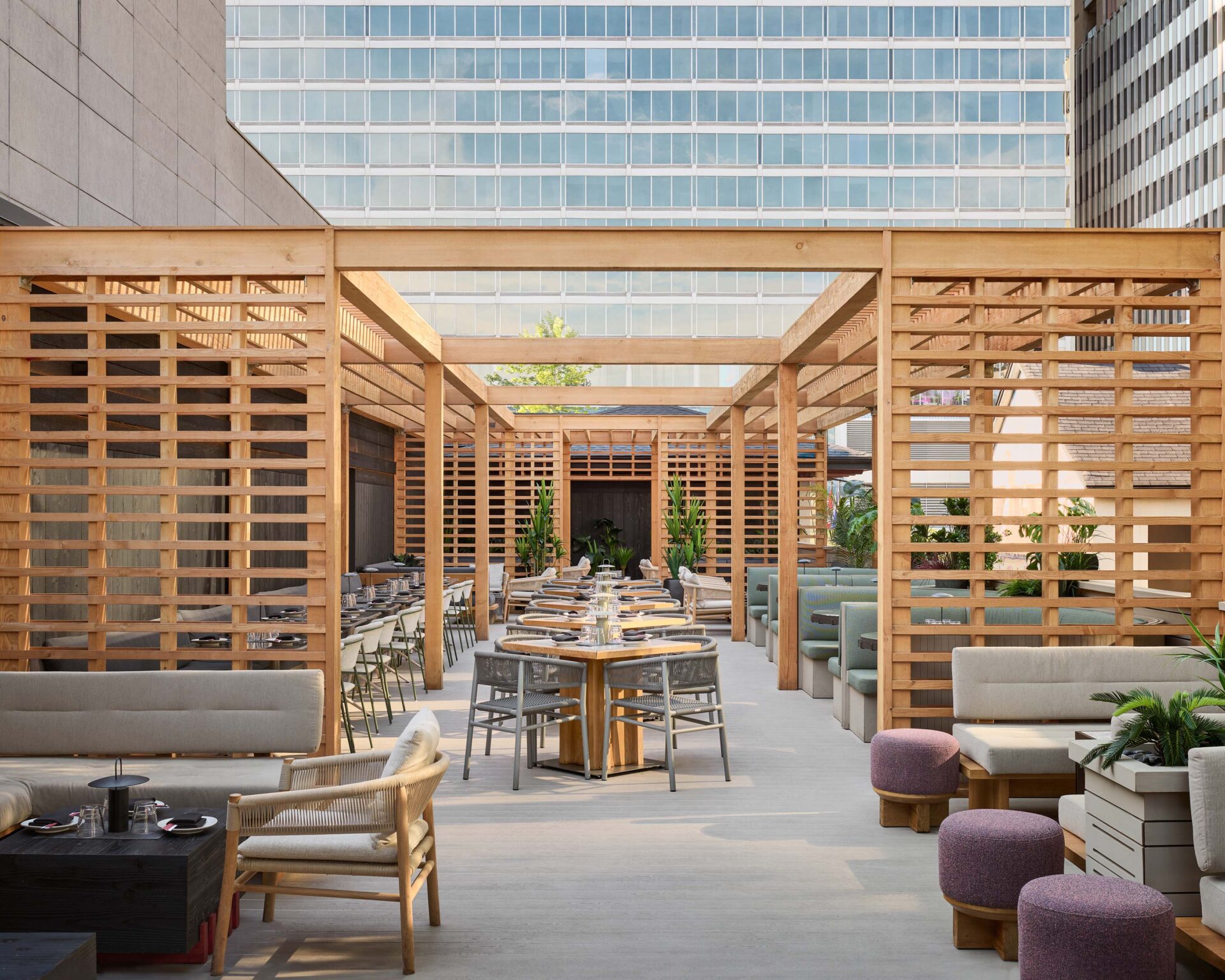 A defining architectural element, the pergola mirrors the surrounding city grid while softening it to a more intimate scale. To address lighting constraints, dimmable fixtures were integrated into a charred valence around the perimeter, complemented by portable table lamps that enhance the living-room feel. The thoughtful spatial reconfiguration ensures seamless transitions between dining and lounge areas, fostering interaction while maintaining accessibility for all guests.