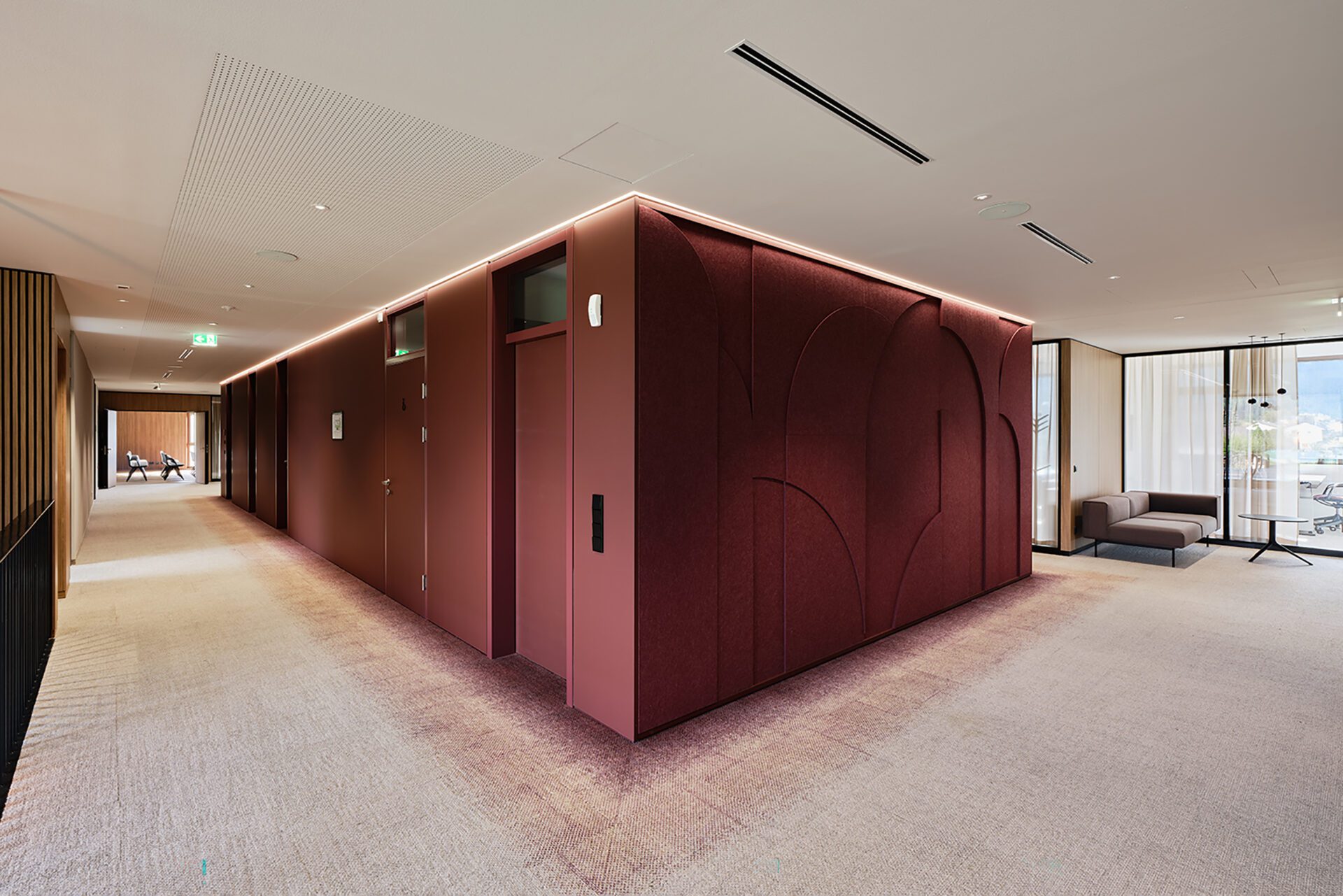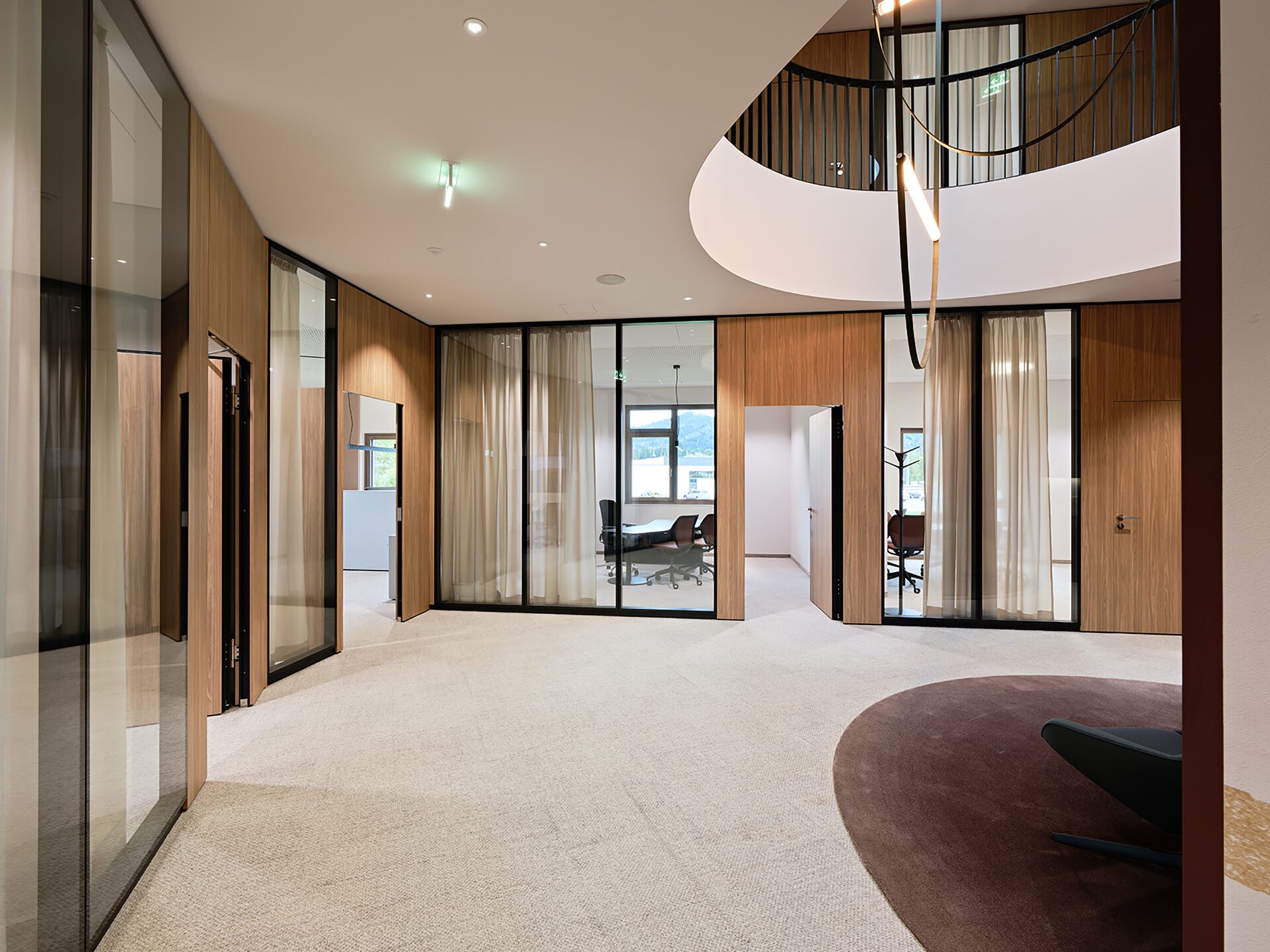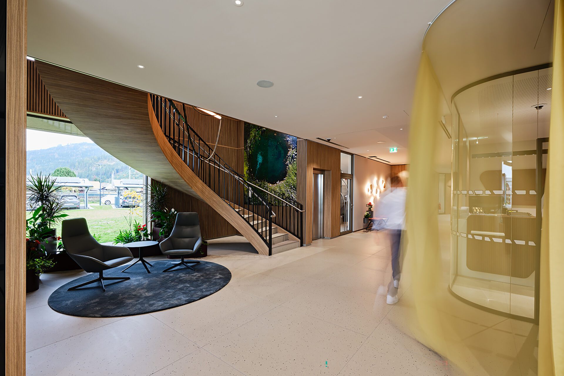 A timber-hybrid structure enhances sustainability and reduces construction time. The design emphasizes natural materials—stone, wood, felt, and recycled elements—creating a warm, acoustically optimized interior. The façade combines large glass surfaces with timber paneling, while the upper level features a laser-cut abstraction of the Raiffeisen logo, wrapping the building in a distinctive identity.