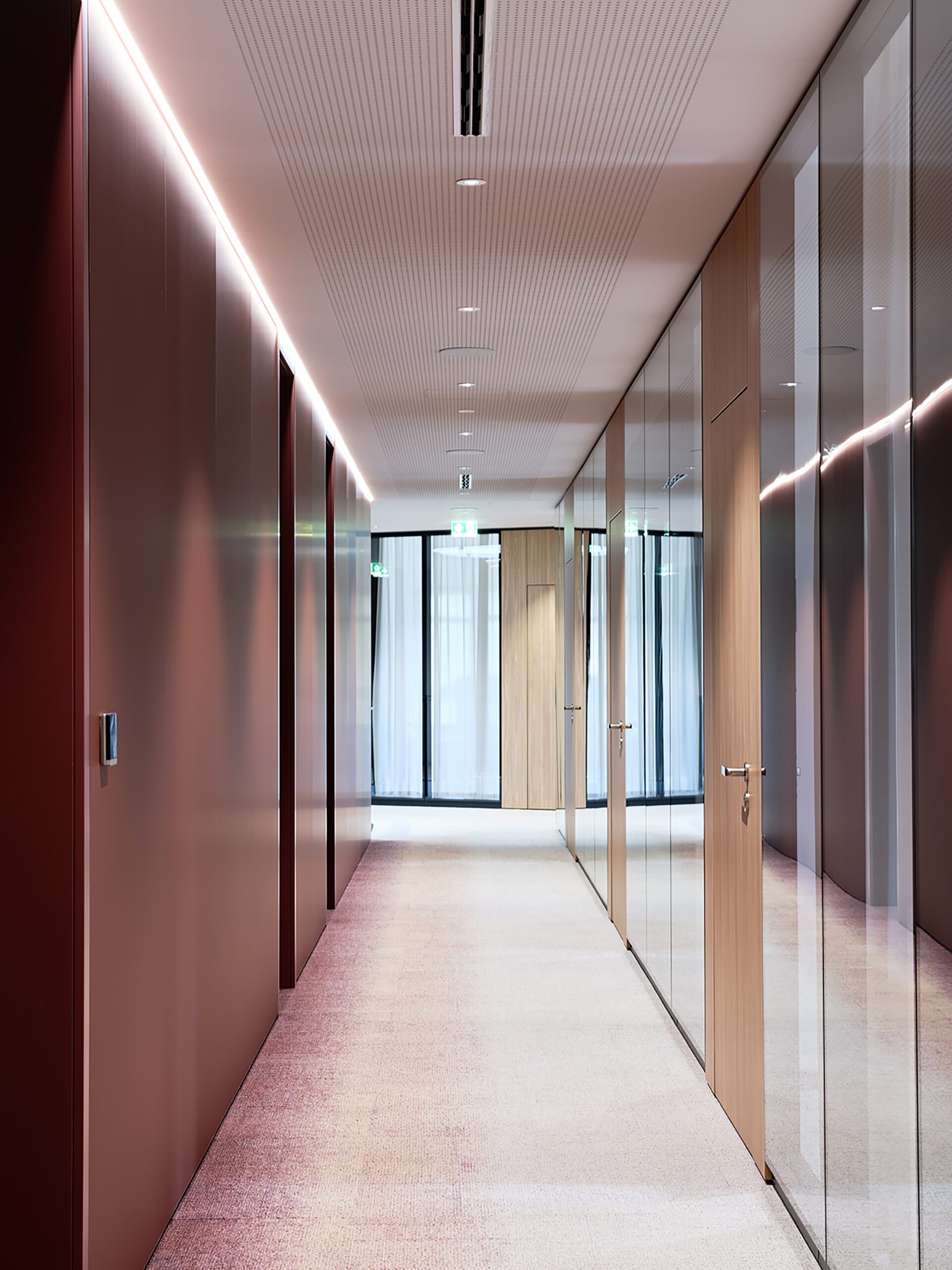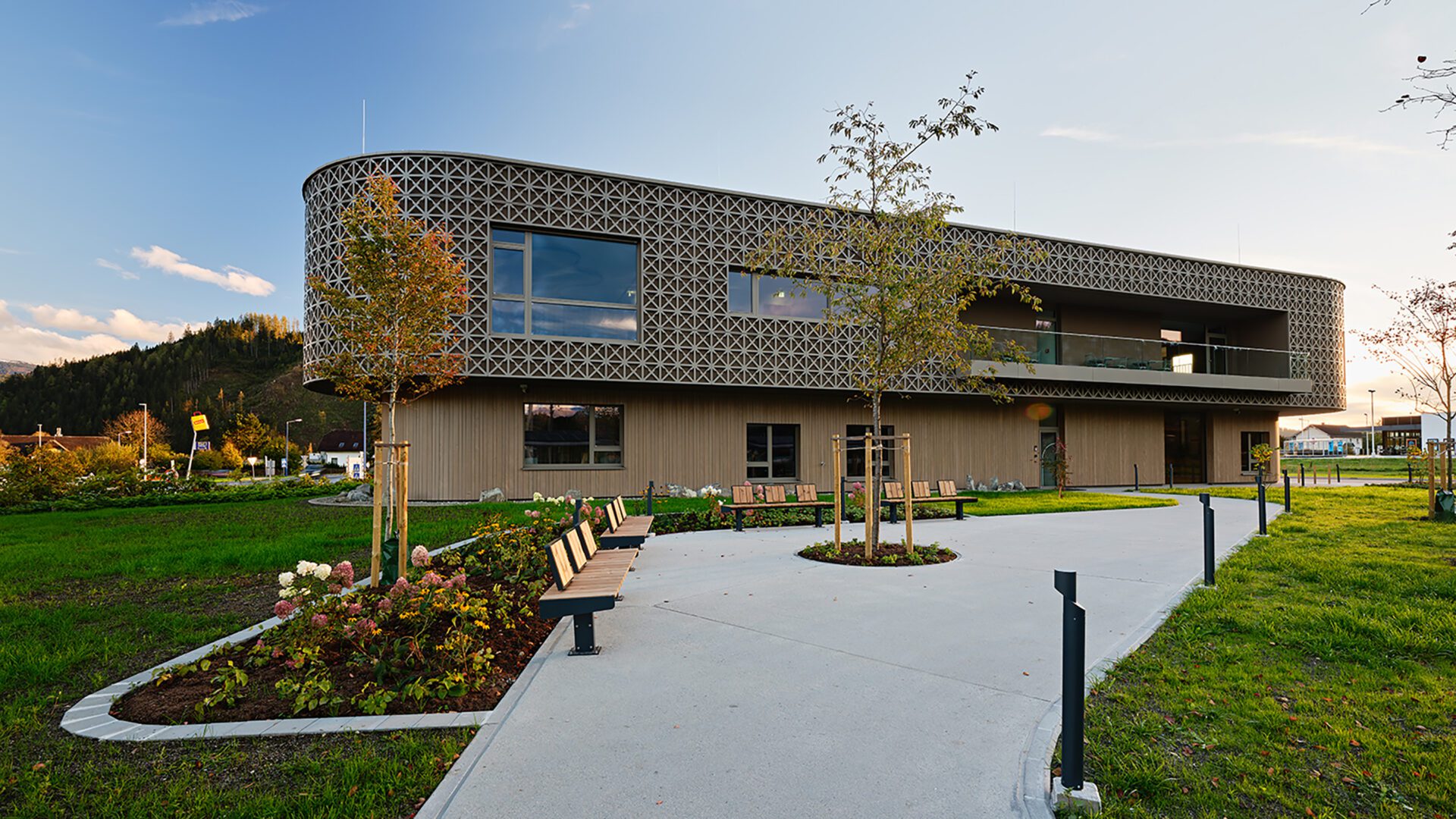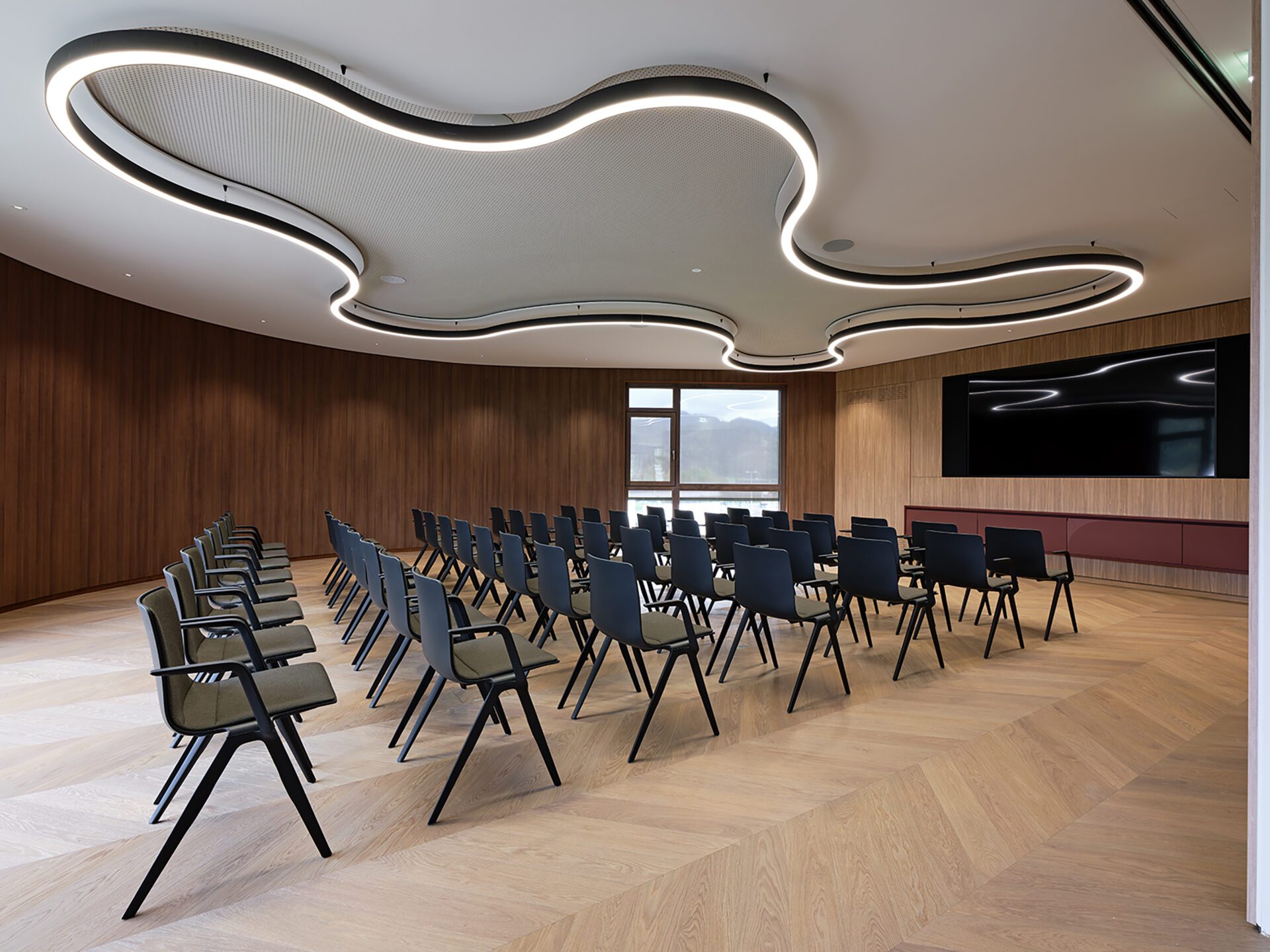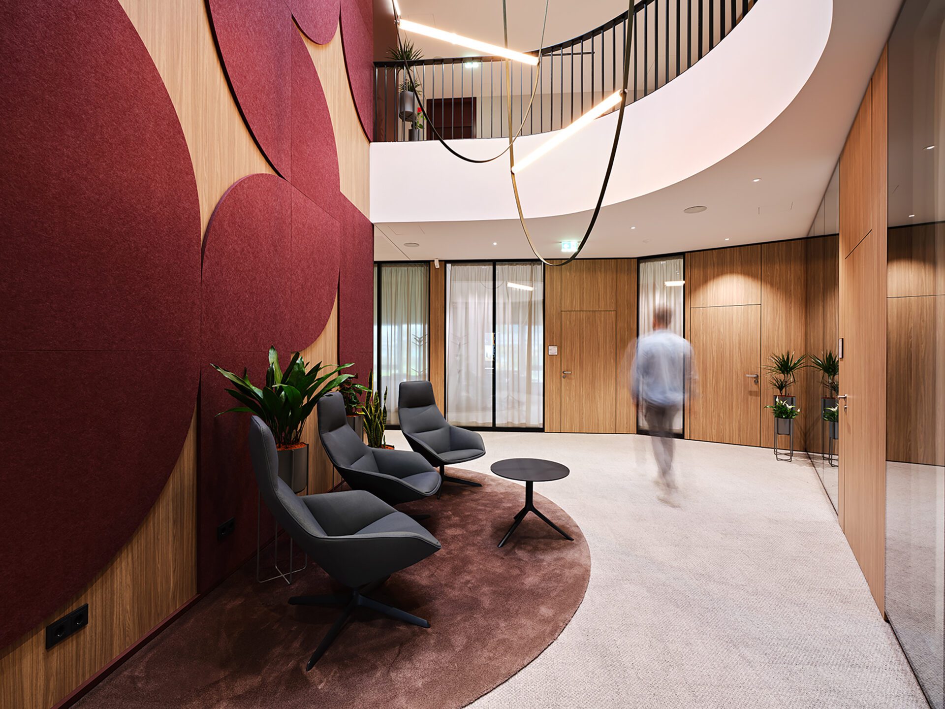 A timber-hybrid structure enhances sustainability and reduces construction time. The design emphasizes natural materials—stone, wood, felt, and recycled elements—creating a warm, acoustically optimized interior. The façade combines large glass surfaces with timber paneling, while the upper level features a laser-cut abstraction of the Raiffeisen logo, wrapping the building in a distinctive identity.