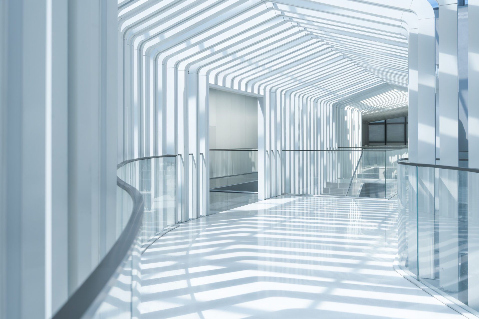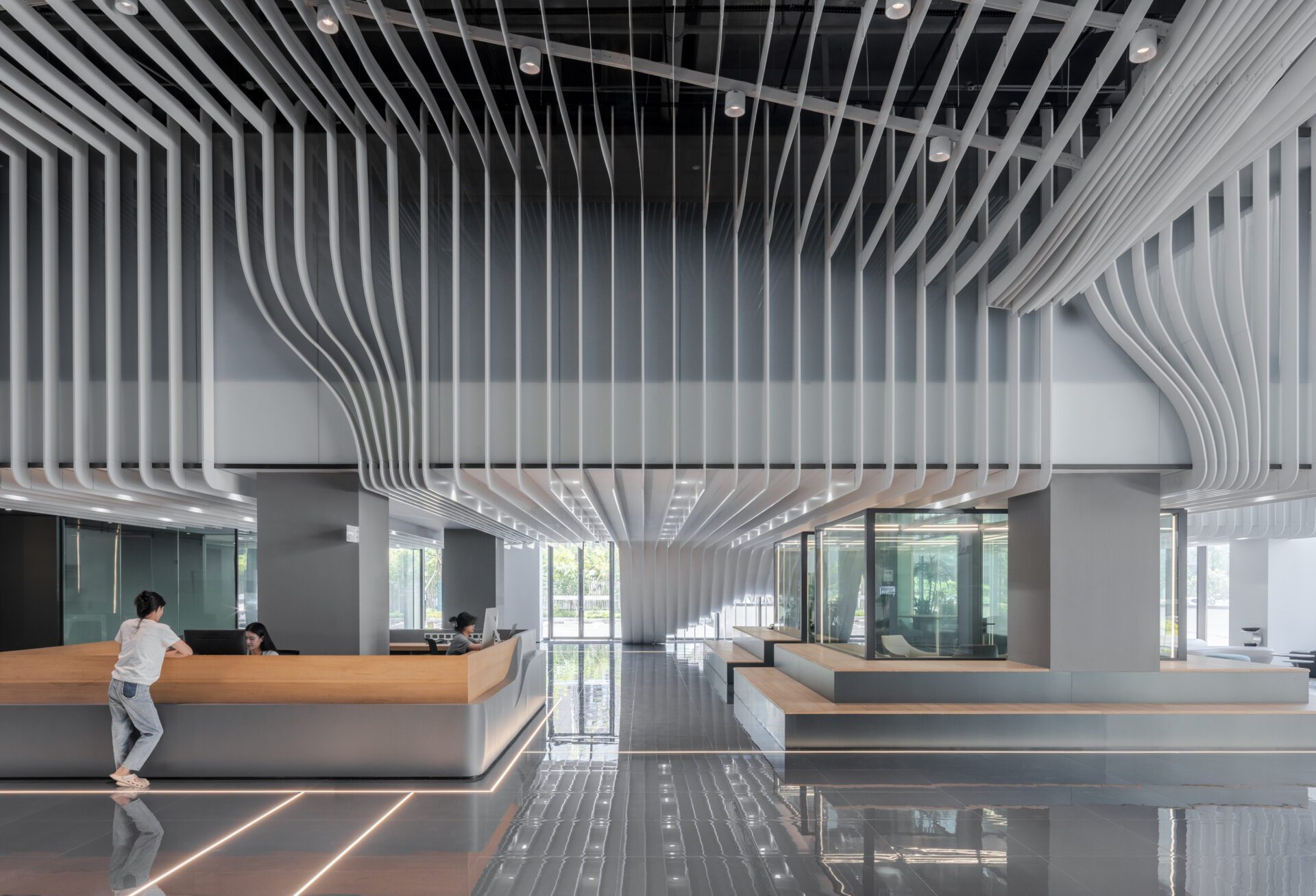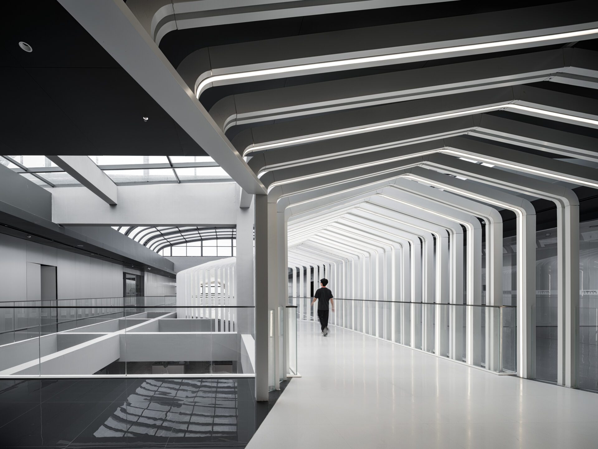 The cloud-like walkway is composed of vertical white elements, with sunlight filtering through the grilles, creating a bright and orderly spatial atmosphere. As the sun rises and sets, the scenery changes accordingly, allowing employees to fully relax their minds during work breaks. It also becomes a distinctive, iconic feature of the company’s identity.