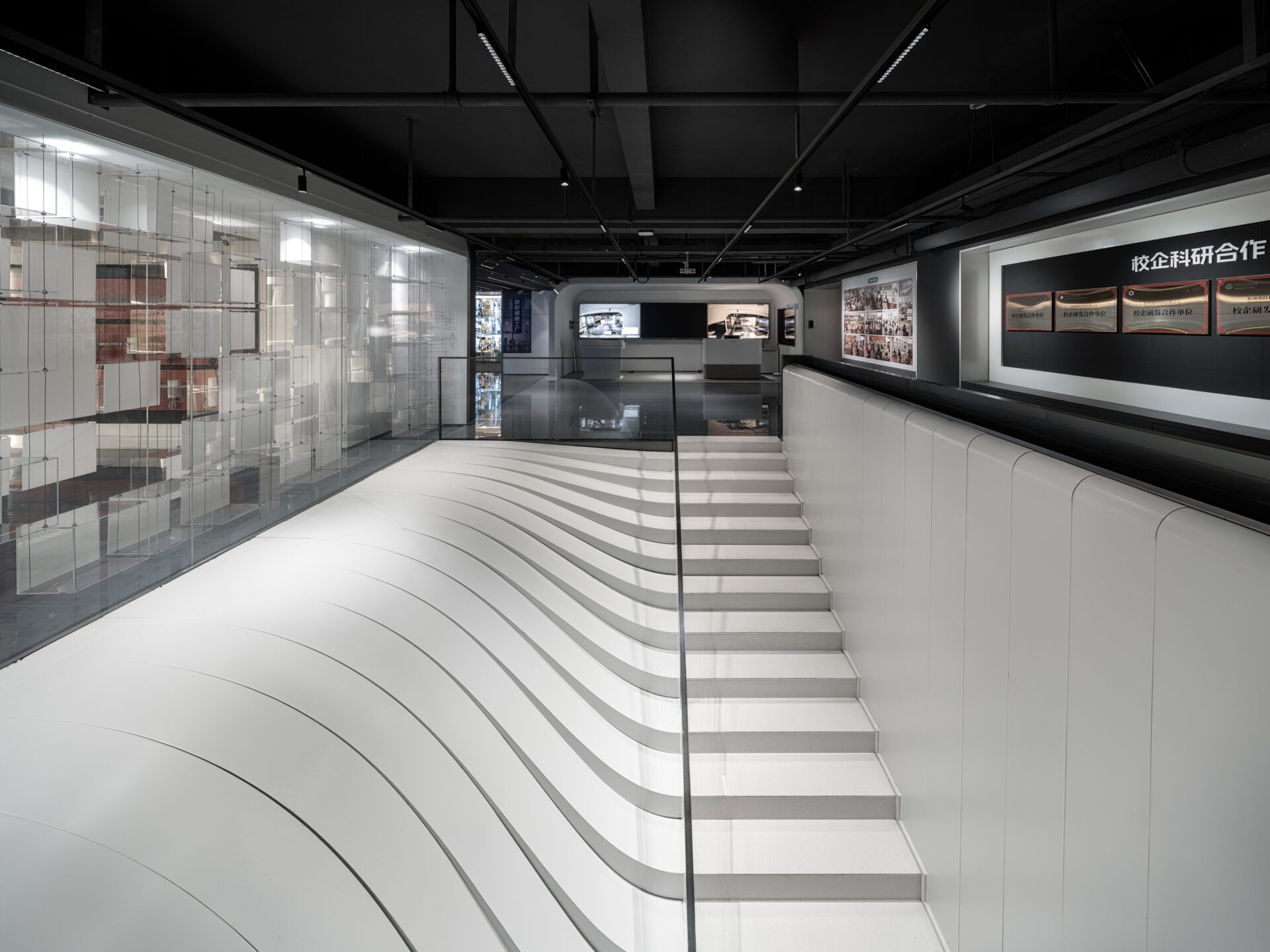 Unlike the spatial juxtaposition of the first-floor exhibition hall, the second-floor showroom is organized around a timeline. The honor hall, resembling a black box, houses the company’s past achievements.