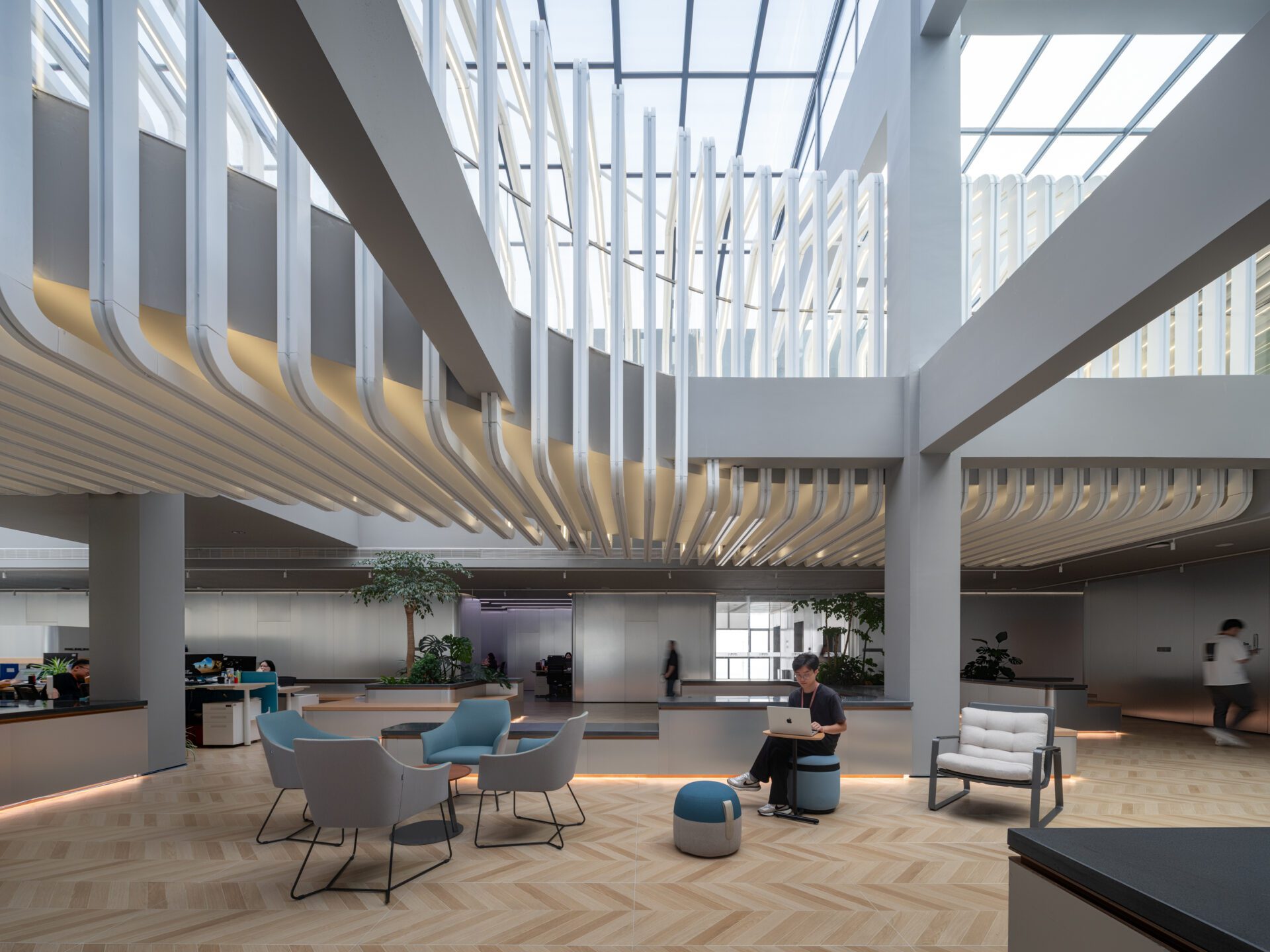 The HQ building features a conventional frame structure, with activities and sightlines segmented by the floor slabs. The design team redefined the circulation routes, created an atrium, and blurred the boundaries between walls, floors, and the roof, breaking the conventional concept of separate levels. Using flowing white curves, they transformed the multi-level space into a continuous three-dimensional environment, bringing a light, cloud-like experience and creating a refreshing and distinctive HQ space.