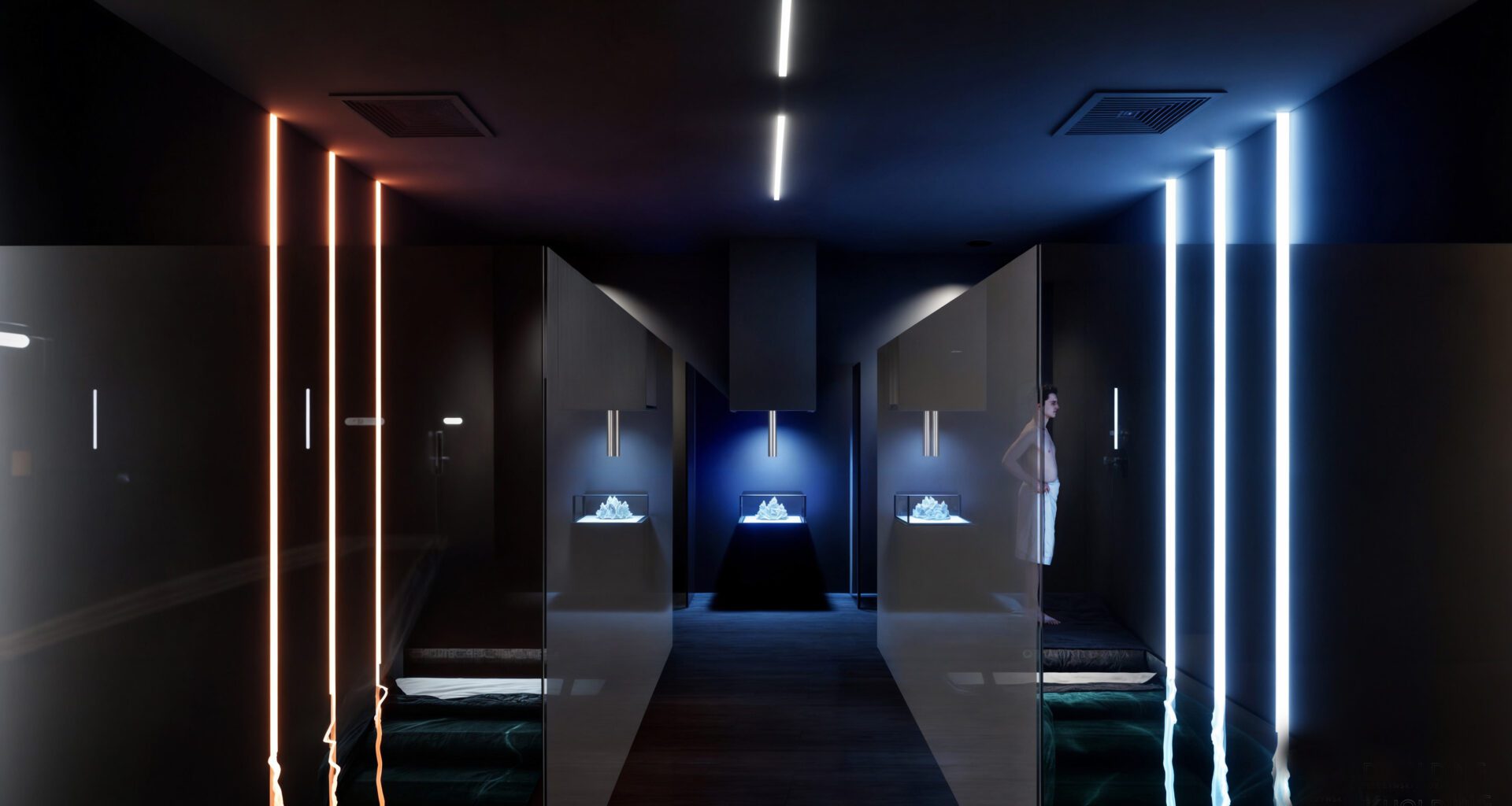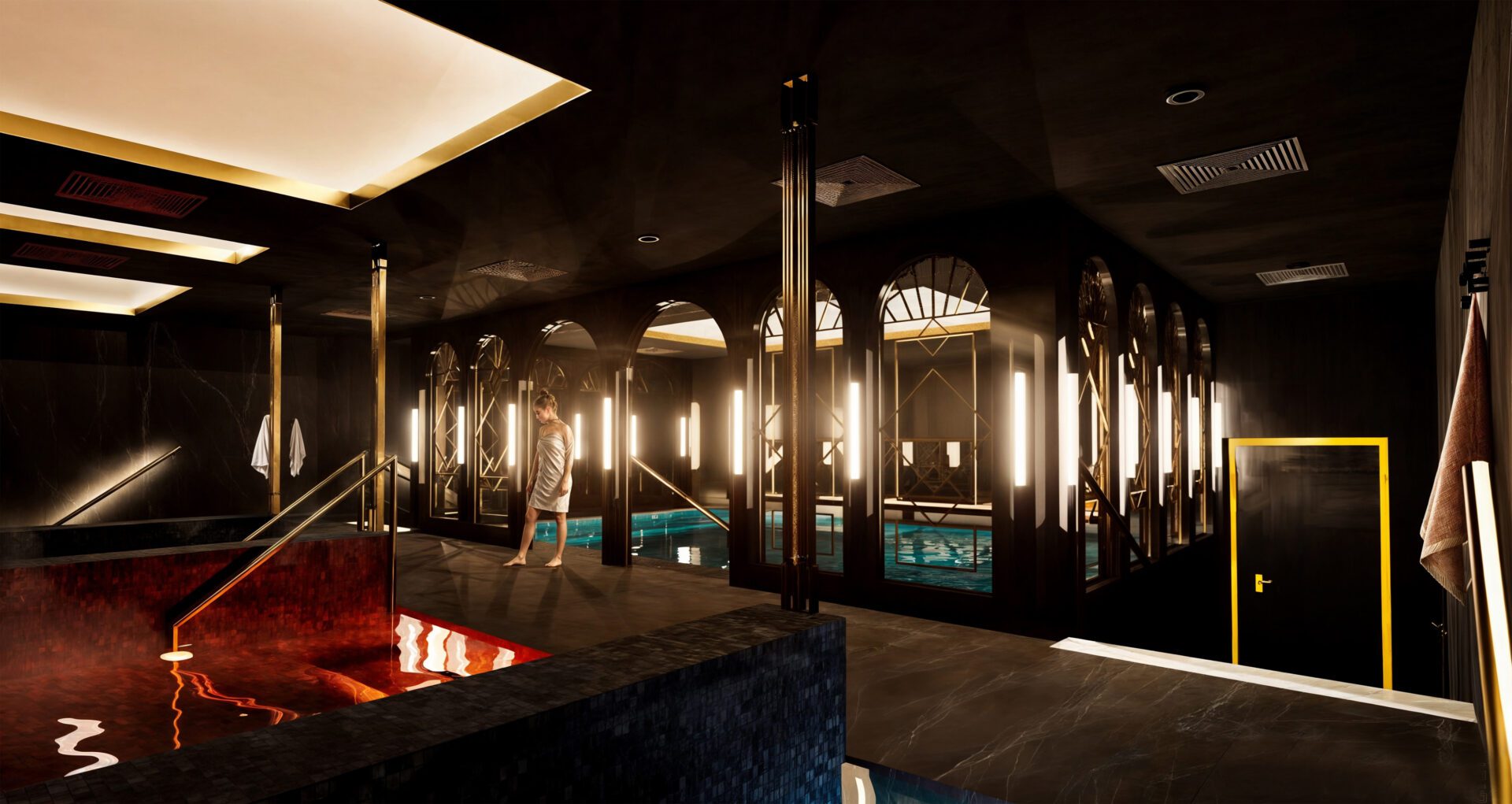 The architecture doesn’t merely frame the experience – it amplifies it. Light plays a crucial role, designed to evoke a cinematic atmosphere: soft reflections on marble, subtle glints of gold, and steam curling around rays of warm illumination. Every surface and texture is curated to create a sense of depth, intimacy, and timeless glamour.