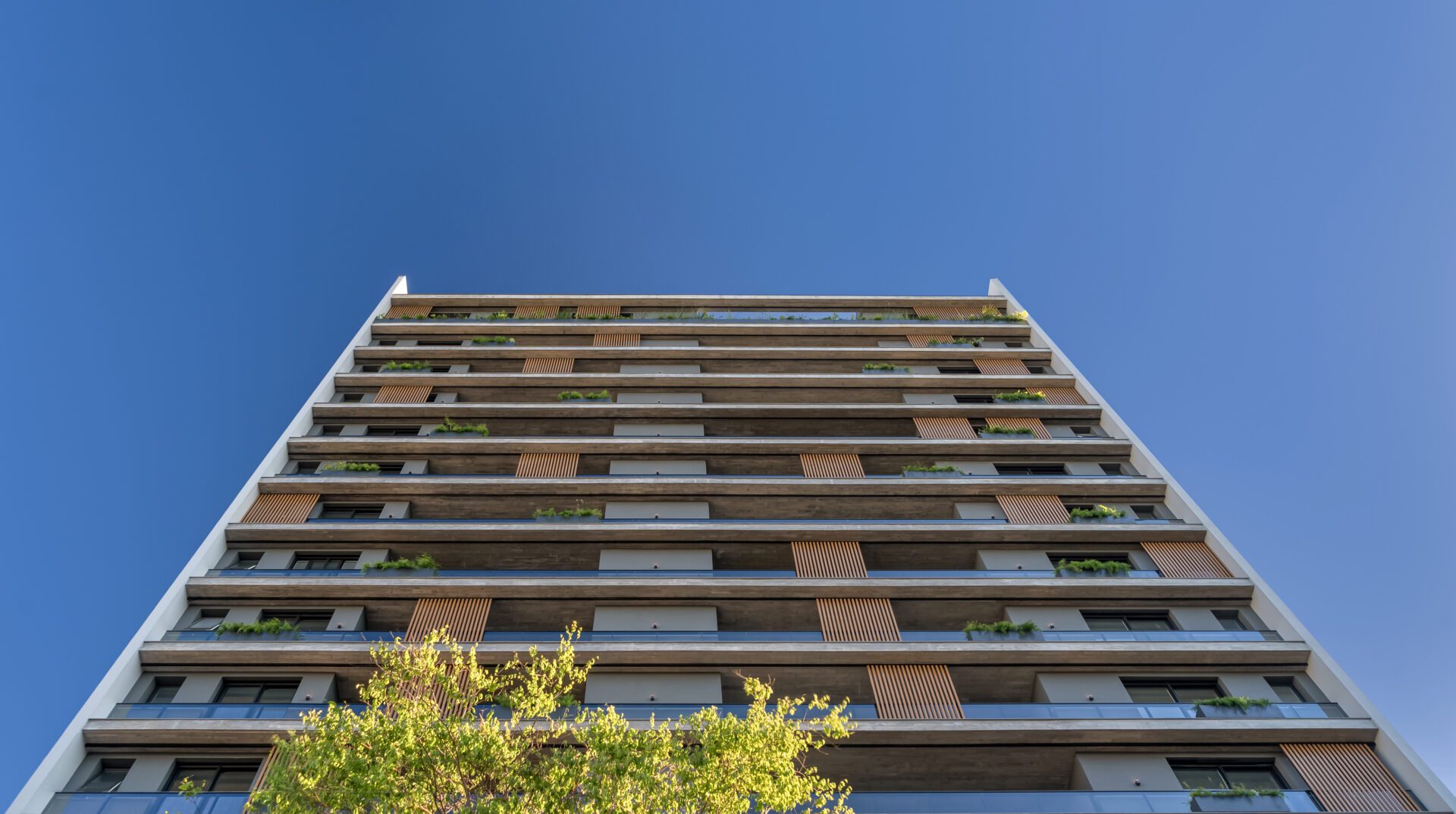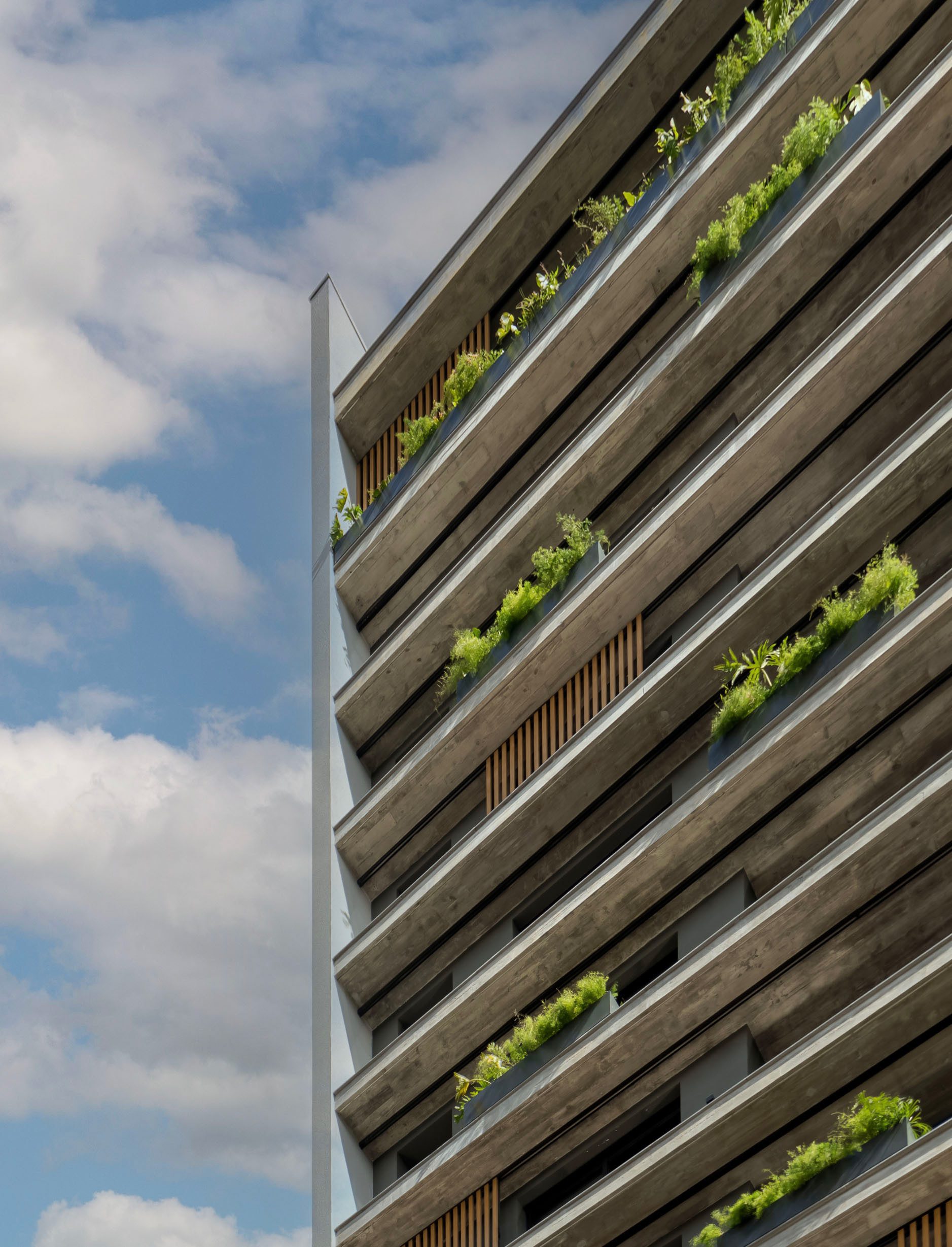 The façade composition expresses the project’s concept through the presence of greenery that climbs the building. Vegetation extends into the residential units, becoming part of the residents’ daily lives. The formal purity is complemented by the use of movable wooden-toned brise-soleils, which function both as sun protection elements and as dynamic features that respond to the organic life of the building. They are a direct translation of the relationship between the architecture and its inhabitants.