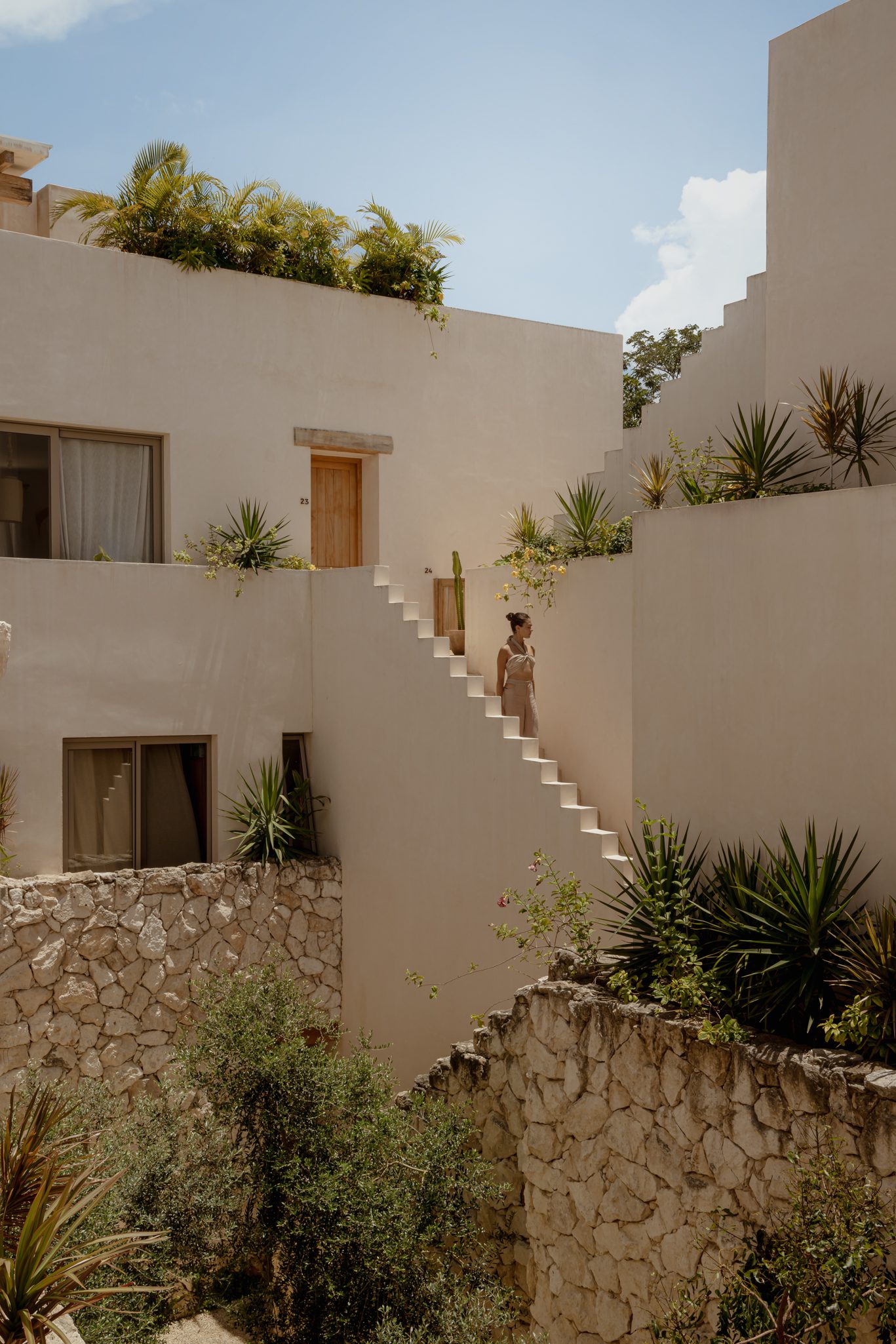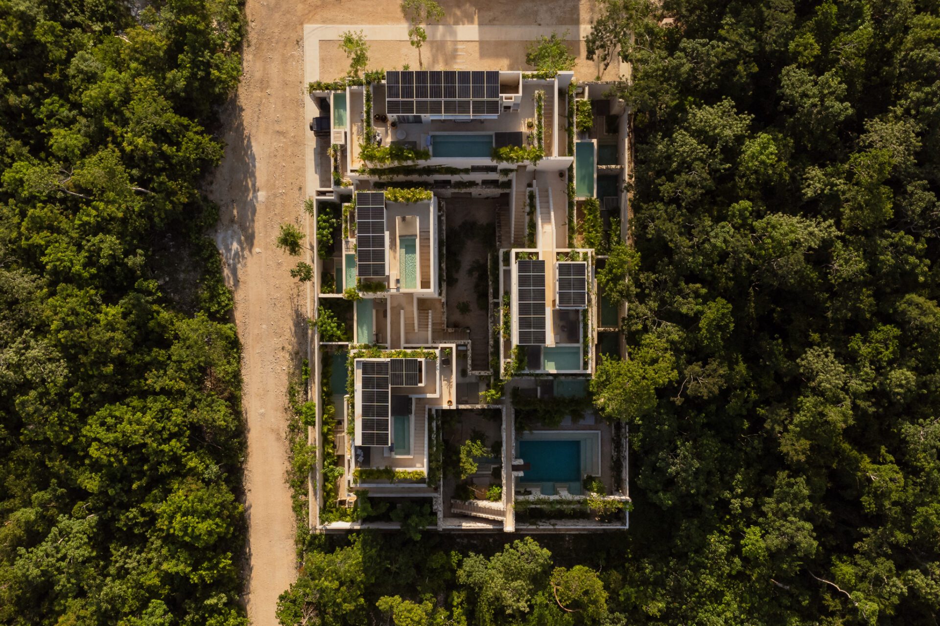 The building’s material palette draws from local textures, with stone anchoring the base and Chukum finishing the upper levels. Neutral tones allow the jungle to play a starring role, as vegetation becomes an integral part of the walls and slabs, blending seamlessly with the architecture.