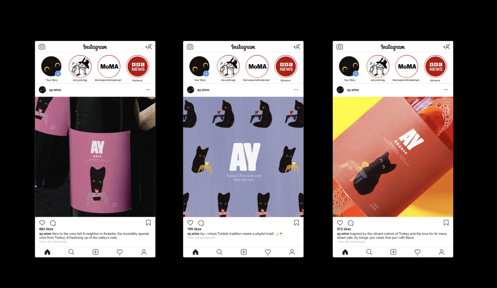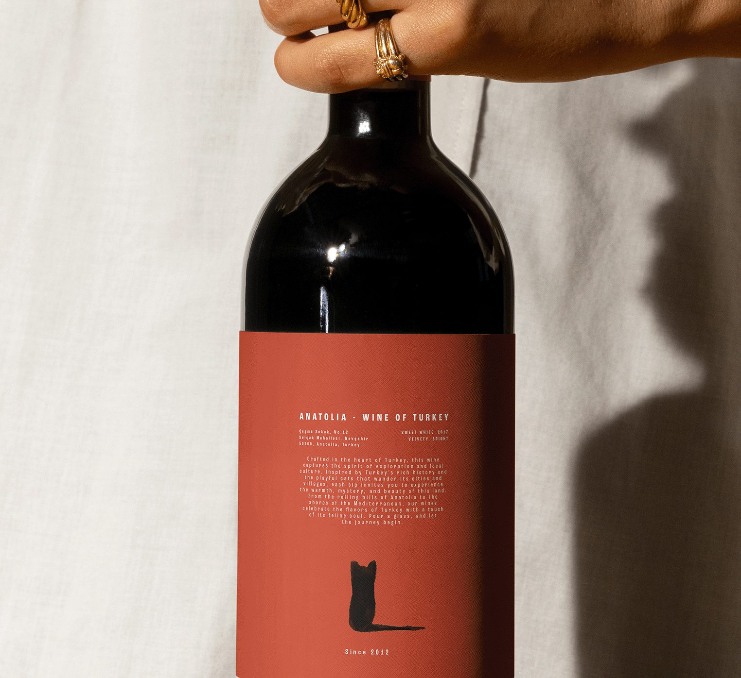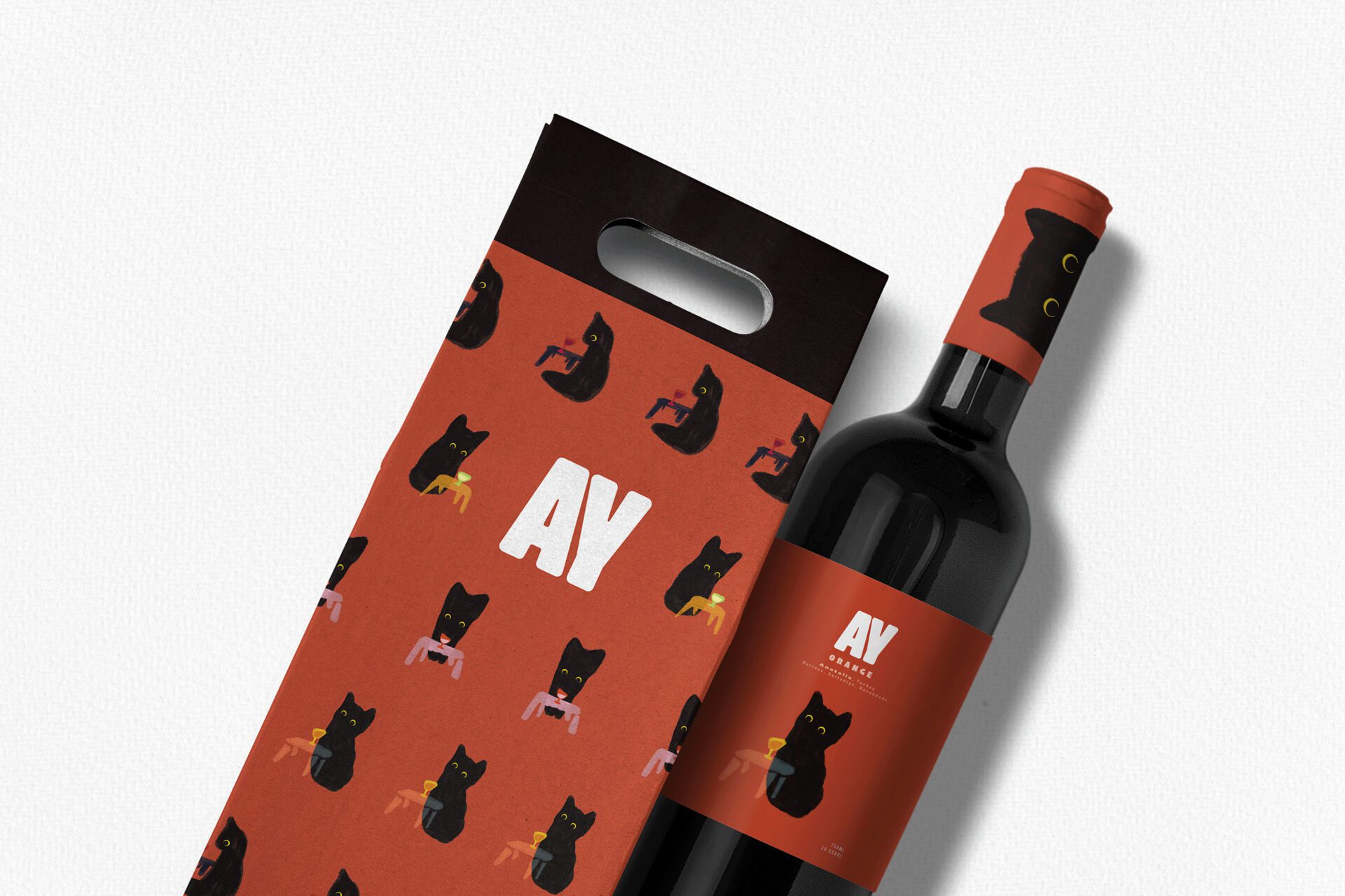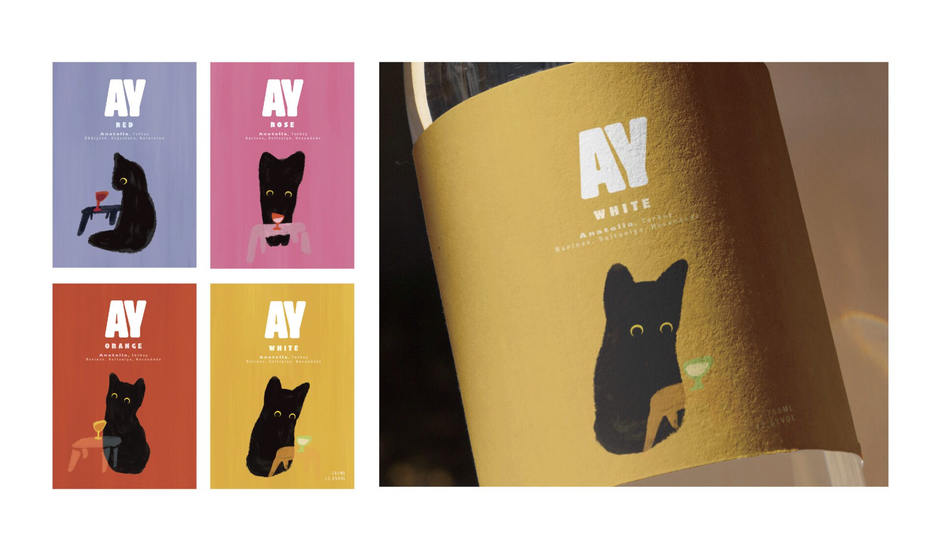 AY is a distinguished Turkish wine brand that proudly embraces one of Turkey’s cherished cultural symbols—the cat—by making it the brand’s natural ambassador. The name "AY," meaning "moon" in Turkish, poetically reflects the enchanting beauty of a cat’s eyes, reminiscent of the moon’s luminous glow. This unique concept pays homage to Turkey’s deep-rooted heritage and enduring affection for these beloved animals. The brand’s visual identity incorporates this cultural essence through crafted illustrations that convey AY’s national heritage and distinctive charm.