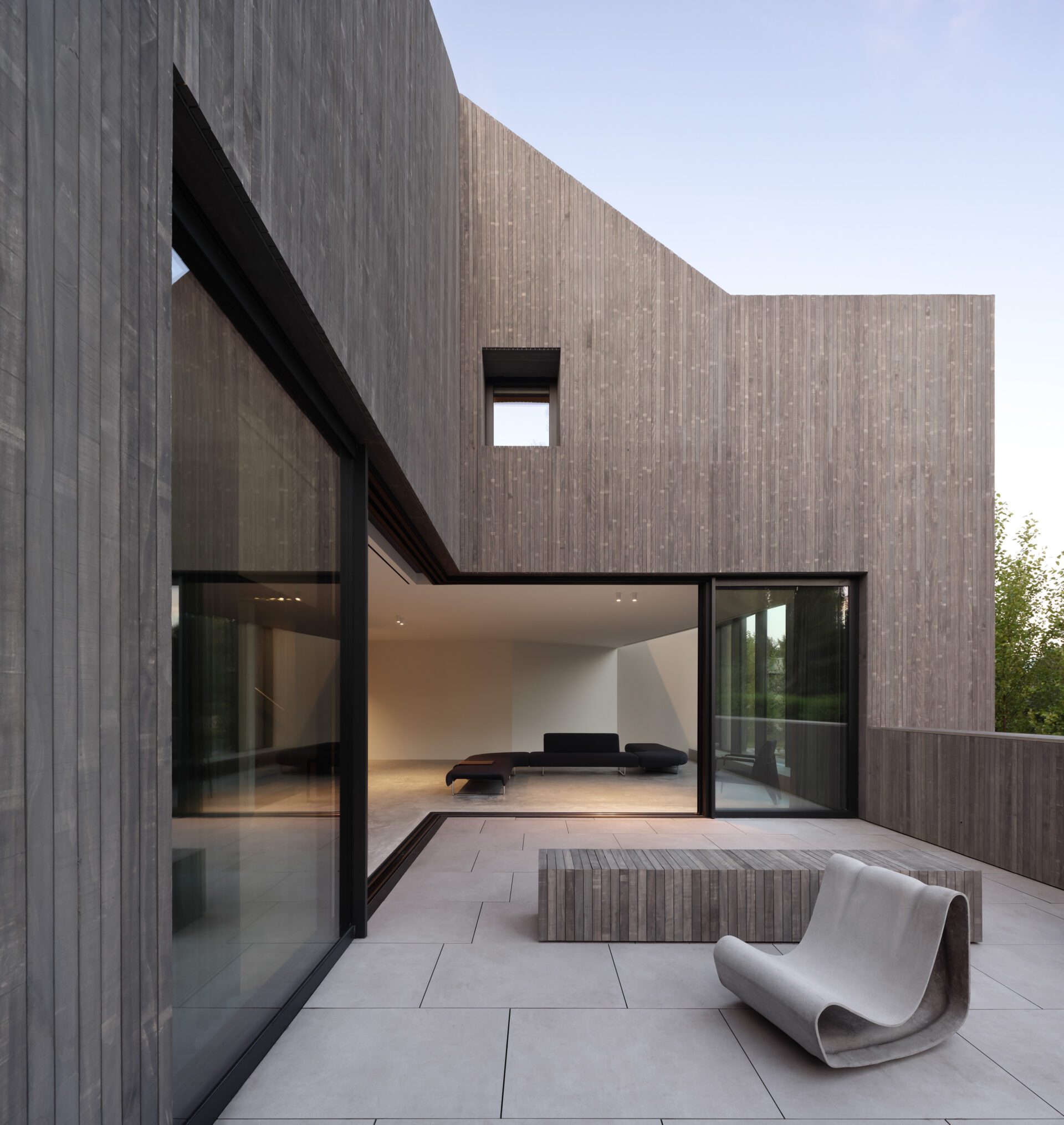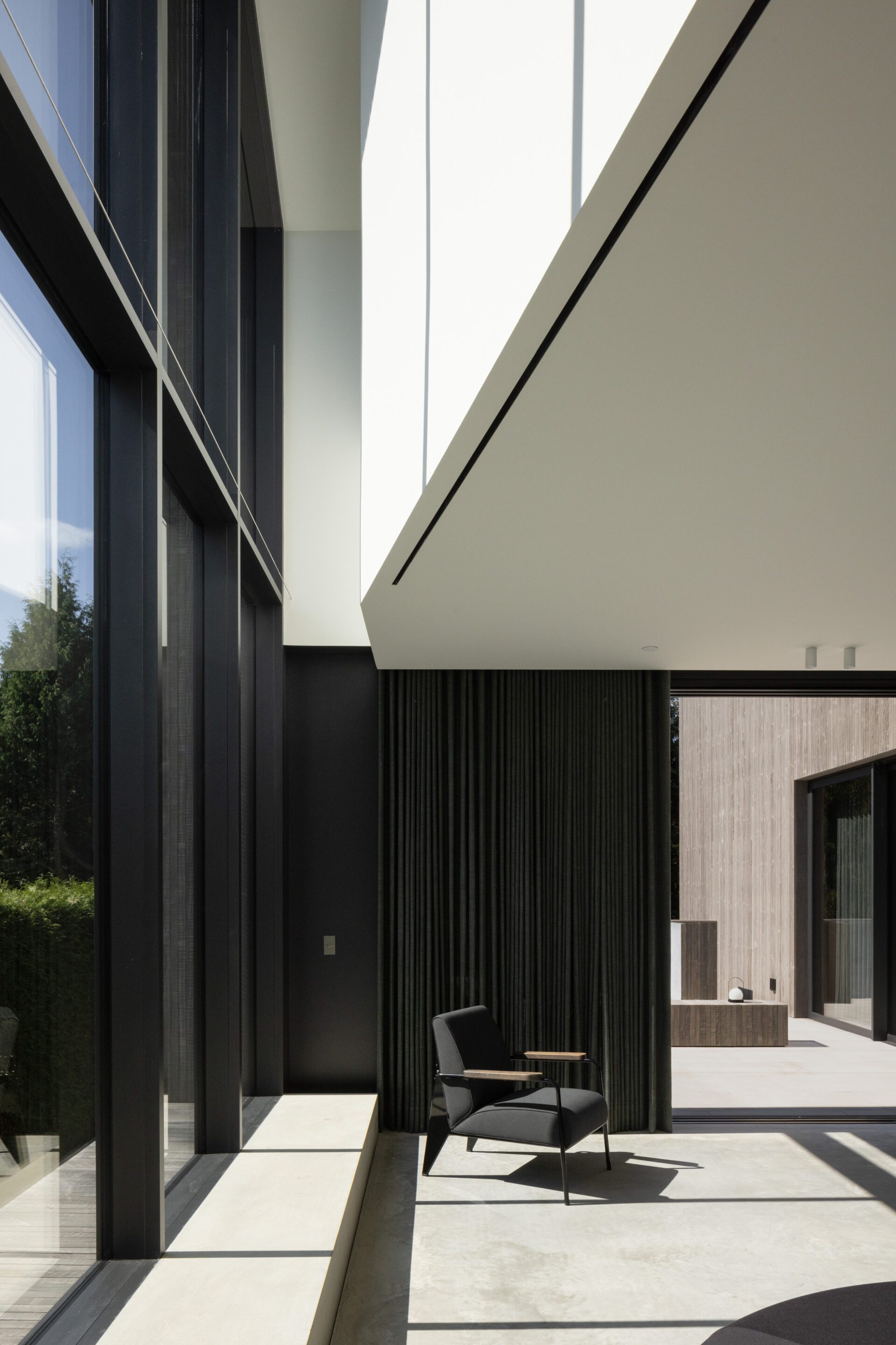 These ideas also translated into an effort to clarify the material choices of the house that support a conceptual understanding of the site. The house is located on a floodplain formed by a sediment deposit in the meandering bends of the delta of the Fraser River- the longest un-dammed river in North America. This land is vulnerable to periodic flooding, particularly during period when heavy rainfall coincides with high tides. Accoya, a naturally treated pine wood, developed in the Netherlands for use in ground-water contact situations (like the lining of canal walls) is used throughout the project. While its unique variegated "sticker" marks, an artifact of industrial processing, they also serve as a visual reminder of the wood’s acetylation process which makes it durable, stable and long lasting in water logged conditions. The wood has been left to naturally weather to soft grey tones that are reminiscent of the retained hemlock trees on the site. The lowest level of the house is constructed to endure these events. Finishes such as drywall and batt insulation are omitted to prevent water damage, and mechanical equipment is housed in a waterproof bunker.