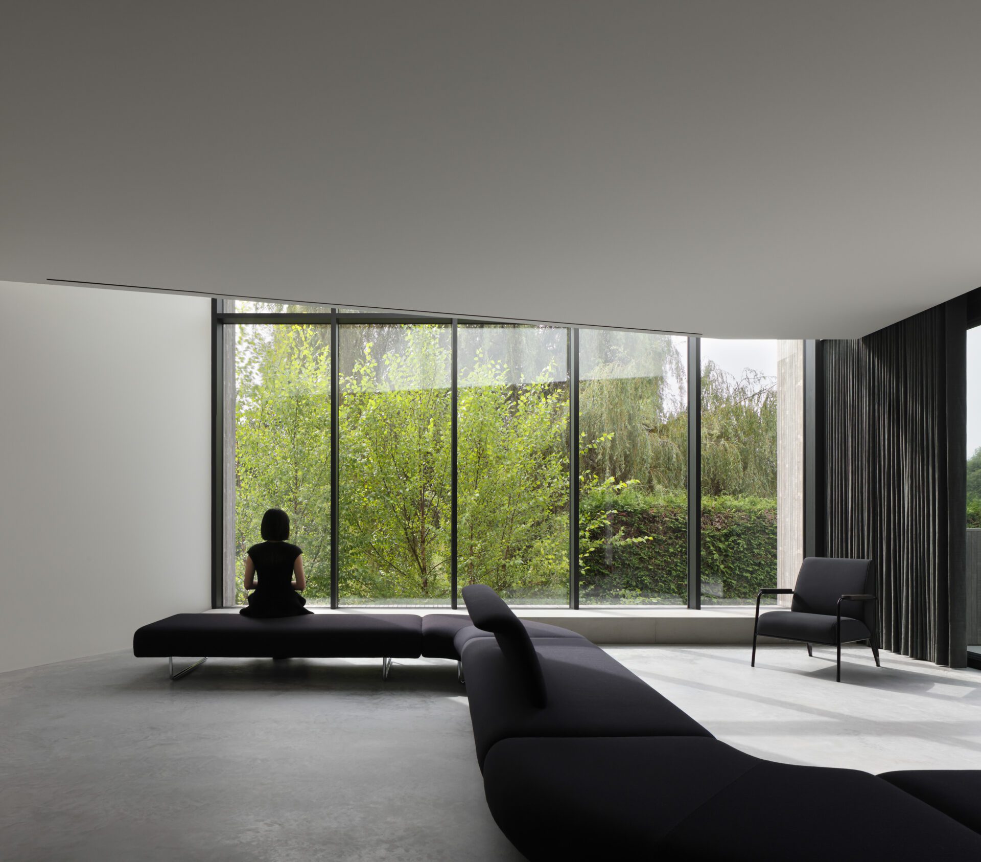 This client direction led us to an intervention that resulted in material and geometric clarification of the exterior planes of the house and the idea that these elements should also be reflected in interior spaces. Folded walls, ceilings and hovering floor plates (separated from walls) created flexible and irregular thresholds and angled prosceniums that encourage spaces to flow from one area to the next. Angled walls force movement through the house that is cinematic in nature. Glimpses of views, spaces and light can be seen around every bend. Because most spaces have a multifaceted reading efforts were made to blur normal programmatic signifiers like doors and hallways. Furniture is deliberately sparse and sculptural and, where it exists, is suggestive of several modes of occupation.