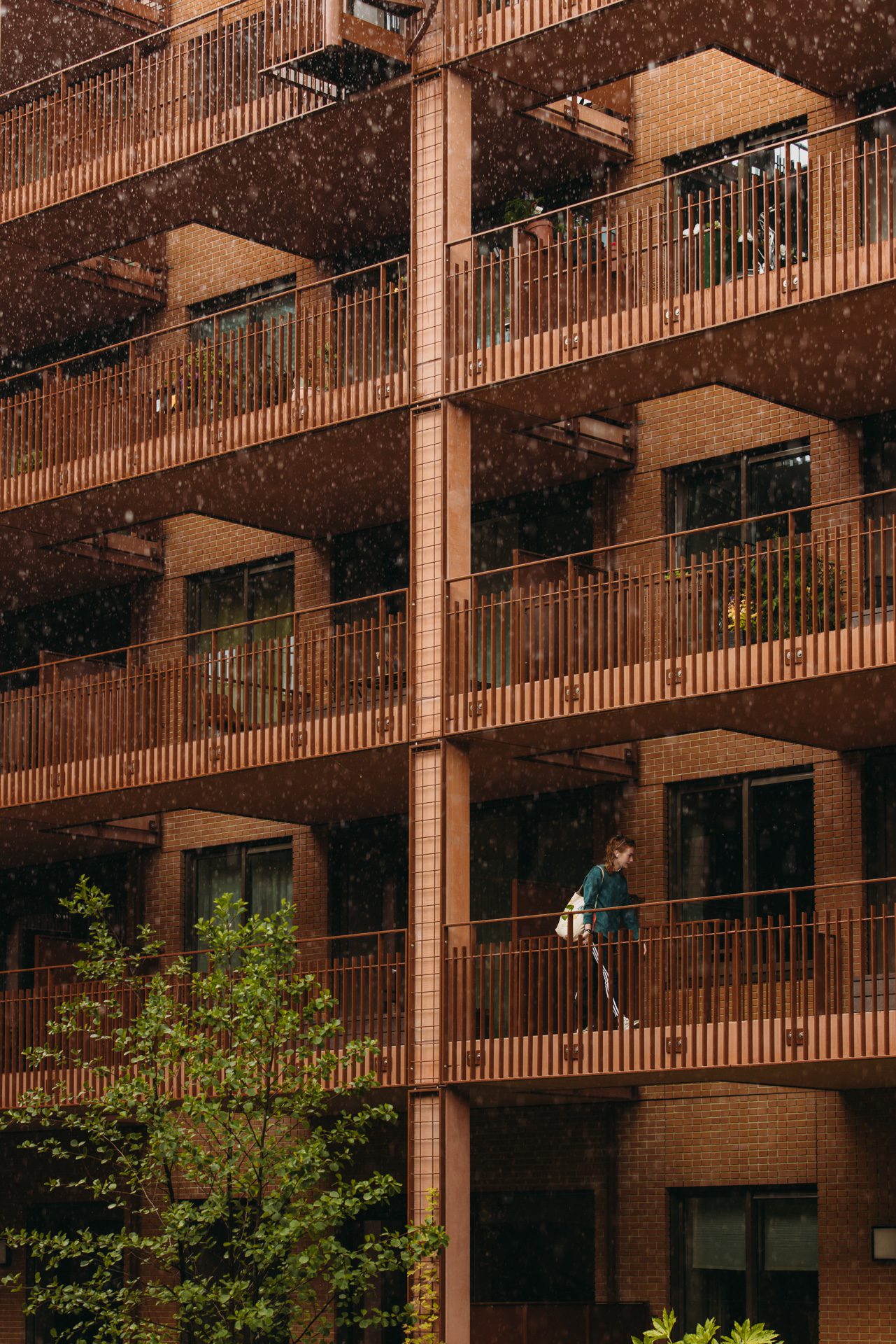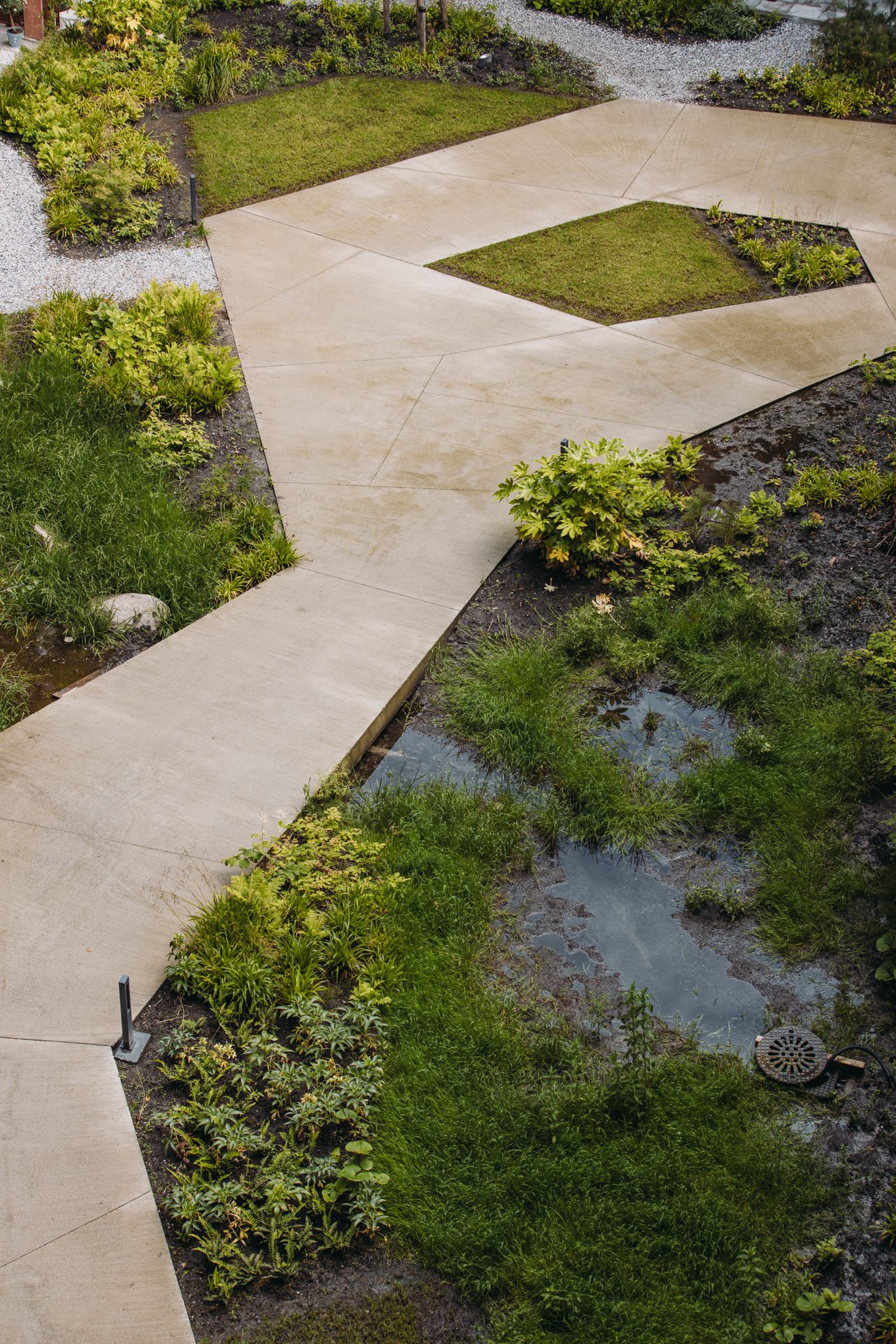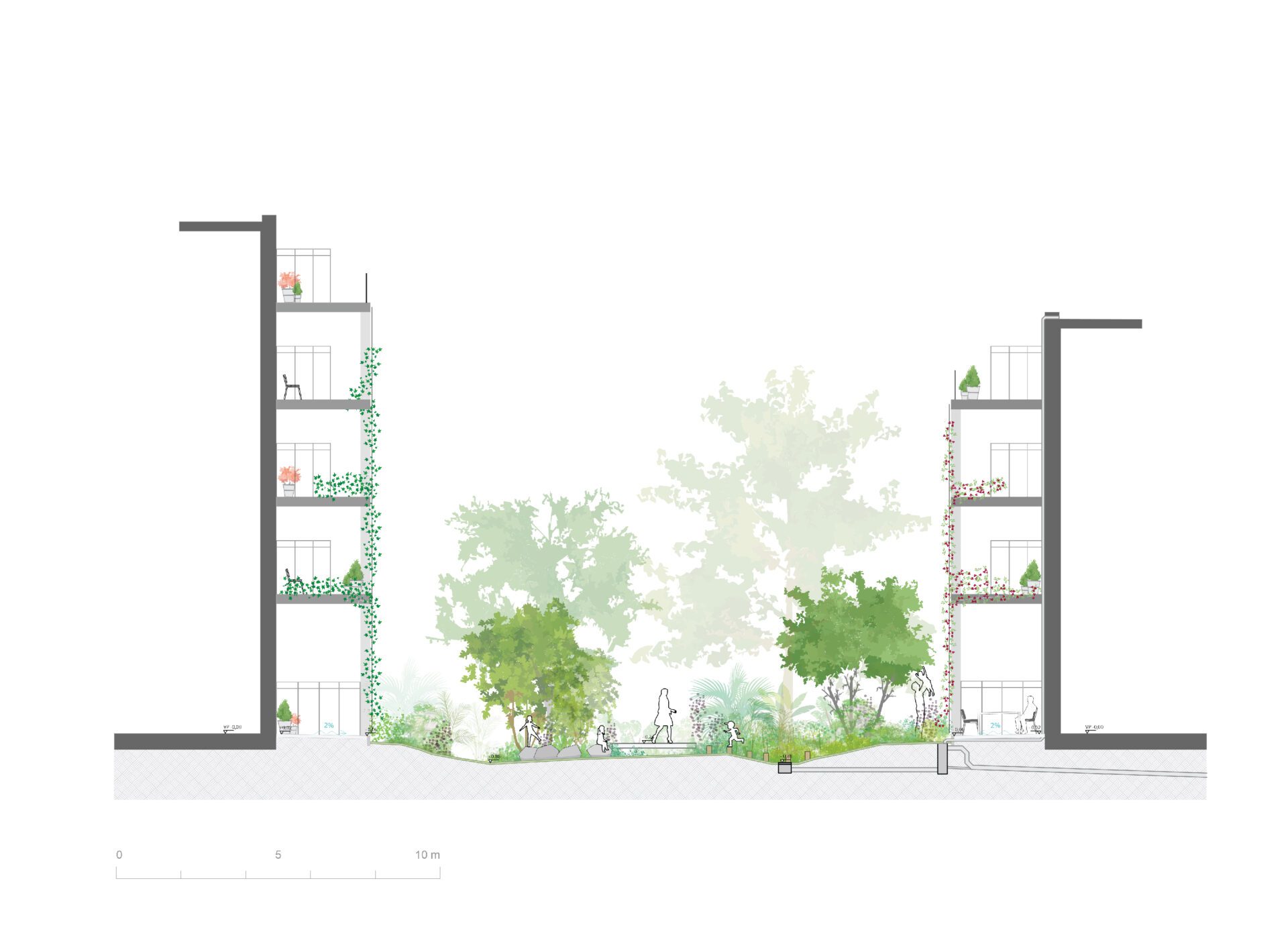 In addition to the inner garden, the building facades will come alive with vertical green. All plant species were carefully selected to endure wet and shady conditions, based on insights from an insolation study and water storage analysis specific to this courtyard.