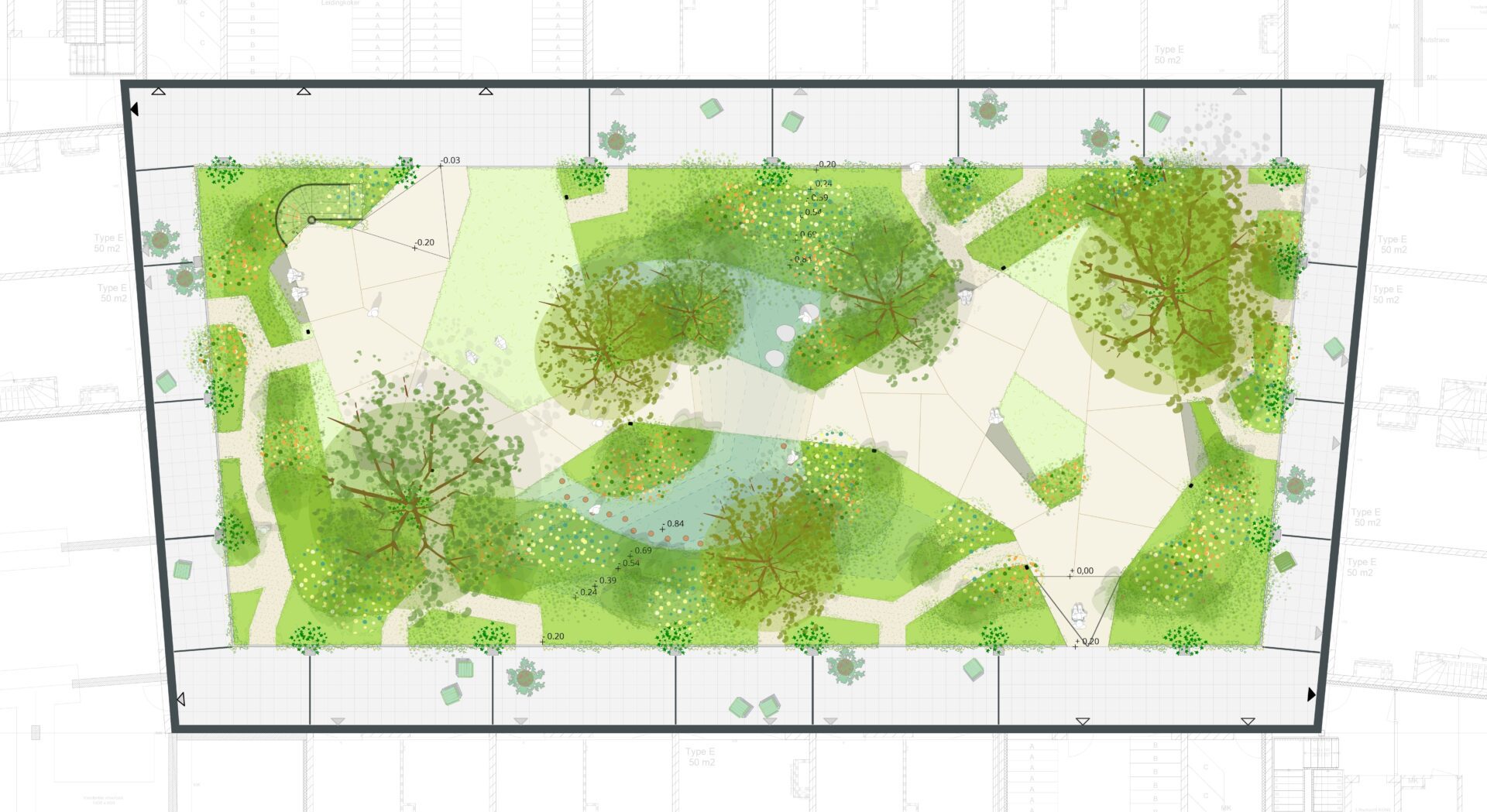Typical of the layout of the inner garden is that it consists of several layers and terrain heights. The garden has a flowery layer of grass, perennials in various heights, bushes, shrubs, trees and climbing plants. The undergrowth forms an attractive, dense cover of diverse leaf structures and natural-looking colors and blooms throughout the year. The ascending blooming accent layer creates a play between high and low; private and collective. It guides the eye of the resident through beautiful colors and structures and at the same time offers space and privacy for the terraces on the outside. In addition to the middle layer, trees create volume that separates private gardens from the collective courtyard.