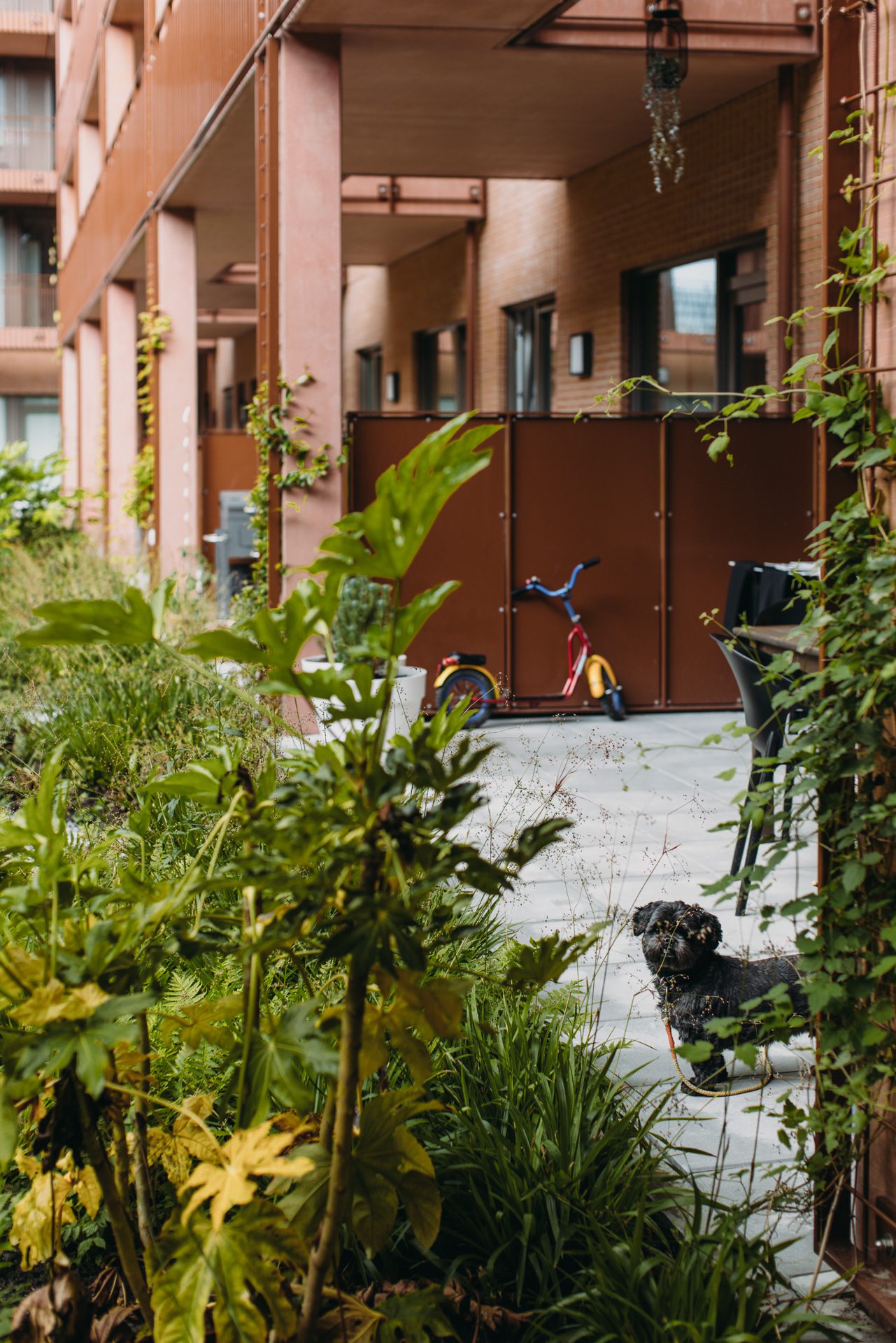 The courtyard of the Regulateur is an attractive green oasis that has been designed in a climate-adaptive manner. Because parking has been solved centrally in the neighborhood in a parking house, space for greenery and social encounters could be realized in the inner garden. In line with a future-proof courtyard, various climate-adaptive measures have been included in the design, such as delayed rainwater drainage, wadis and a wide variety of planting in different layers.
