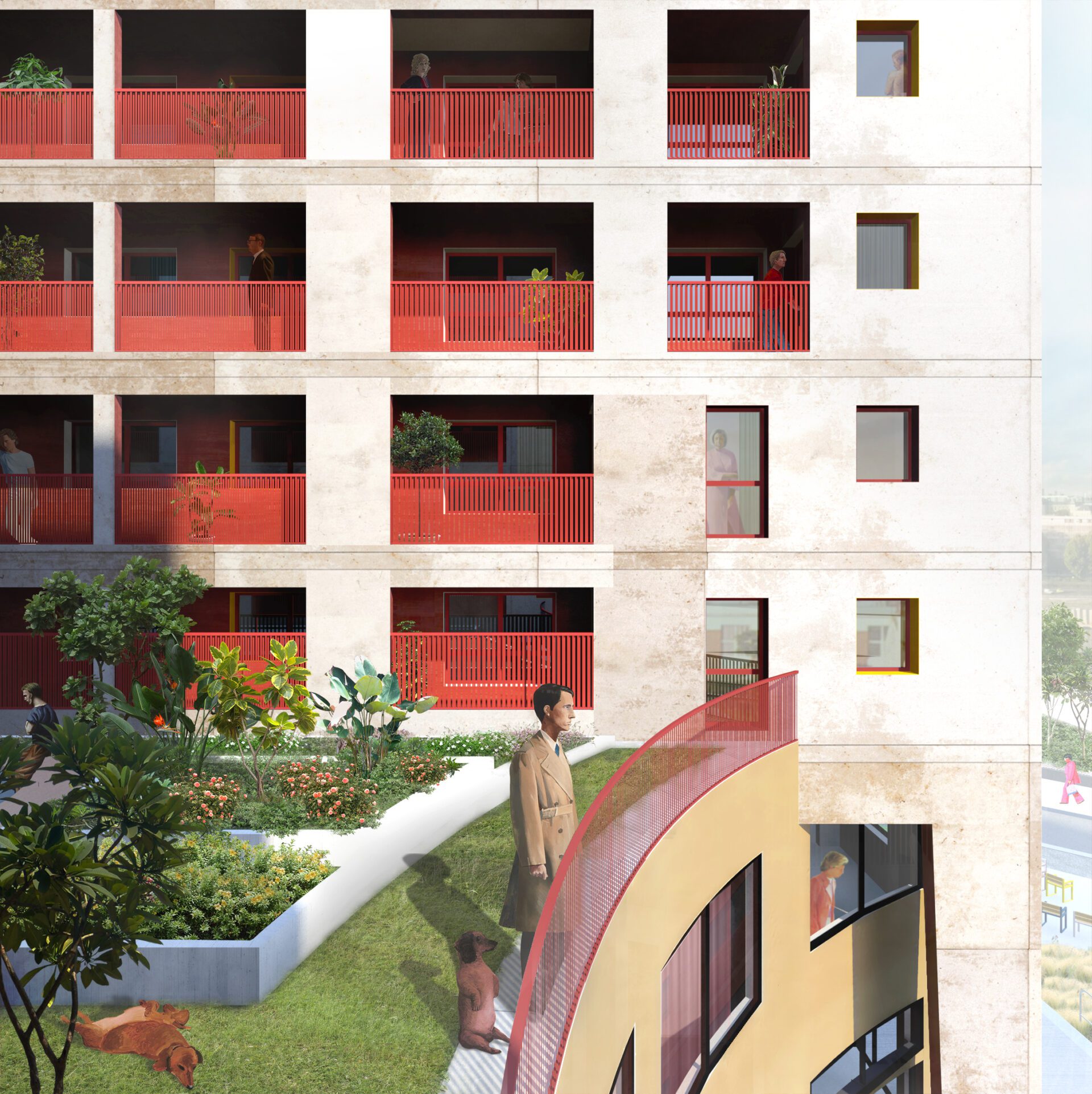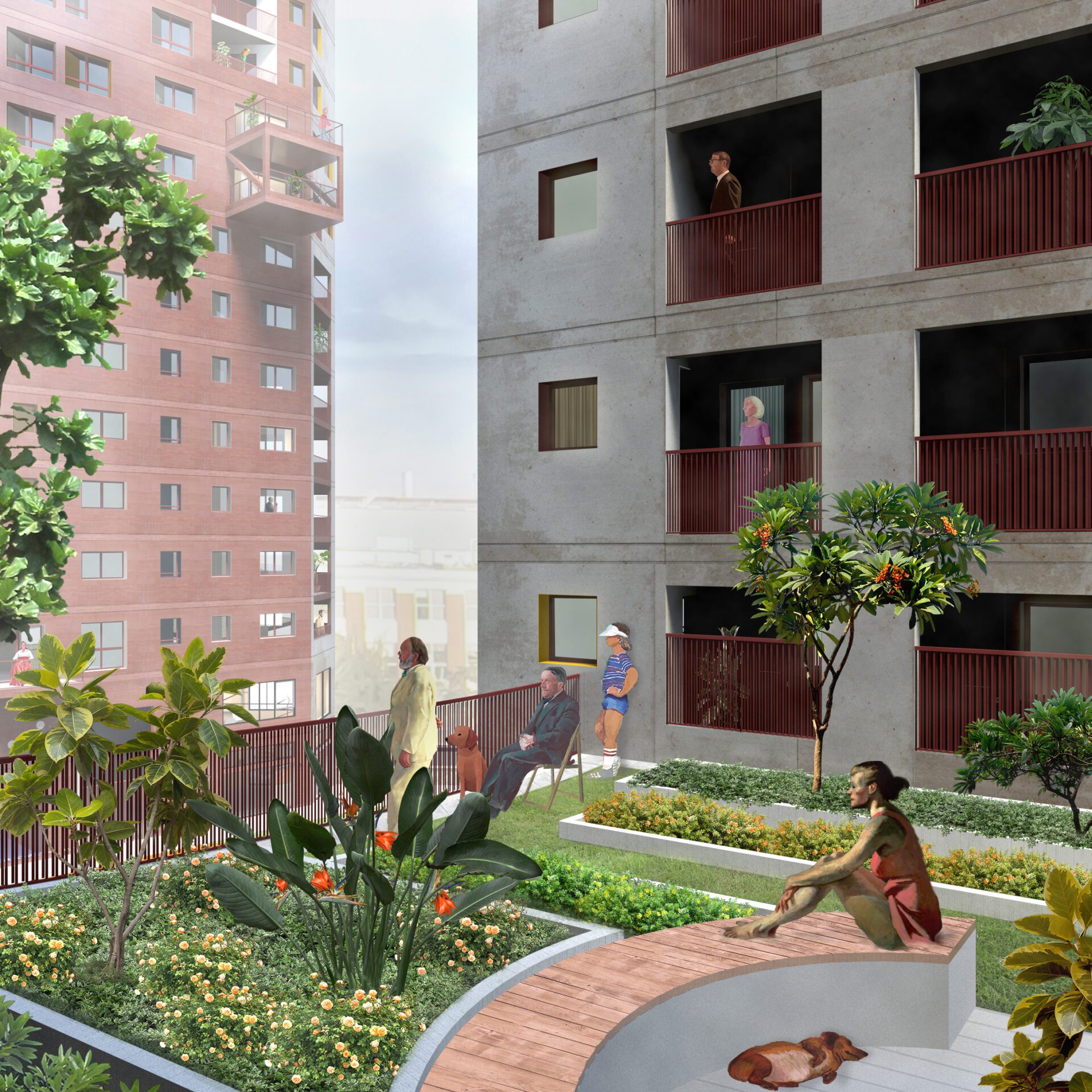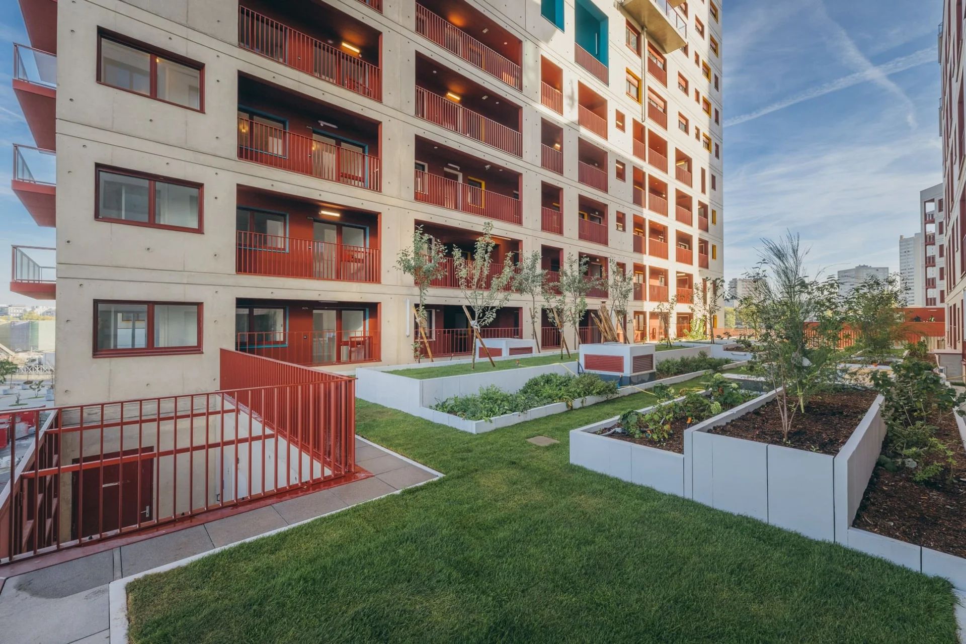 Due to the high density, START includes 2,600 m² of public space on the ground floor and a total of 2.119 m² of common terraces and roof gardens at different heights. One of the roof gardens is “8 Stripes, 1 Rectangle and 1 Circle”.