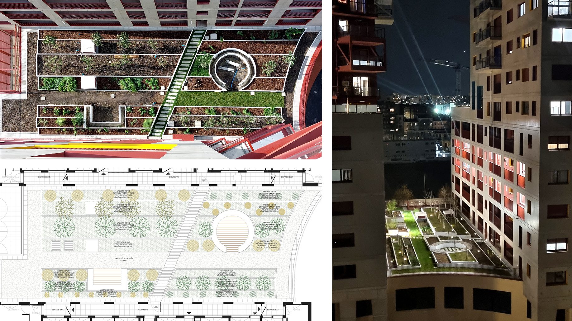 The roof garden with “8 Stripes, 1 Square and 1 Circle” is a large common terrace located in the residential complex “START” in Ivry-sur-Seine in Greater Paris, France.