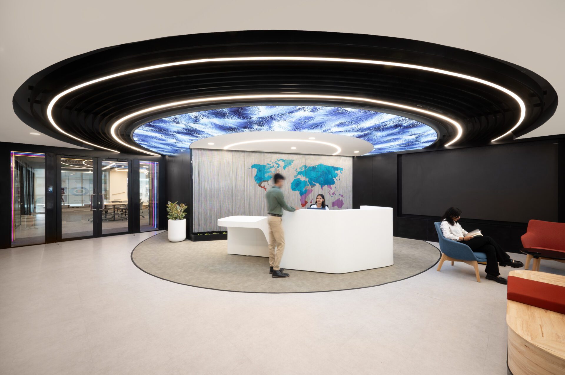 • The reception area sets the tone with a fluid stretch ceiling that pulses in waves of blue and violet — a visual echo of data flow. Overhead, a printed world map rendered on interlinked chains symbolizes global connectivity and the organization's expansive reach.