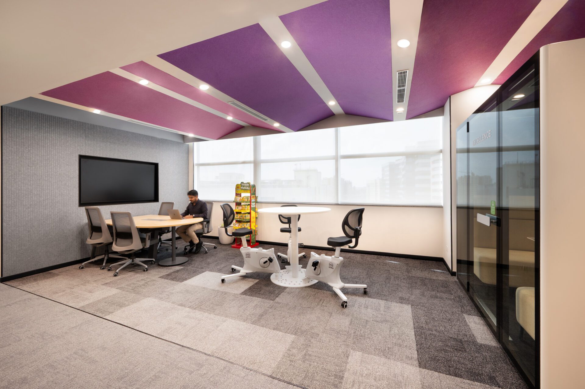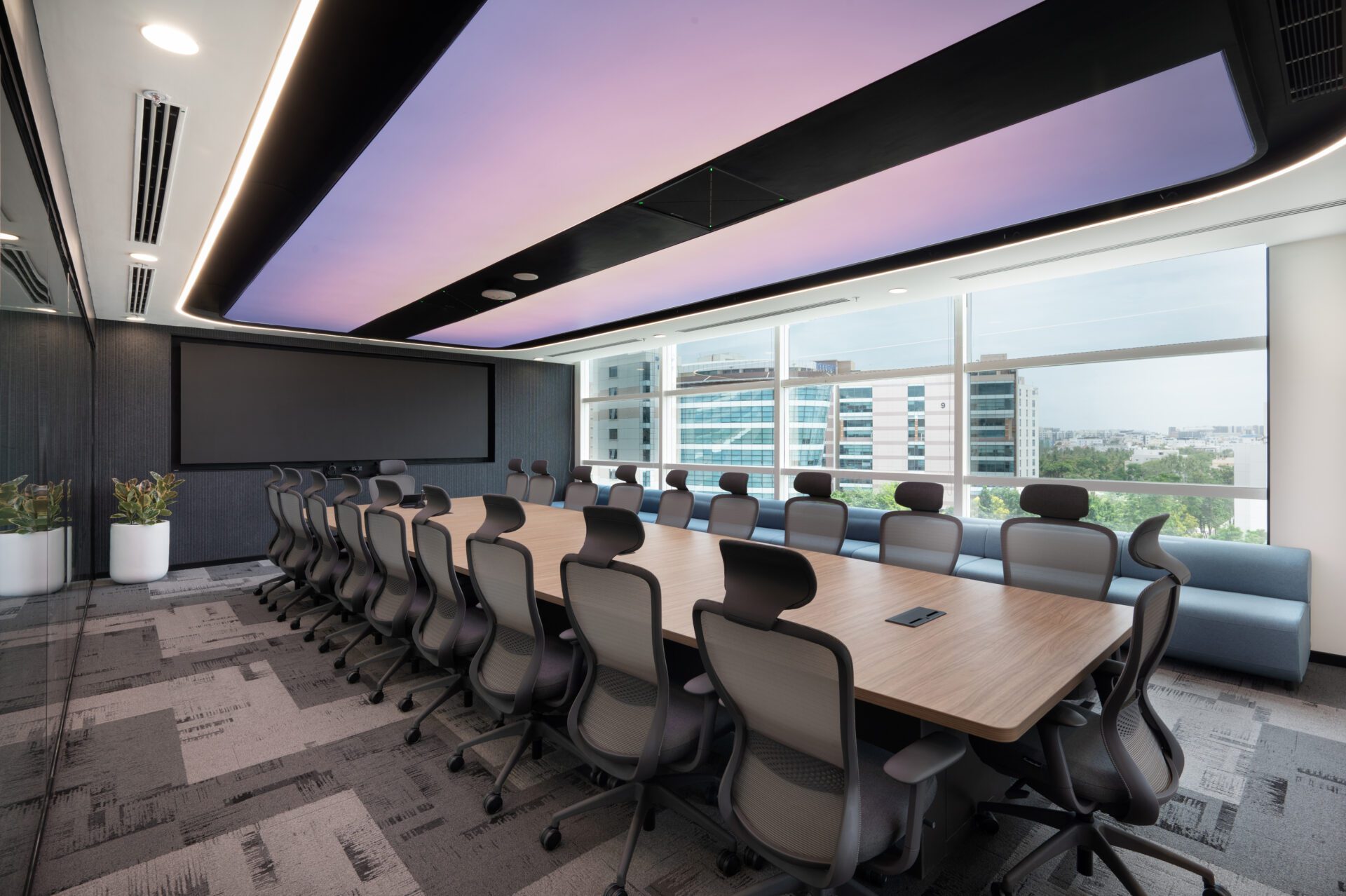 • The Boardroom is defined by a gradient-lit ceiling panel, responsive lighting via LMS, ergonomic chairs, and a built-in bench for overflow seating.
