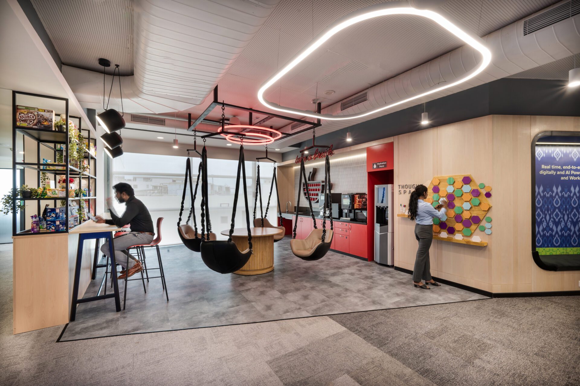 • In the Pantry, suspended swing chairs, a product showcase, and a red-toned counter energize the everyday break.