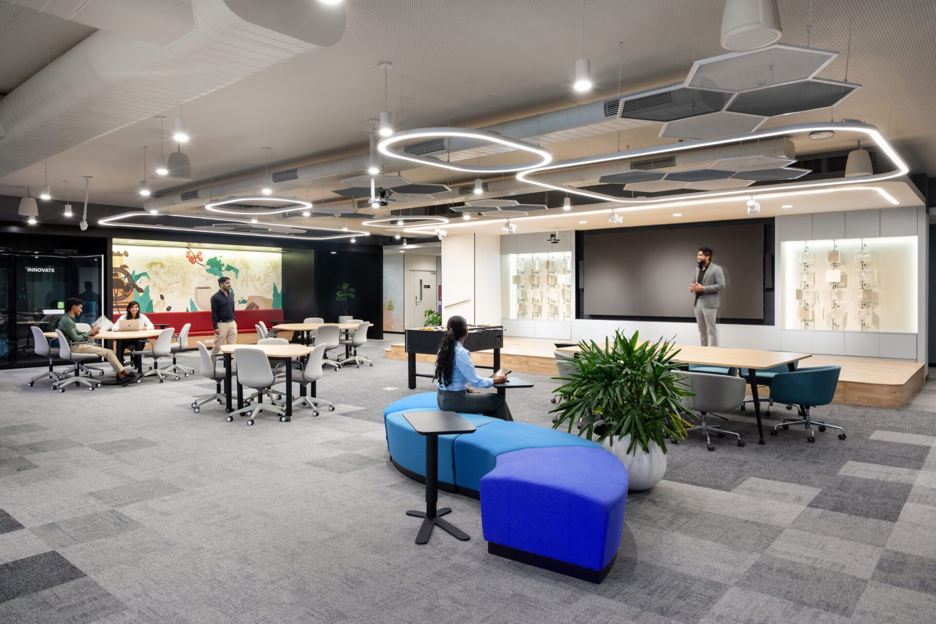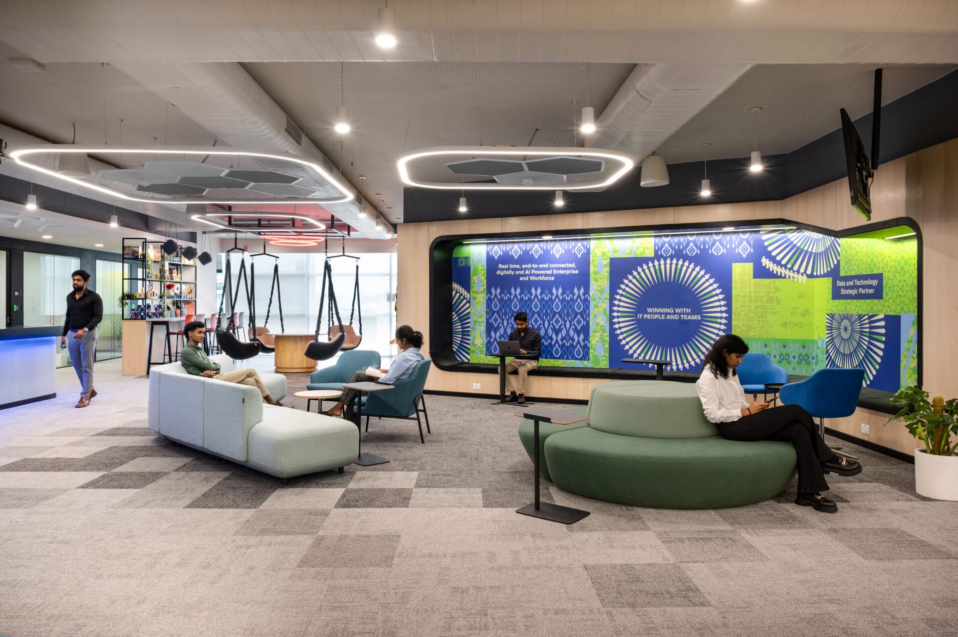 • The Townhall, placed centrally, is a high-energy, multipurpose space for team huddles, cultural showcases, and breaks — anchored by a stage, LED halo lighting, and Ikat-inspired graphic storytelling that celebrates local identity within a global narrative.