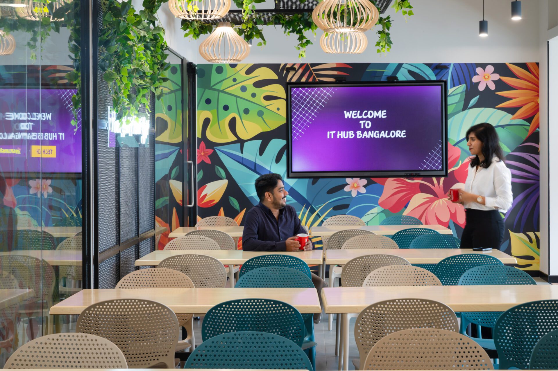 • The Cafeteria bursts with life — botanical murals, pastel perforated seating, a green trellis ceiling, and a glowing “Good Food, Good Life” neon statement.