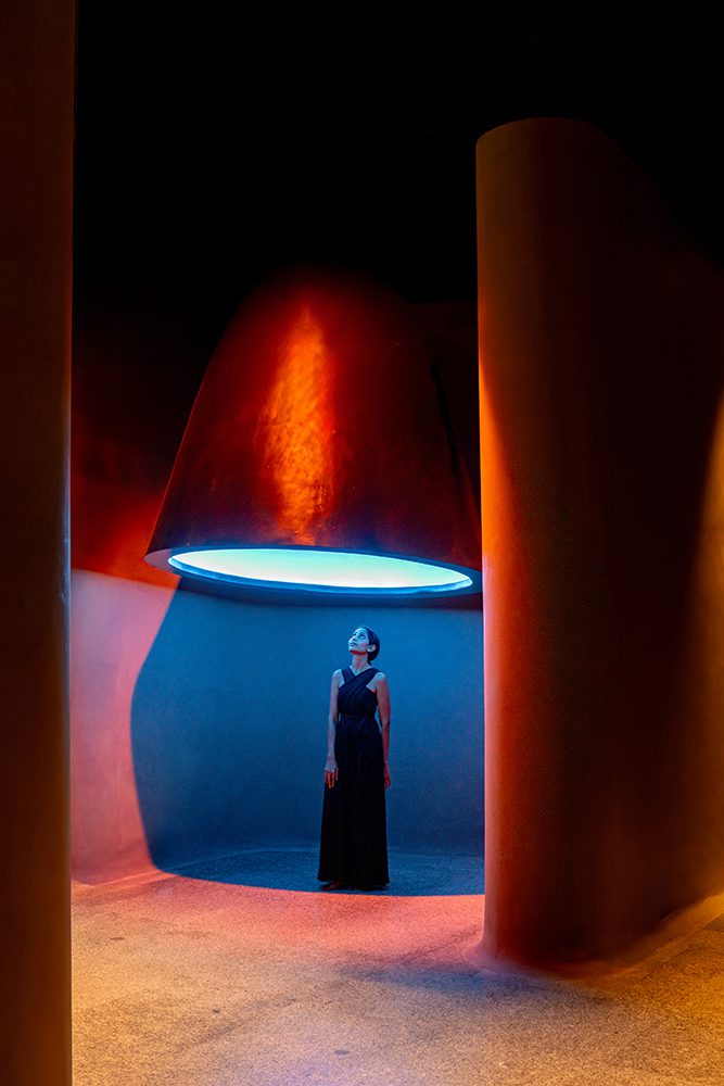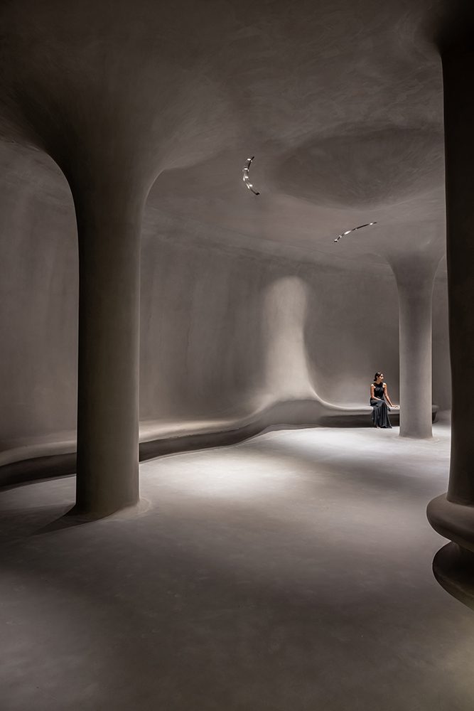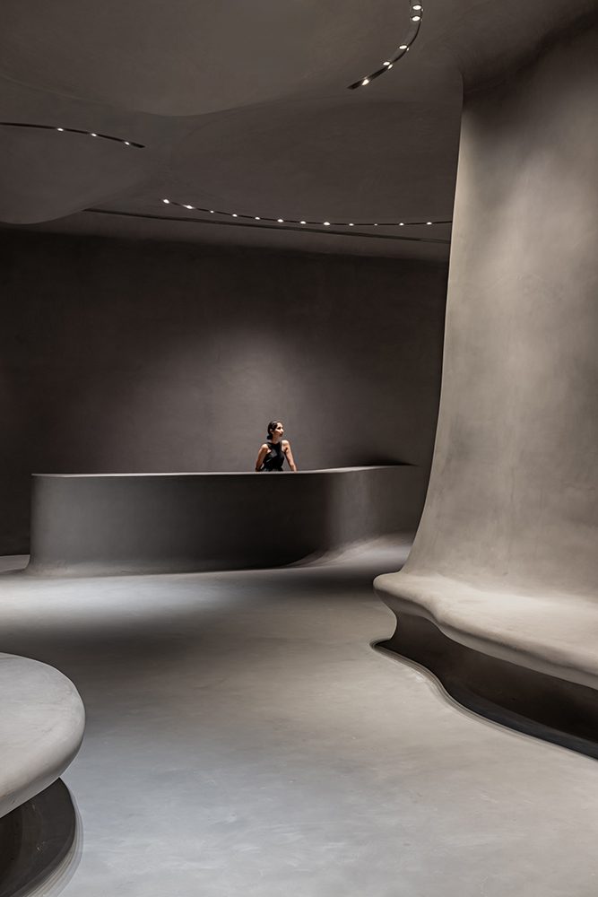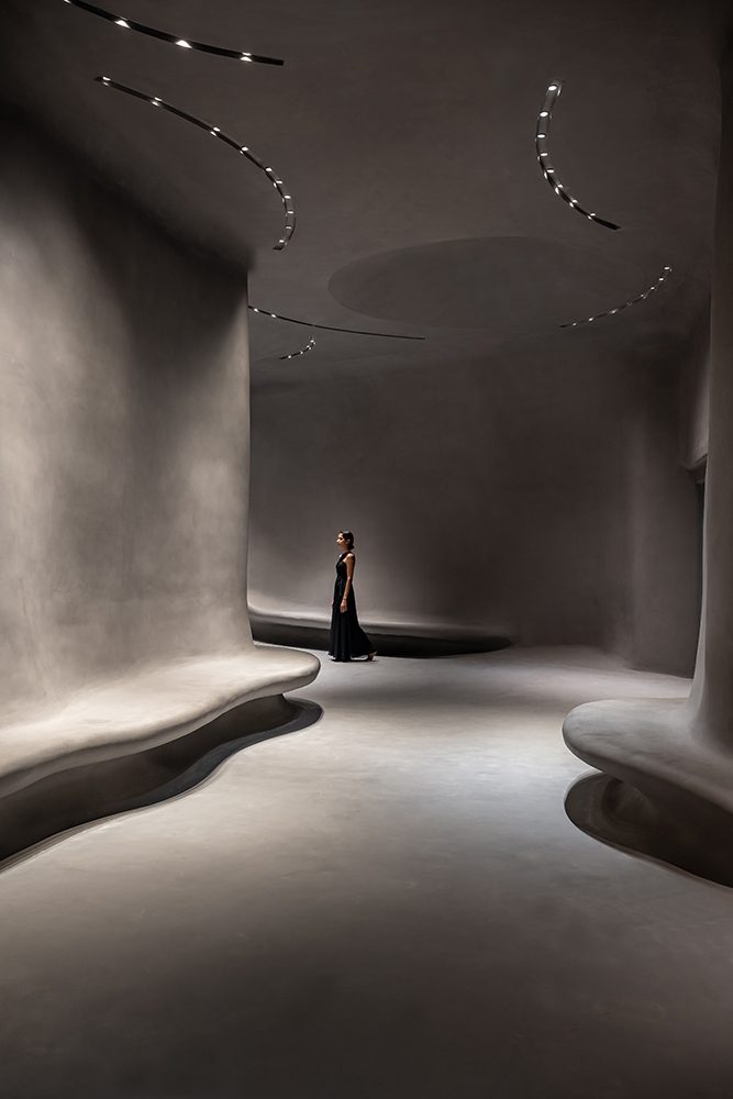 THIS SCULPTURAL VOLUME ENVELOPED IN A CONCRETE GREY CALMS THE VISITIORS, TRANSPORTING THEM TO A TRANQUIL STATE PRIOR TO ENTERING THE 18 SEQUENTIAL ZONES CREATED.