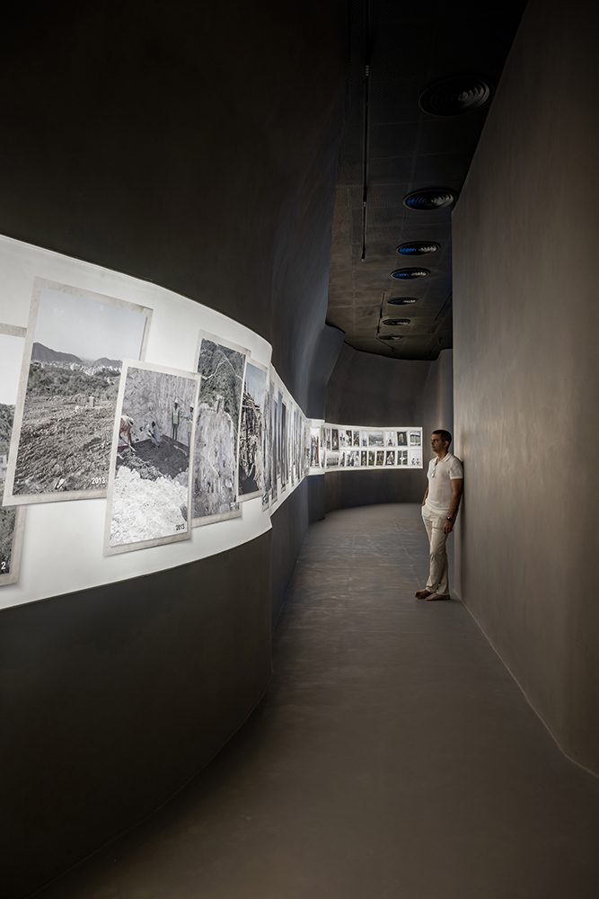 THE VISITORS ARE LED FROM THIS CAVERNOUS ENTRANCE TO A NARROW UNDULATING CORRIDOR WITH IMAGES POTRAYING THE MAKING OF THE MUSEUM. POST THIS; EACH ROOM IS ENTERED ONE BY ONE WITH DIFFERENT THEMES CONVEYED THROUGH AUDIO VISUALS & IMMERSIVE EXPERIENCES.