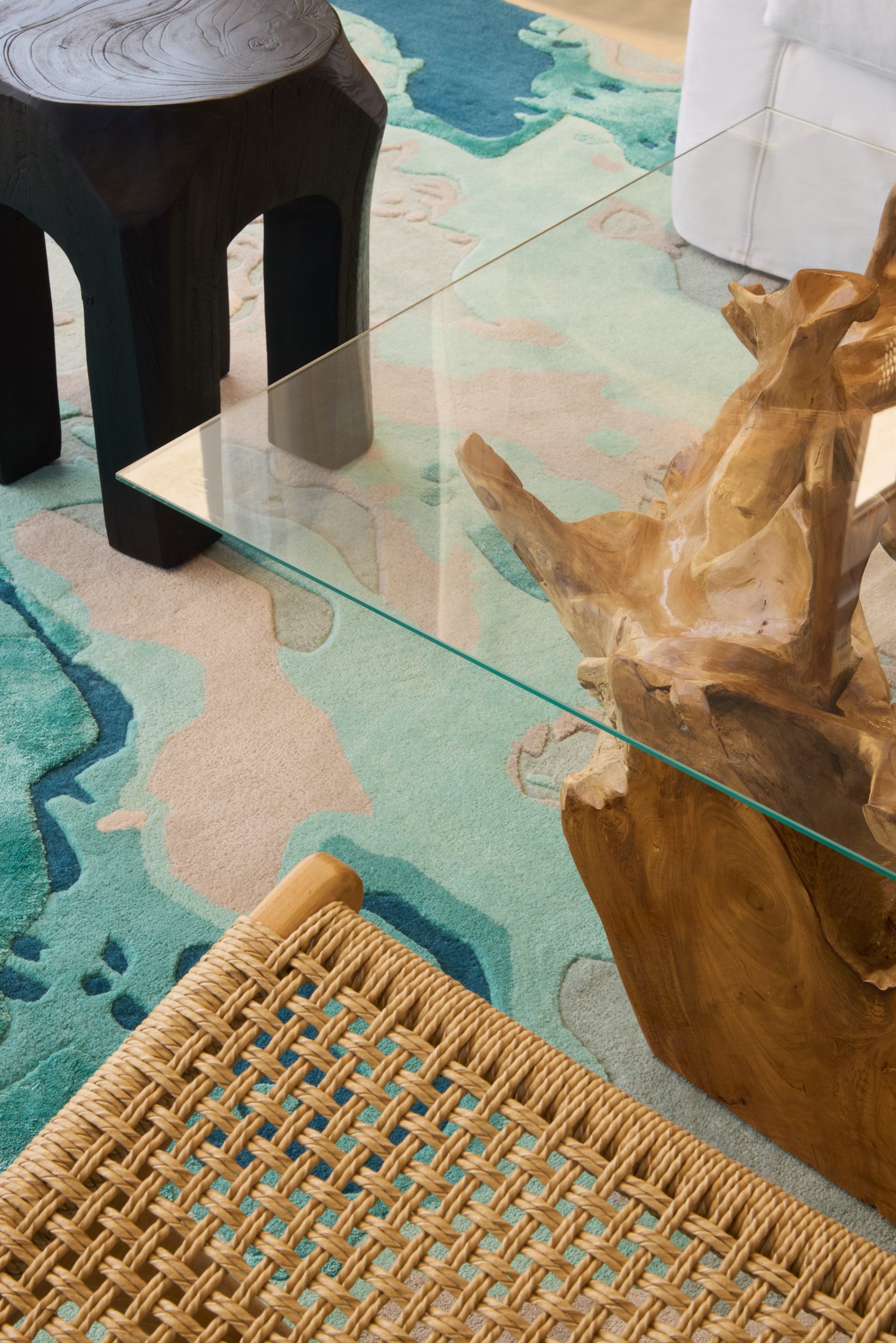 The color palette embraces earthy tones, terracotta, reclaimed wood, rattan, and natural stone — creating a grounded, timeless atmosphere. These soft neutrals are complemented by subtle accents of blue, drawn directly from the surrounding island landscape, adding depth and vibrancy while completing the immersive Mediterranean narrative.