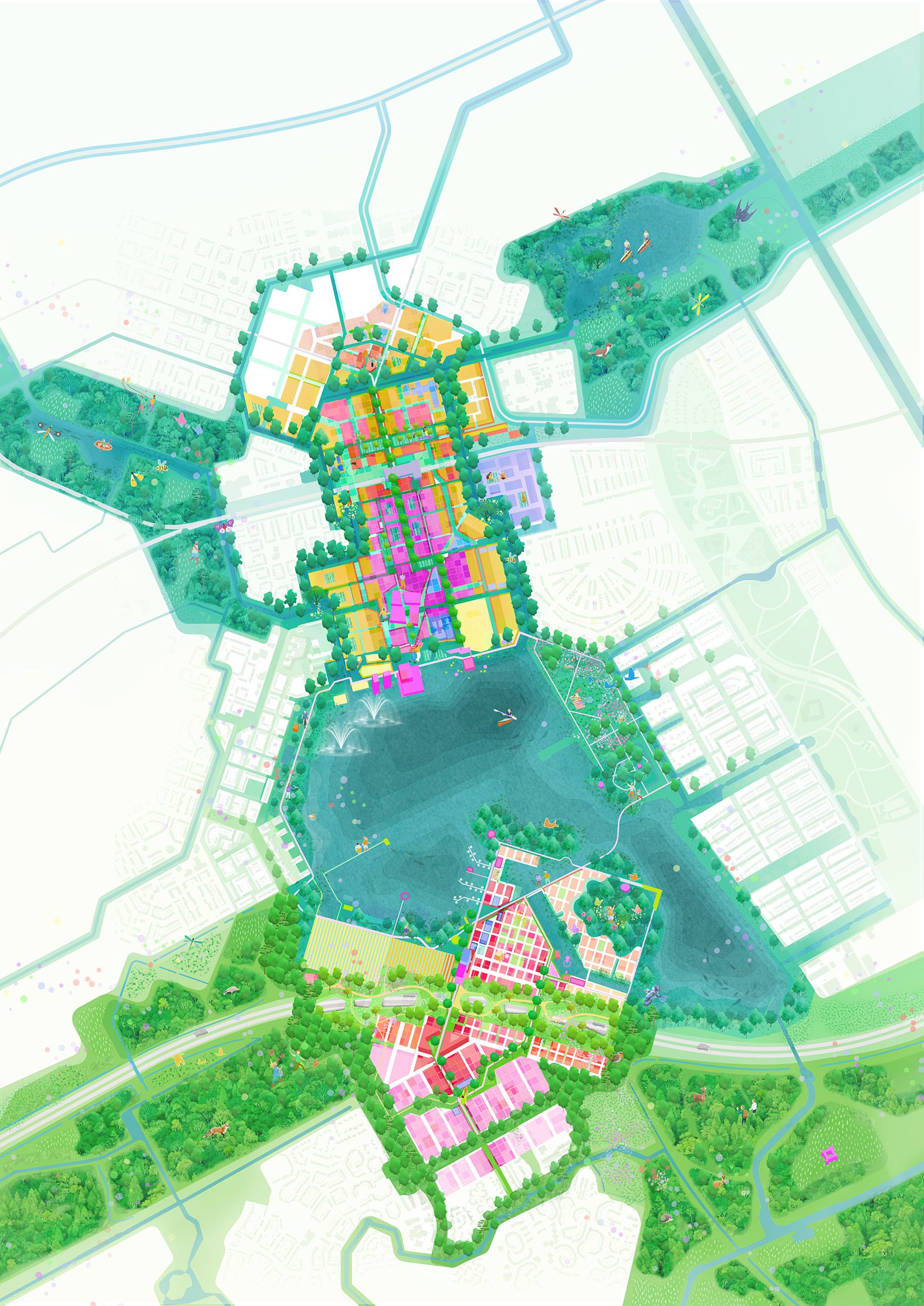 By 2040, the center of Almere will transform into a more vibrant, urban, and green heart. On behalf of the municipality, a vision has been brought to life by Felixx + PosadMaxwan that focuses on densification to enhance nature. Utilizing a nature-based solutions approach, the development integrates programmatic goals with Almere's ecological framework. The strategic positioning around expansive open water, complemented by a network of canals and parks, contributes to creating a distinctive urban environment conducive to living, working, learning, and leisure activities. Having received approval from the Board, the Development Plan is poised for submission to the City Council.