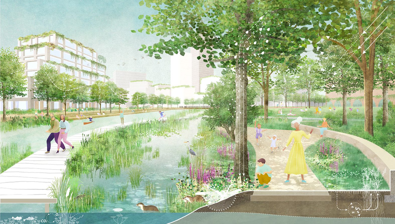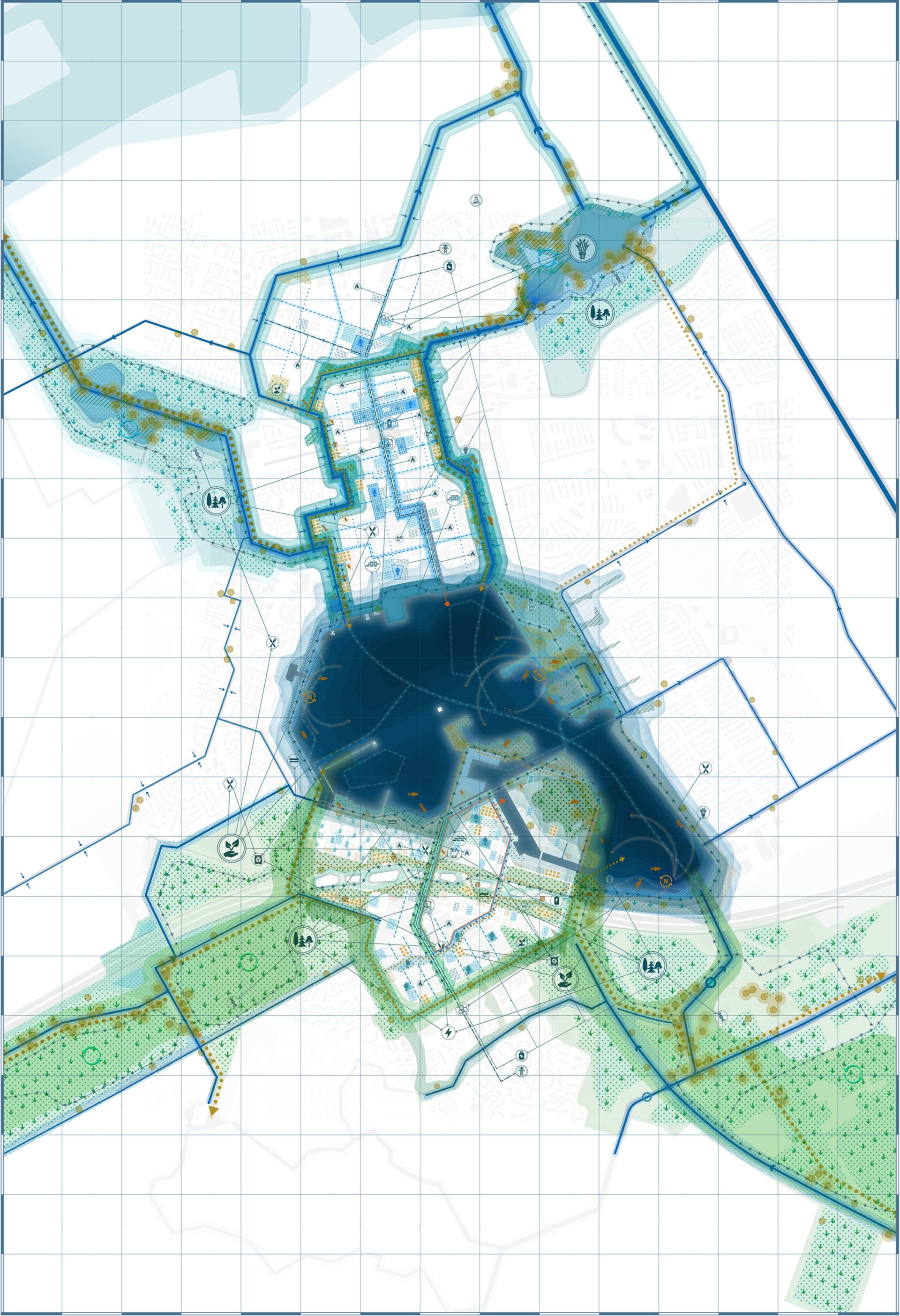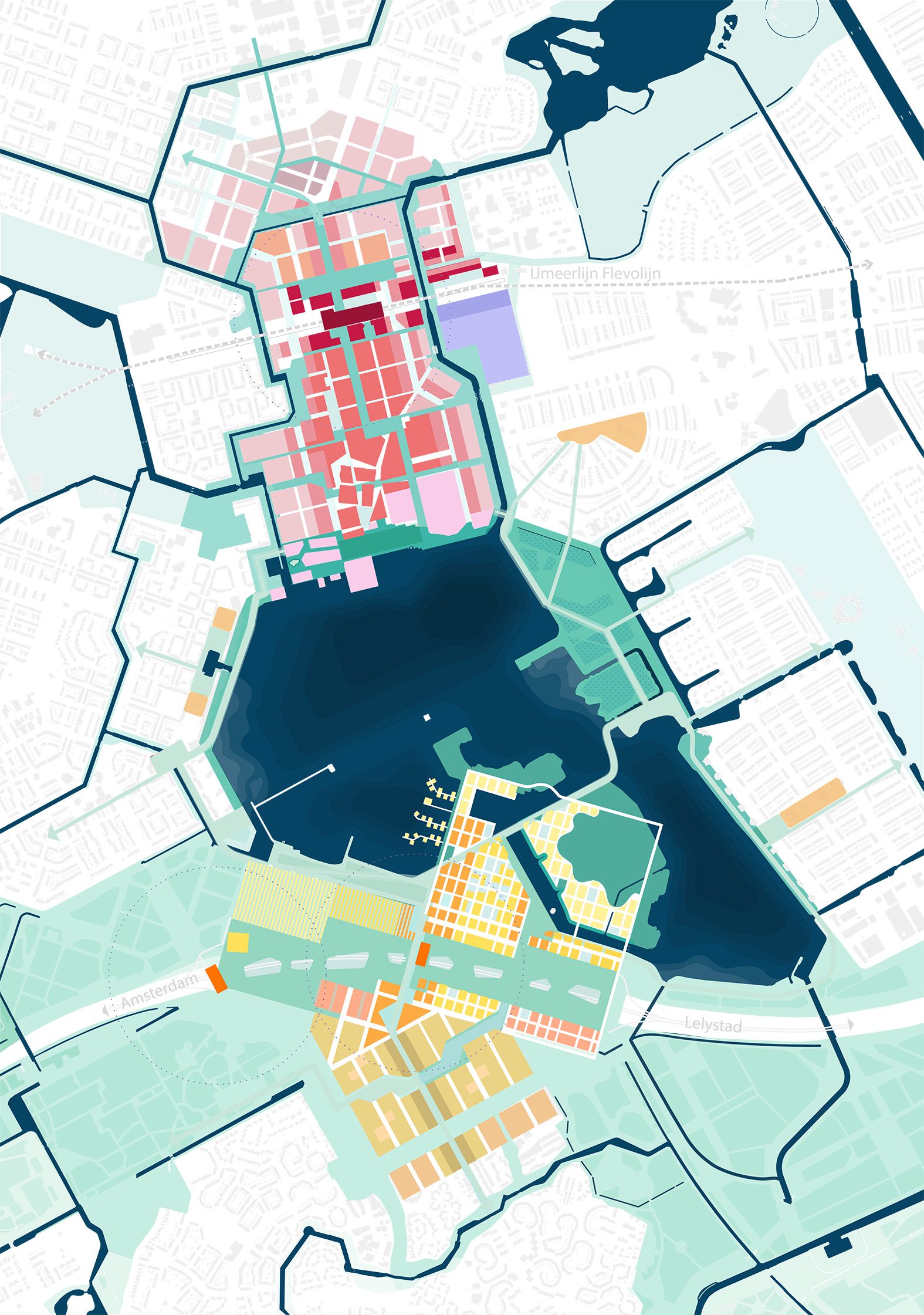 Almere stands out for its unique multi-nuclear structure, which finds its roots in the 'Garden City' principle. This concept is deeply ingrained in the city's identity, with its development heavily influenced by a green-blue framework. For the first time in Almere's history, a concerted effort is being made to expand, transform, and densify its urban area on a larger scale. With the use of nature-based solutions as a guiding principle, the city is undergoing a significant transformation, resulting in a completely revamped urban landscape. This transformation entails extending the green-blue framework into the very fabric of its center, where buildings seamlessly blend into public spaces to create an adaptable urban environment. At the core of this redevelopment is the transformation of Weerwater into a vibrant ecosystem, maximizing its potential to provide essential ecosystem services and becoming the pulsating heart of Almere's landscape.
