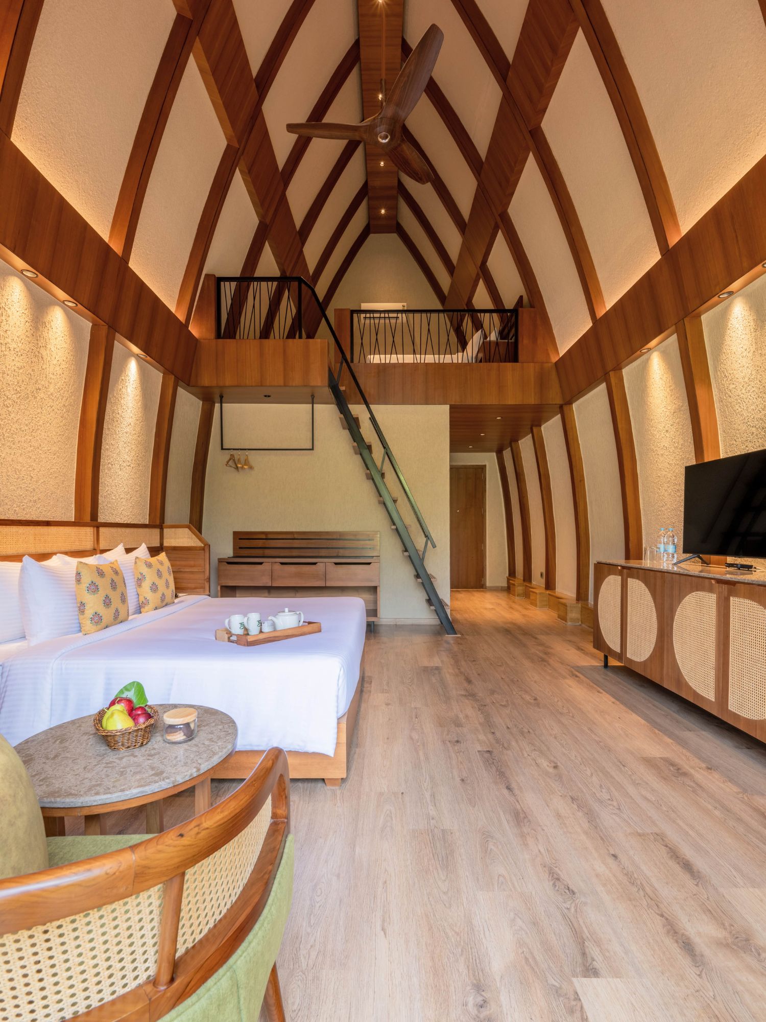 Reminiscent of a bamboo grove, the Bamboo Villas stand by each other in a circle. Unimposing in their light form, their angles emulate the natural characteristics of the wondrous grass. The roof curves inwards, much like a pathway lined by bamboo shoots that lean towards one another. Muted earthy tones of the cane furniture within complement the bamboo grove and cladding in the front verandah, contributing to a soothing atmosphere. The interior embraces calming green and brown tones inspired by its namesake. Rattan furniture and exposed wooden rafters pair perfectly with the green furnishings, creating a serene, nature-infused ambiance. A cozy loft with an additional bed adds a sense of intimacy, evoking the feeling of being nestled among bending bamboo groves.