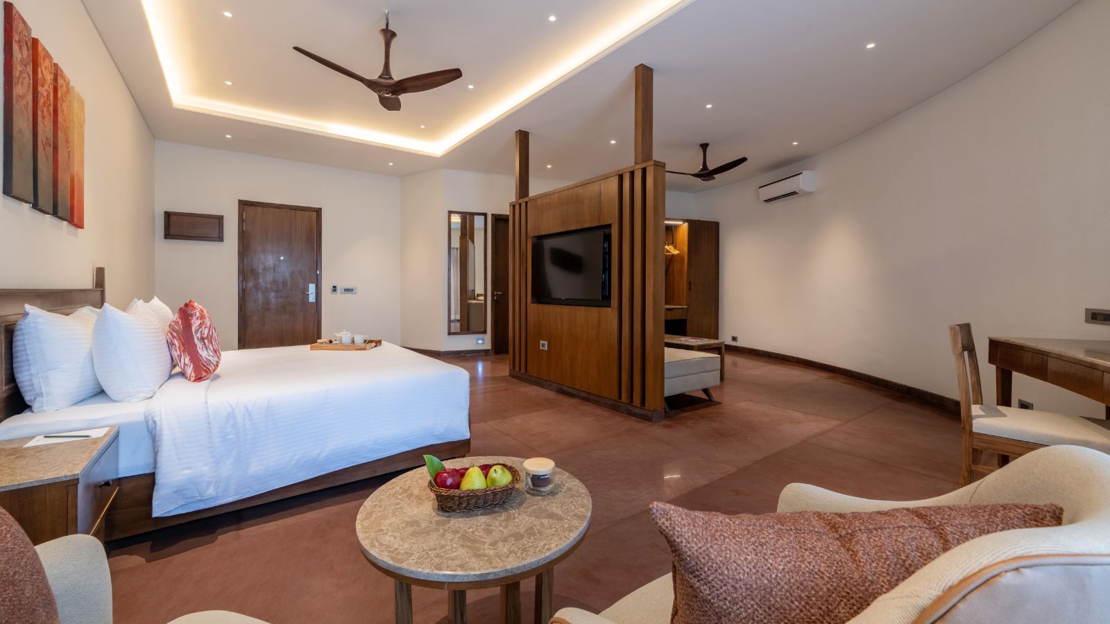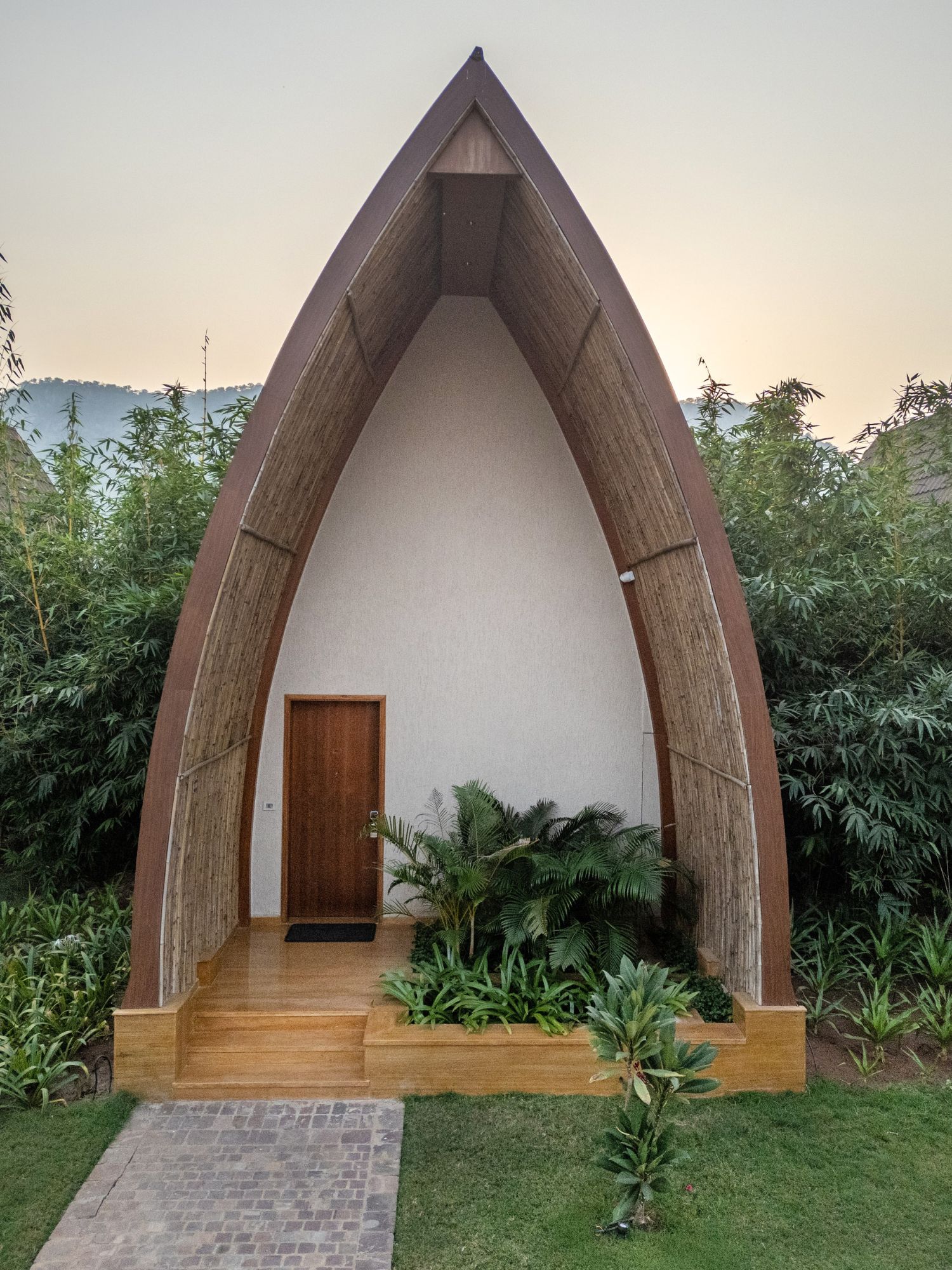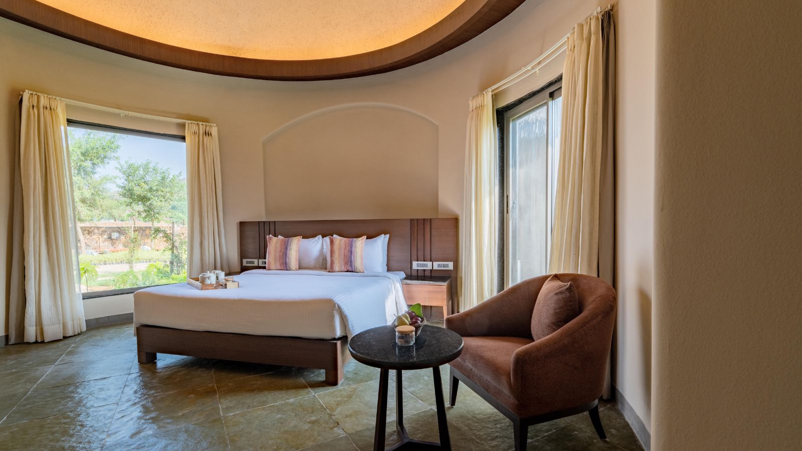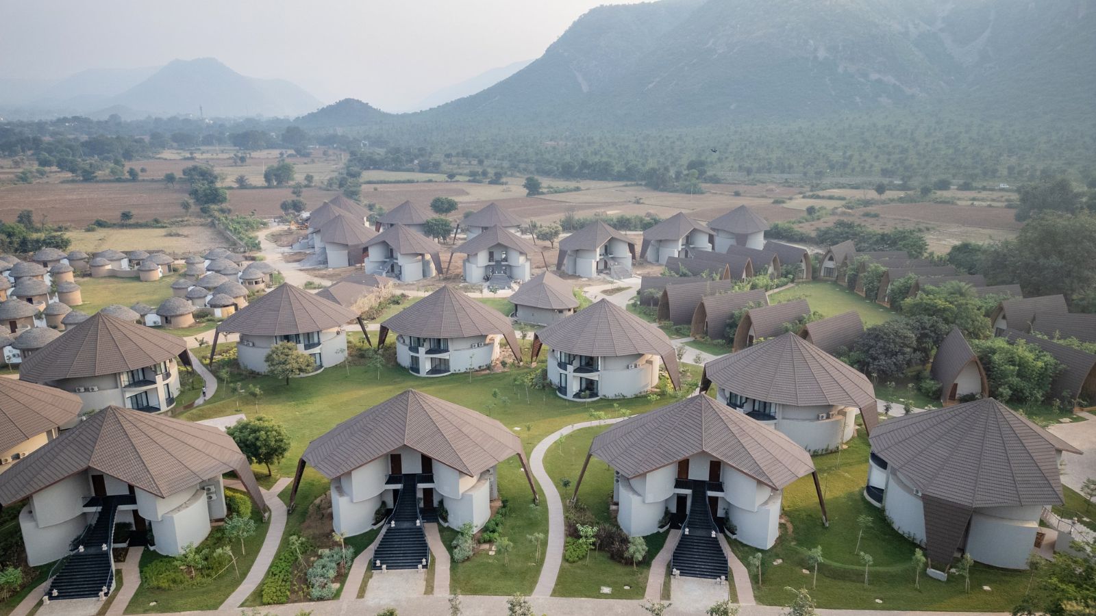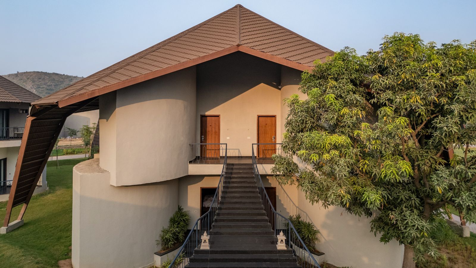 The Earth Villas represent vernacular mud architecture forms of Rajasthan. The fluid forms of the facade are derived from the Rajasthani Bhonga houses, a circular mud structure with a conical thatched roof. The result is a sturdy and culturally-rooted structure. The interiors provide a warm and intimate retreat. Defined by soothing beige and brown tones and natural materials like stone and wood, they radiate an earthy charm. Lime-plastered walls and smooth curves add a soft, calming touch, creating a serene and grounding atmosphere.