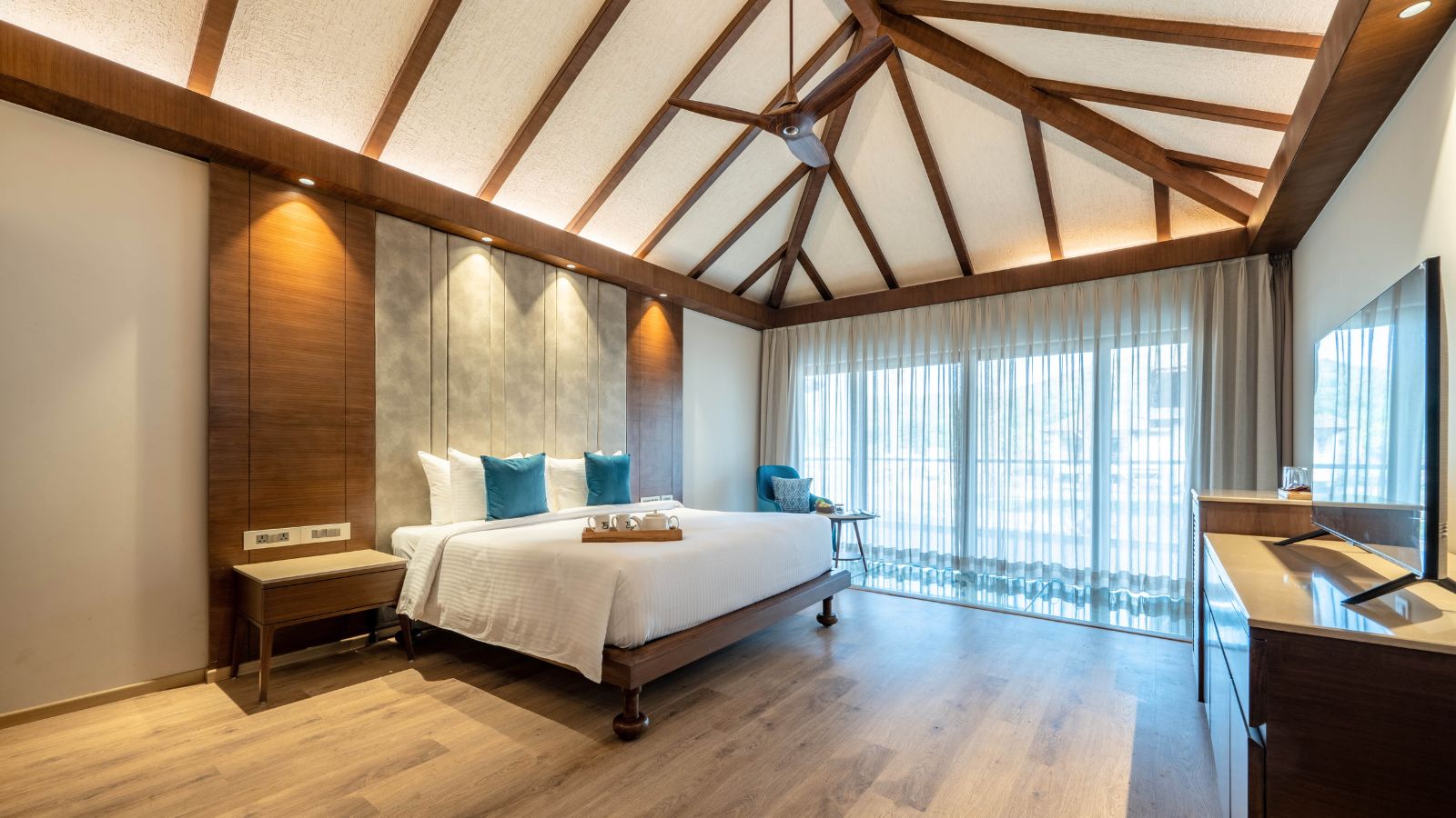 The Lagoon Villas are situated atop a water body. The structure has a classic cottage shape, but it is elevated on pillars to allow the natural landscape to flow seamlessly underneath and around it. This design emphasizes complete harmony with its surrounding environment. From the inside, the villa similarly blurs the boundaries between architecture and nature. sunlight dances on the water below and filters through floor-length windows, filling the space with natural light. Warm, soothing tones are complemented by vibrant blues, reflecting the essence of the namesake element. A partial glass floor reveals the flowing water beneath.