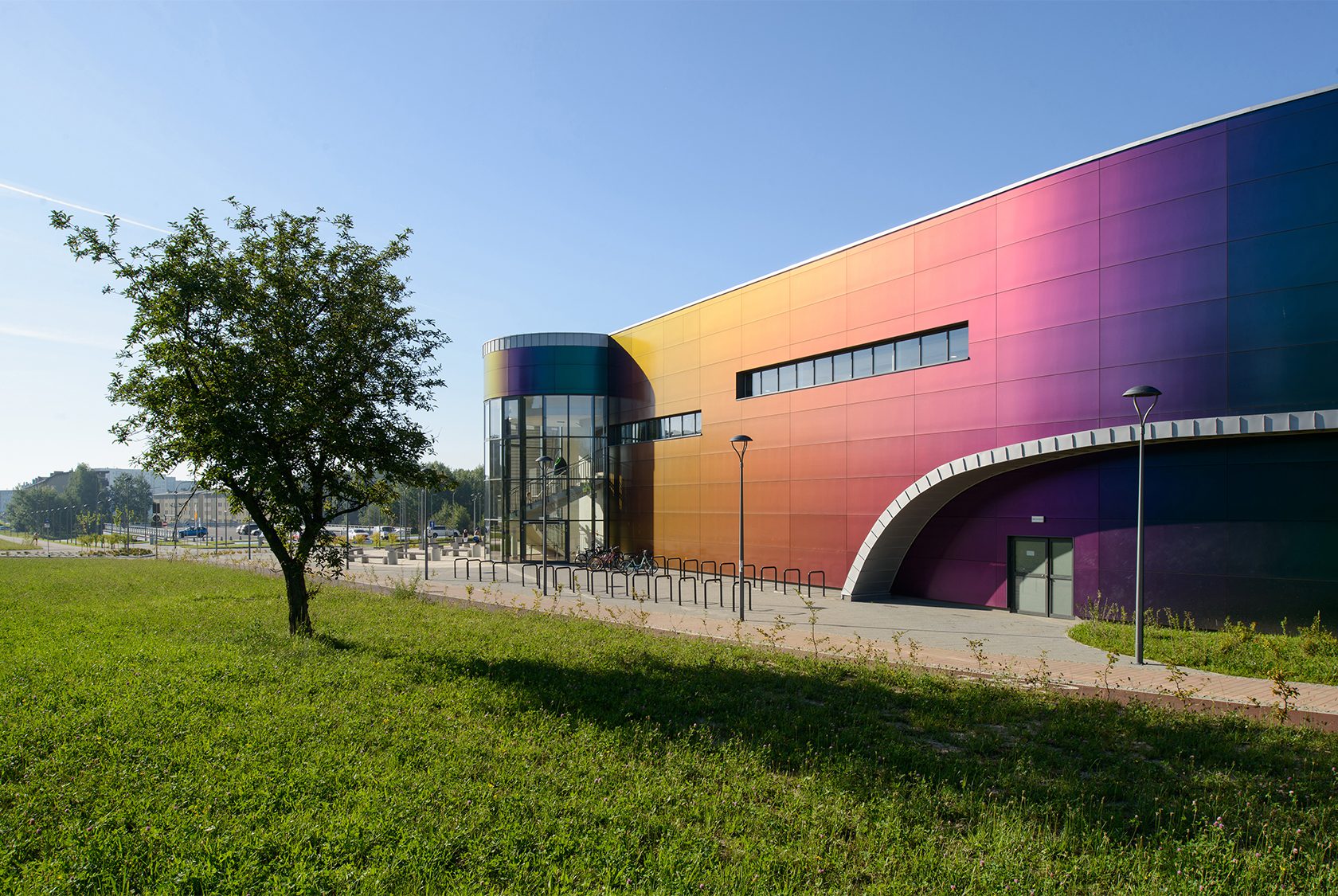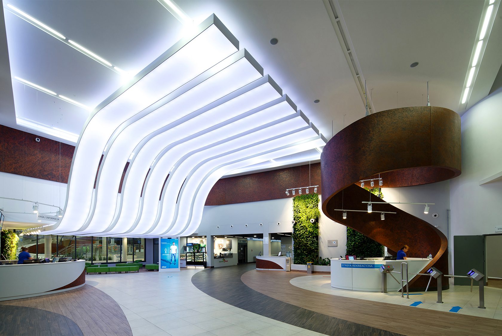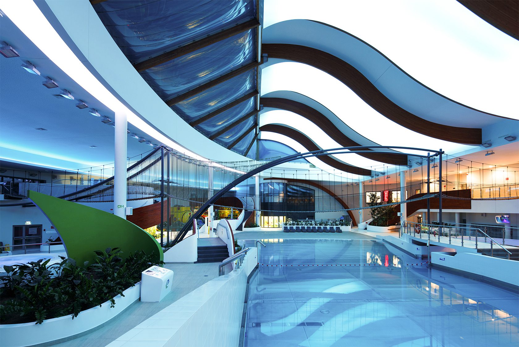 Wodny Park Tychy is not just a technical feat. It’s a cultural and architectural manifesto. Located between residential neighborhoods and a natural forest, it becomes a bridge between nature and urban life – a place of leisure, learning, and healing. The architecture draws inspiration from the tranquil surface of nearby Paprocany Lake. Curved, organic forms reflect the movement of water. The façade, composed of shimmering materials, evokes sunlight playing on lake ripples, creating a vibrant visual dialogue with its environment.