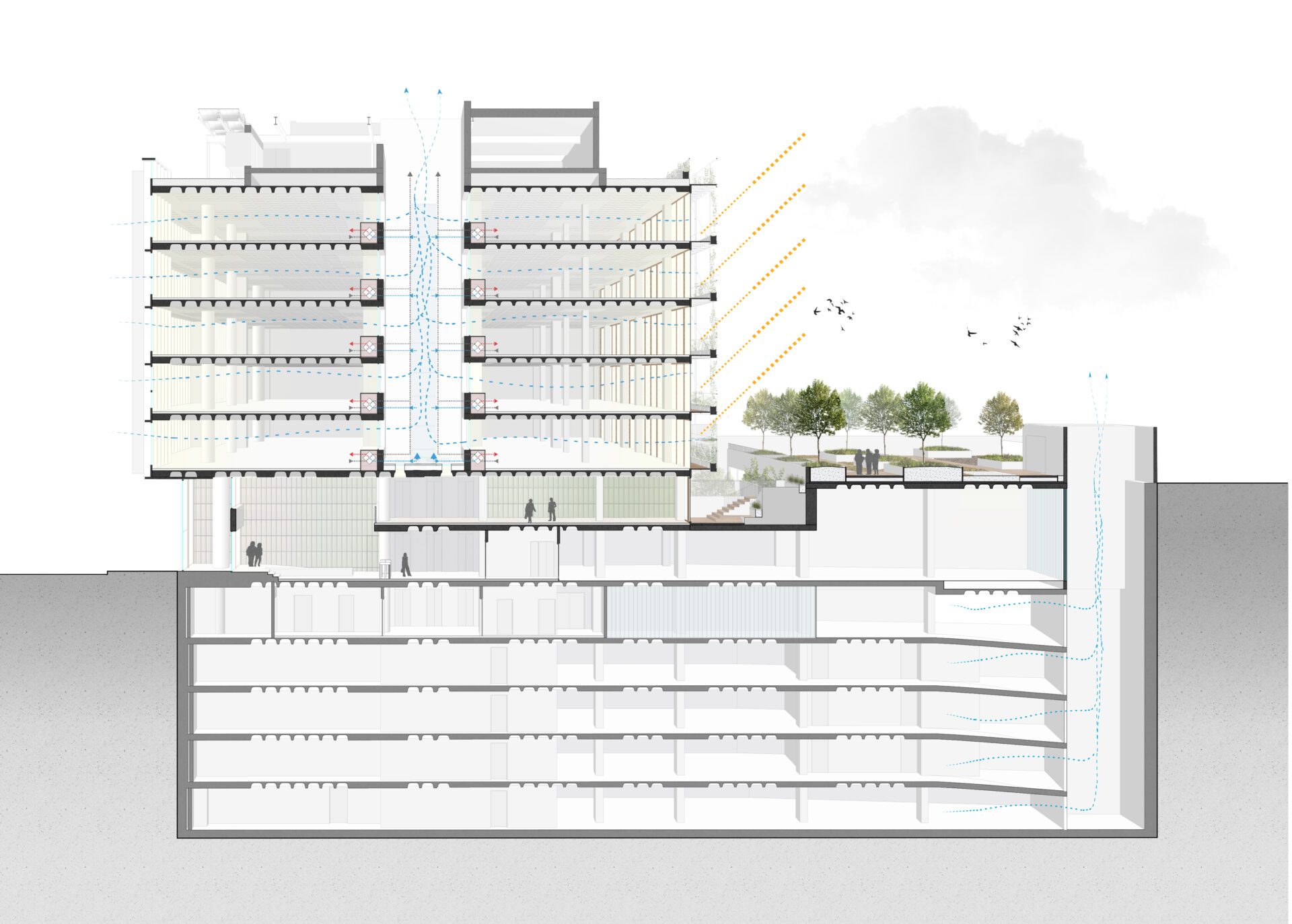 The building’s reimagined envelope enhances its relationship with the surrounding streetscape, integrating seamlessly with its environment. This thoughtful approach to blending architecture and landscape promotes sustainability and urban livability, aligning with modern standards of regenerative design.