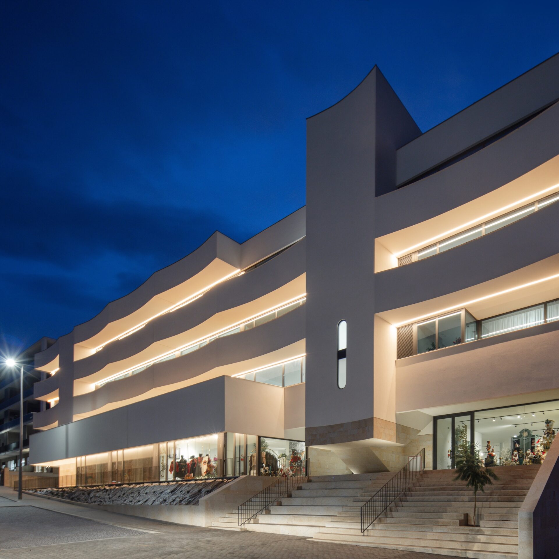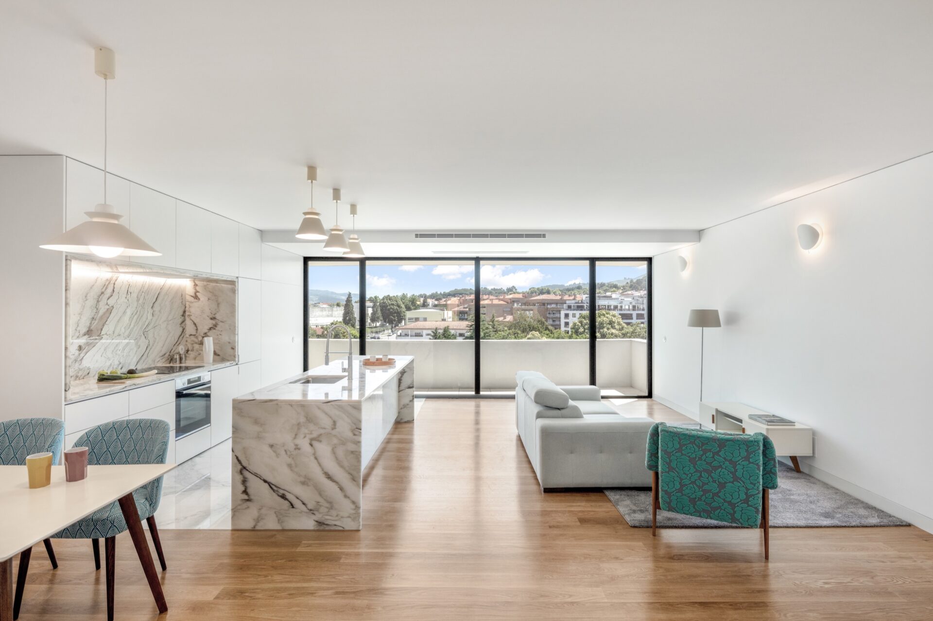 The interior spaces feature simple geometries for efficient use, with finishes in local materials, including oak, chestnut, and Estremoz marble in wet areas. Projecting balconies and recessed glazing provide a near-continuous glass façade, optimizing views while ensuring privacy and controlling solar gains.