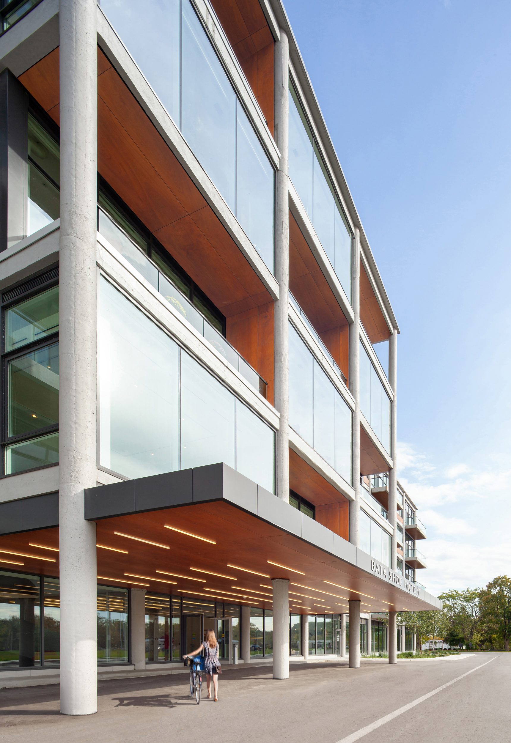 The late Sonja Bata pursued her passion for architecture and the built environment through the revitalization of the town of Batawa, located 175 km east of Toronto on the Trent river. As a sustainable community and satellite town adapted to 21st century living, where residents could live close to nature but maintain a connection to work through high-speed broadband, she envisioned Batawa as a model community for social and environmental sustainability. Central to Bata’s vision for the town was the conversion of the manufacturing facility built by her family’s shoe empire, who relocated to Canada at the beginning of World War II. Located at the gateway to the town, the conversion of the former factory into a mixed-use residential, commercial and community building was an ambitious adaptive re-use project with a light environmental footprint and a strong social mandate.