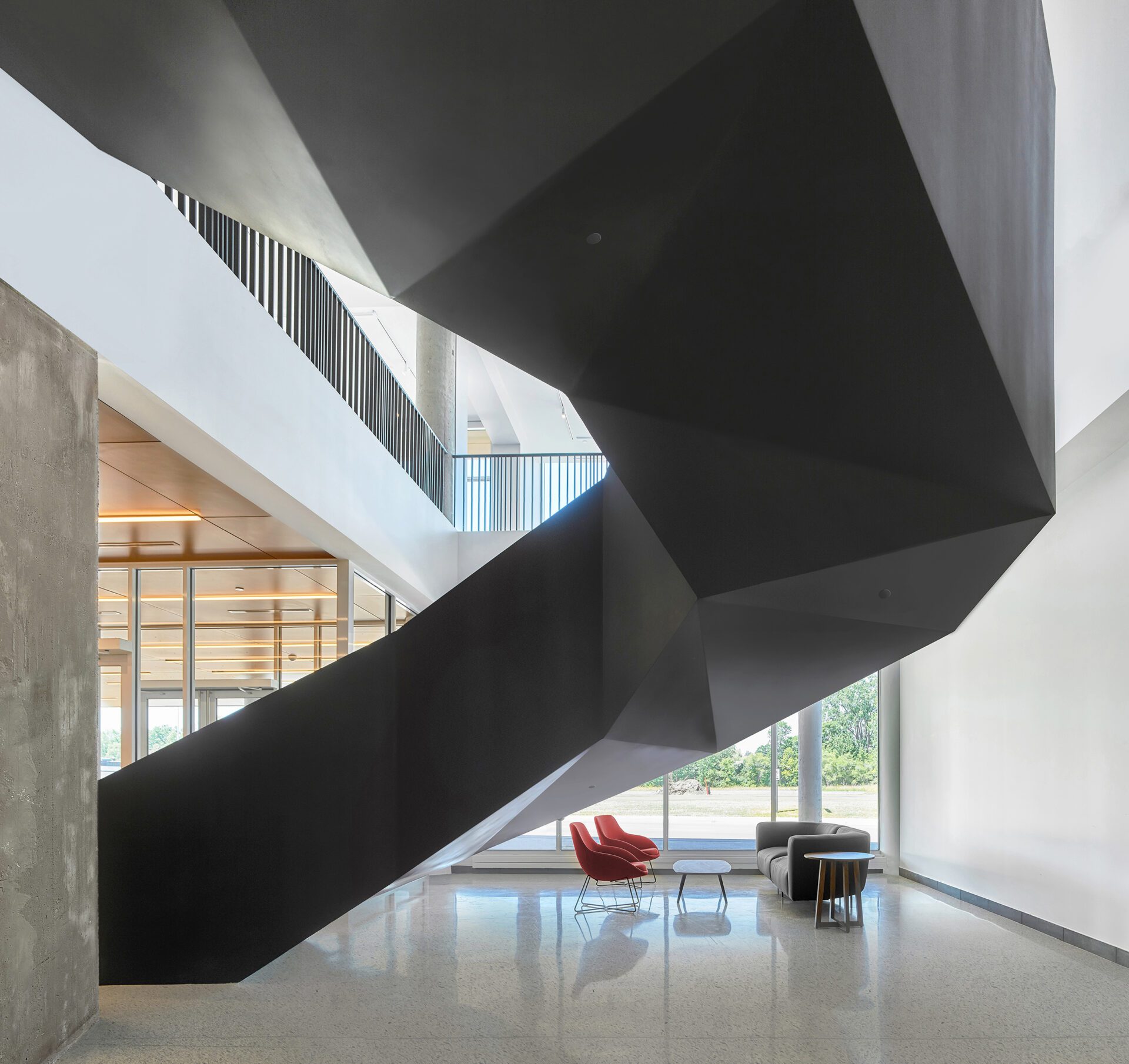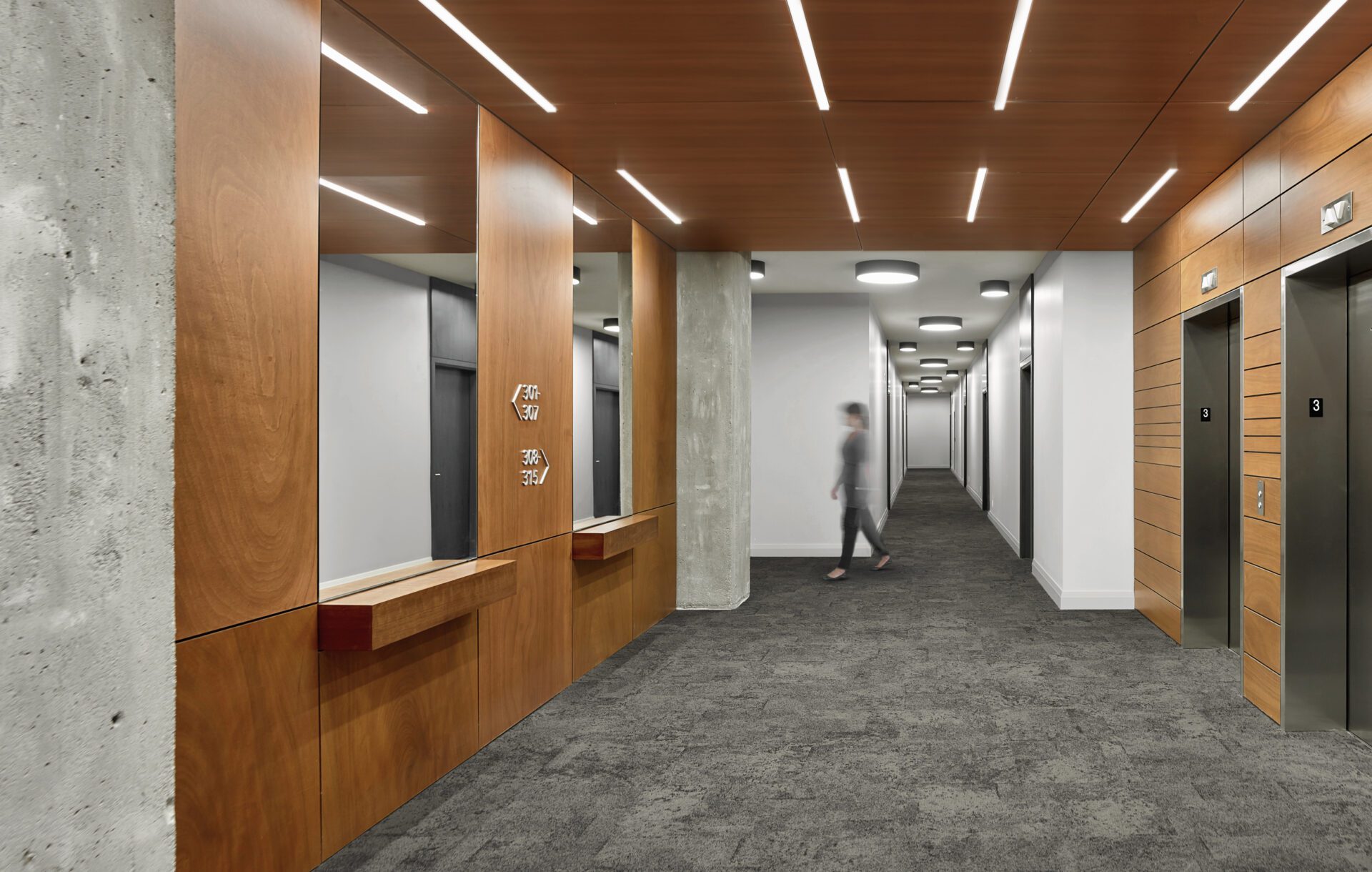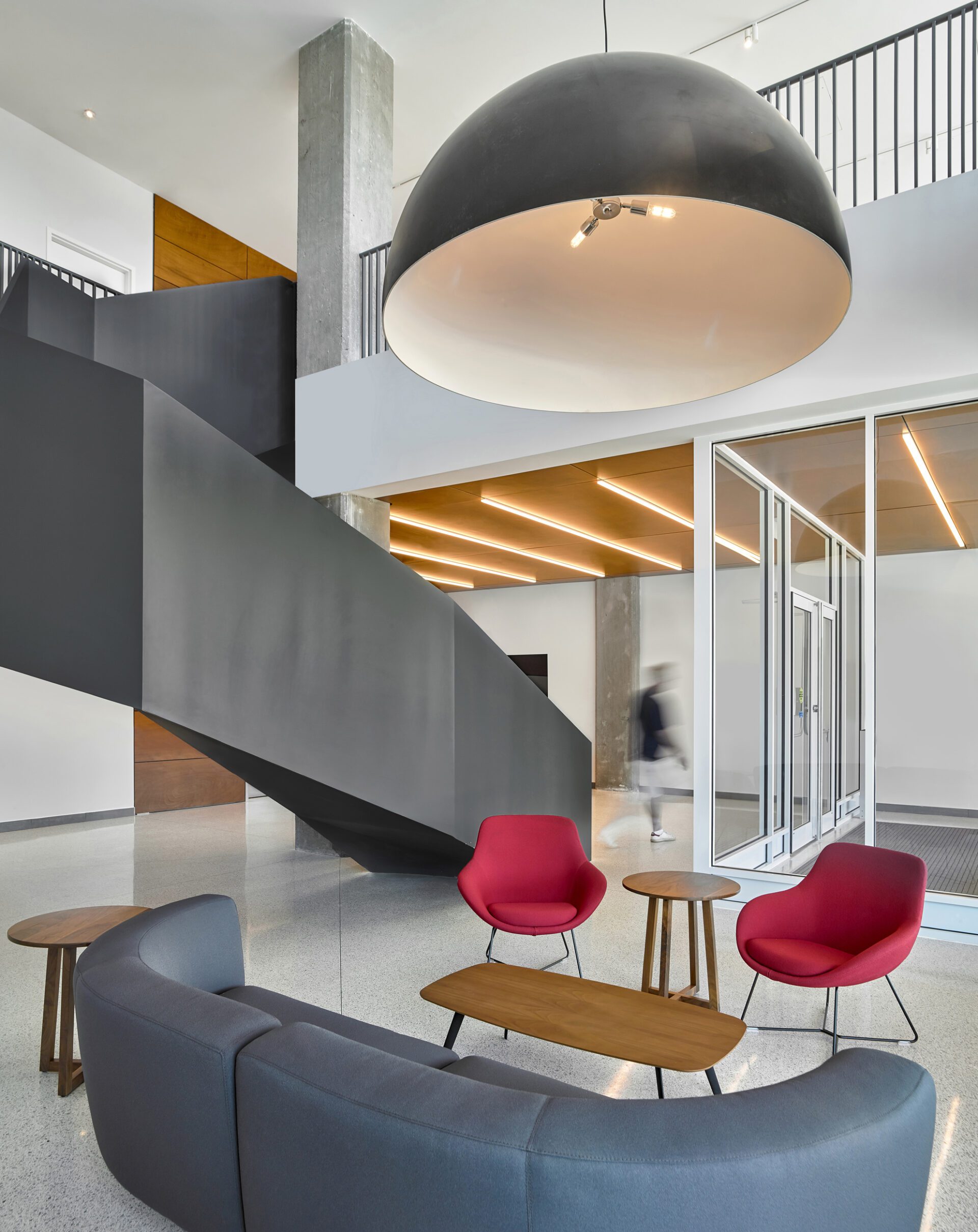 On the main level, new terrazzo flooring in the public spaces and on the stair treads speaks to the vintage of the building and ensures durability for a high-traffic area. The lobby features a double-height space with a faceted sculptural steel staircase that wraps around an exposed concrete column, highlighting it in place as a homage to the original factory structure. The geometric shape of the stair instills a sense of strength and permanence in a building that has been given a second life. An oversized light fixture floats over the lobby sitting area comprised of furniture from primarily local fabricators and suppliers. The interior material palette is rich in colour and warmth. Extending from the entrance canopy to the lobby ceiling to the upper floor elevator lobbies, wood panels connect the various spaces together. On the upper residential levels, the unique lighting layout in the elevator lobbies and corridor ceilings provide a focal point to divert the occupant’s eye from the long double-loaded corridor.
