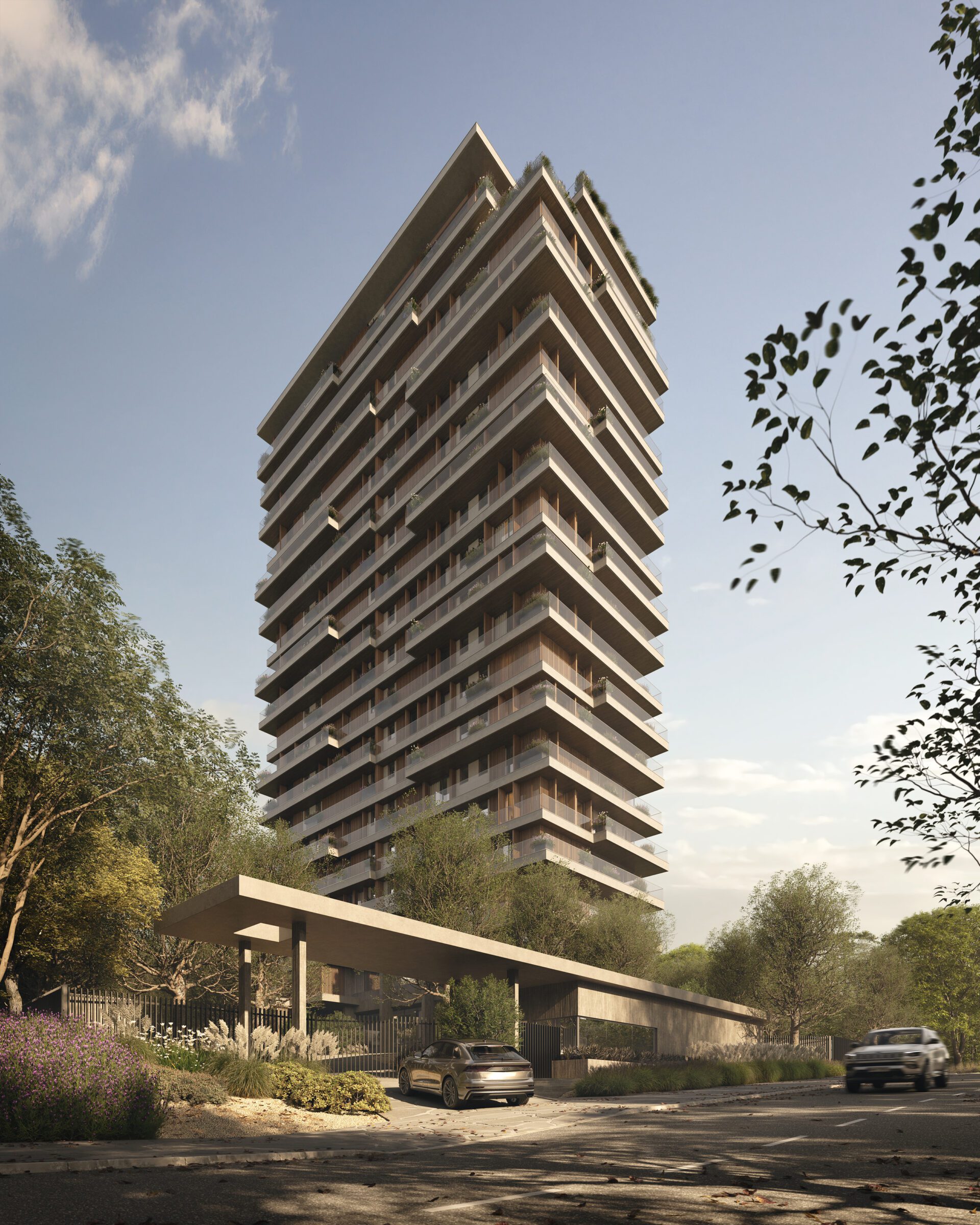 On the ground floor, common areas are carefully positioned to preserve existing plant species and engage in harmonious dialogue with the vegetation. Access to the building is through an internal courtyard that functions as a transitional space, an arrival sequence that softens the passage from city to home. An open-air pool invites residents to immerse themselves in nature. The project was conceived to foster a seamless integration between built form and natural landscape. It is tailored for a living terrain.